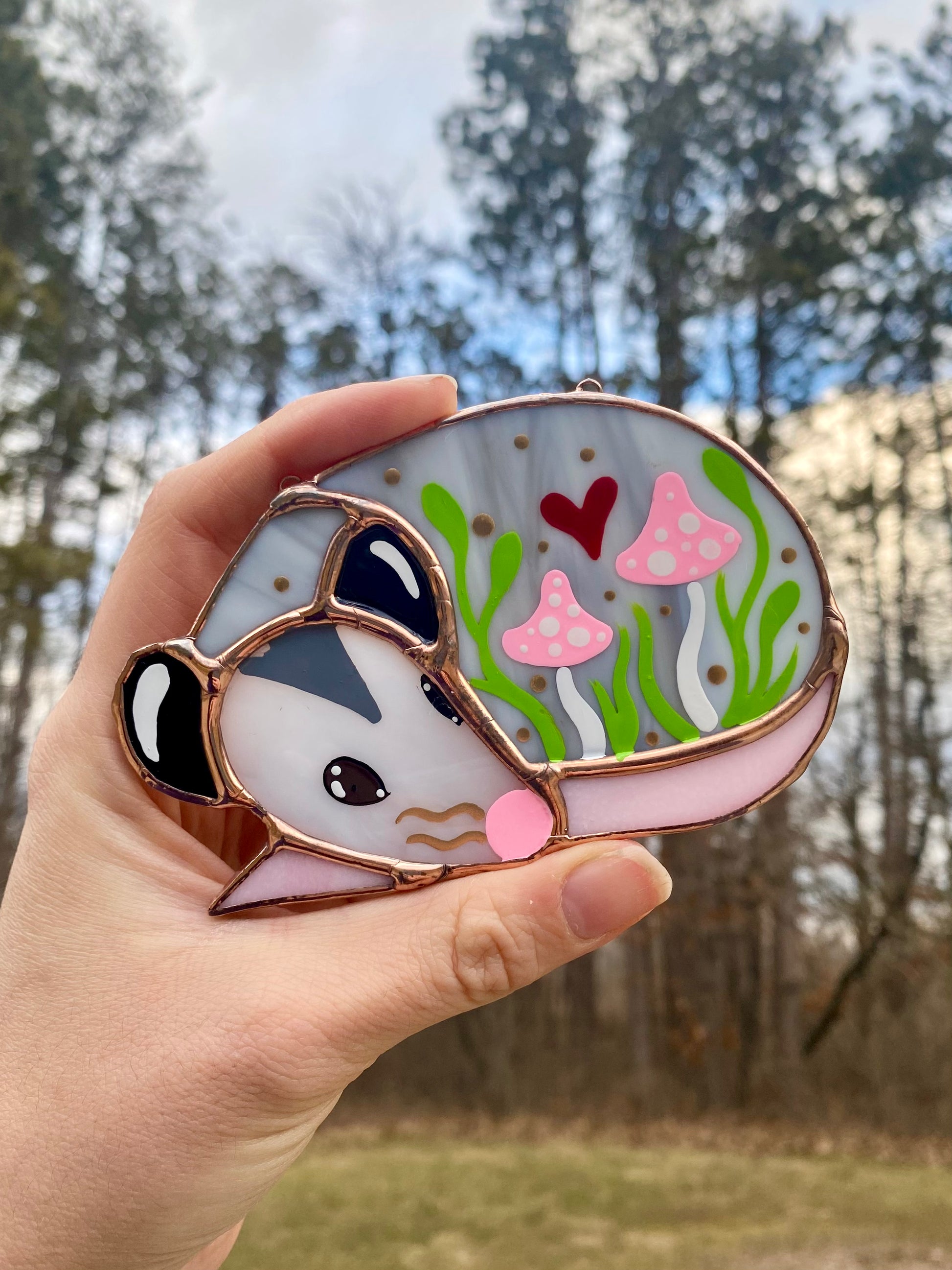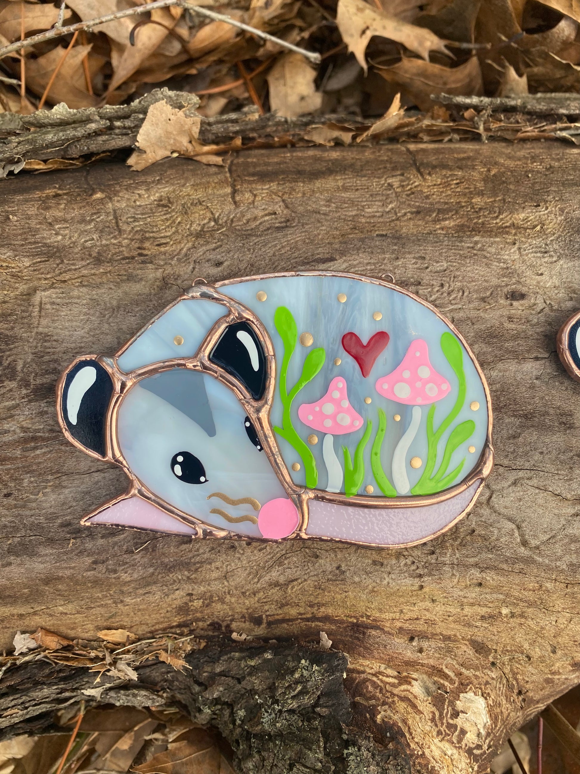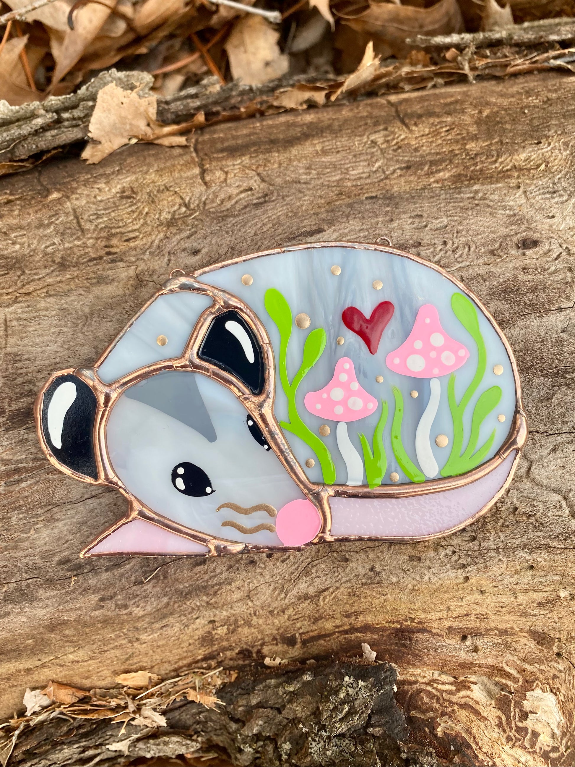 Mini Pink (ver 2) Valentine Sleepy Opossum Stained Glass Suncatcher