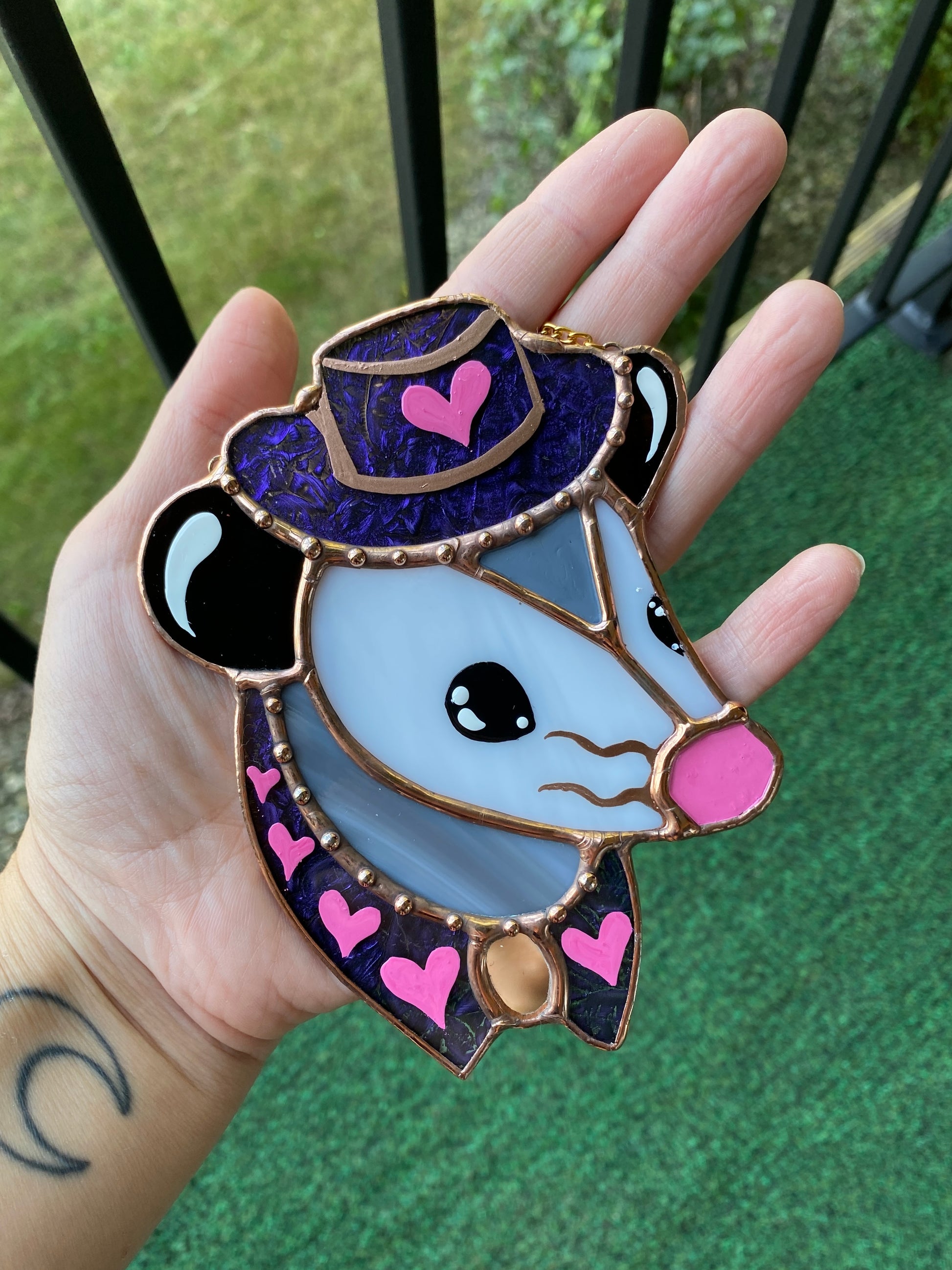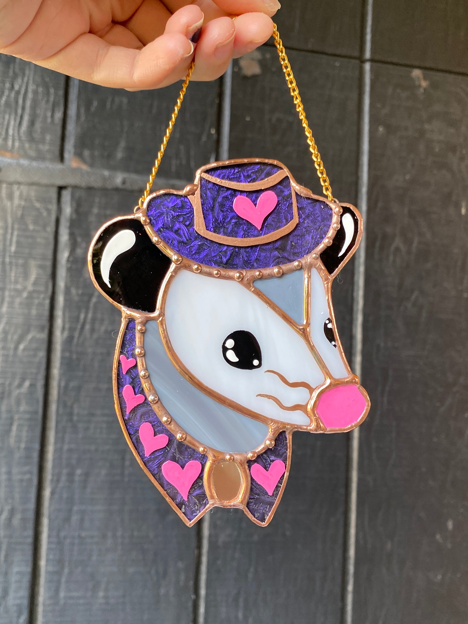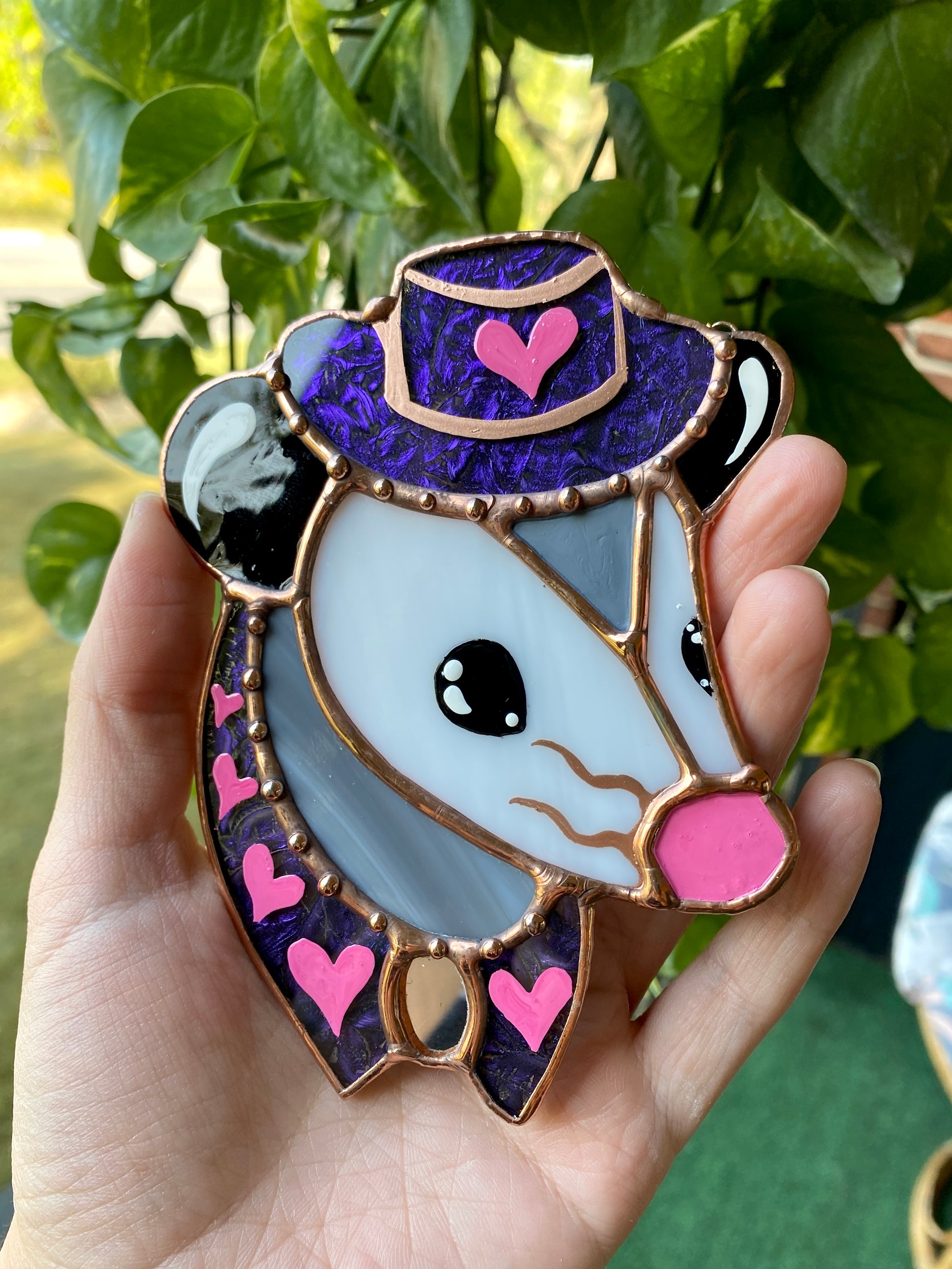 Mini Purple Cowboy Opossum Stained Glass Suncatcher