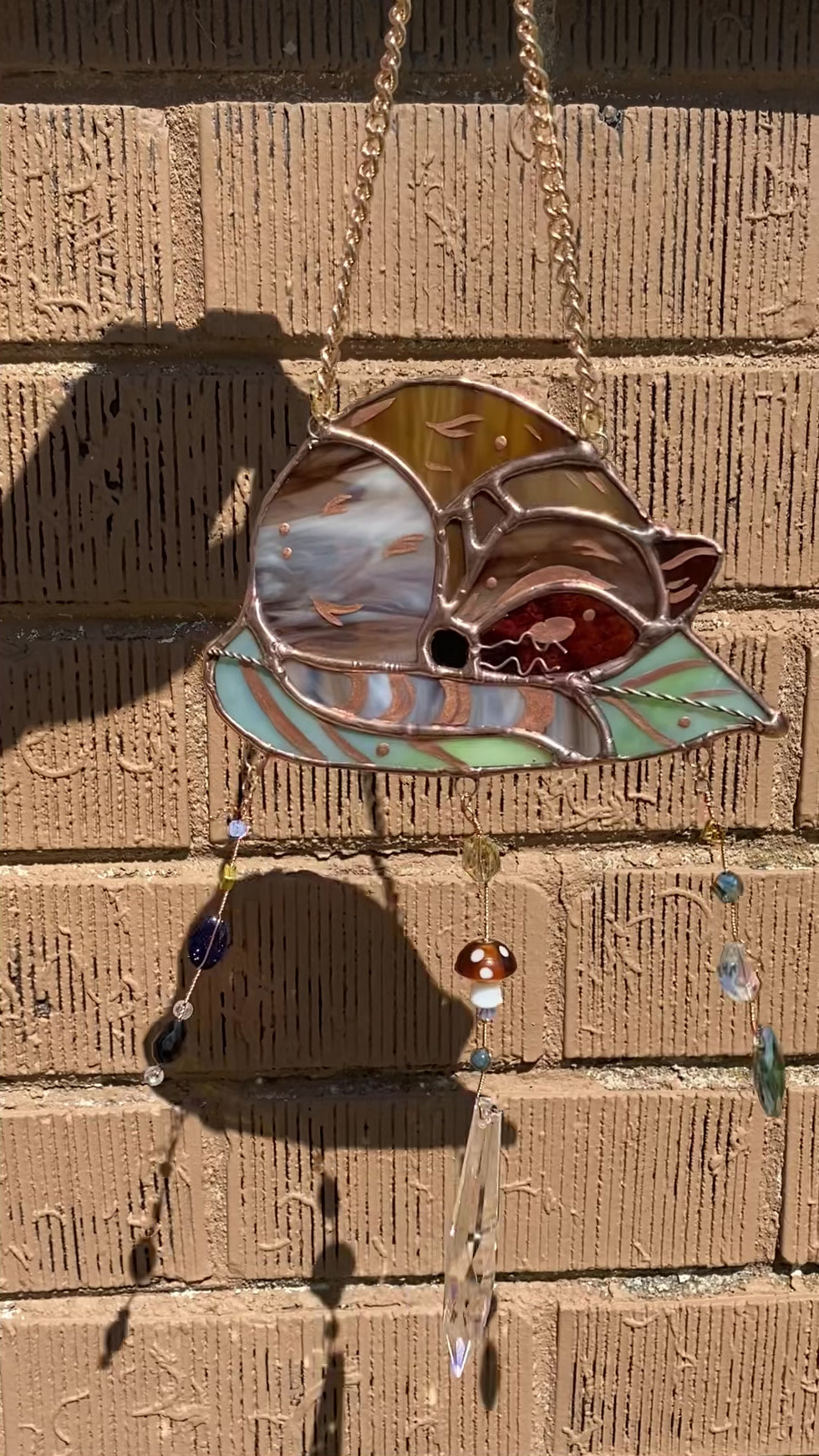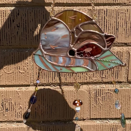 Mini stained stained glass raccoon with glass suncatcher beads and beaded details.