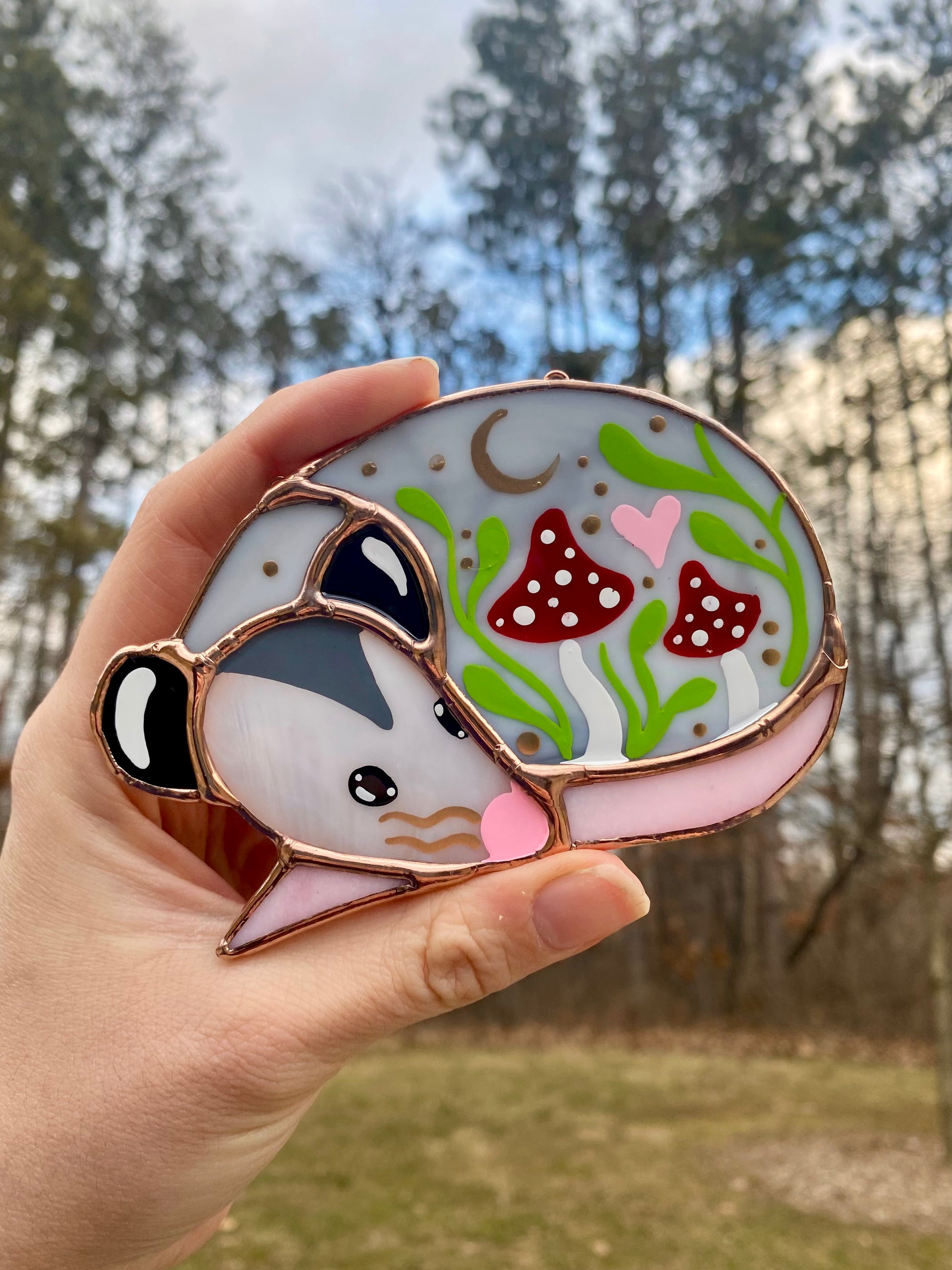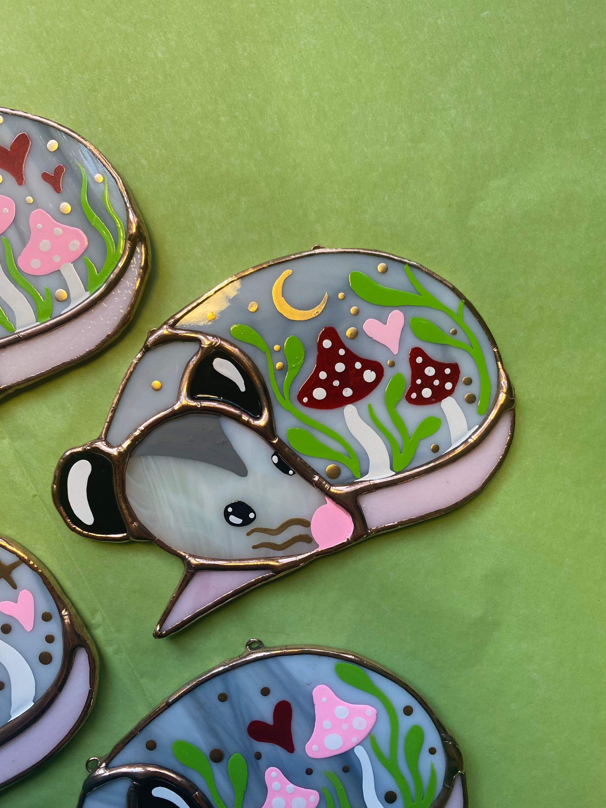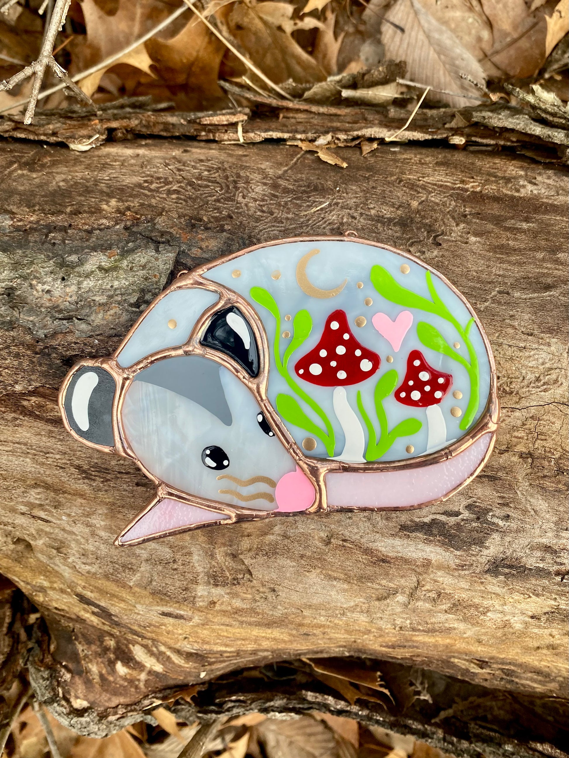 Mini Red (ver 1) Valentine Sleepy Opossum Stained Glass Suncatcher