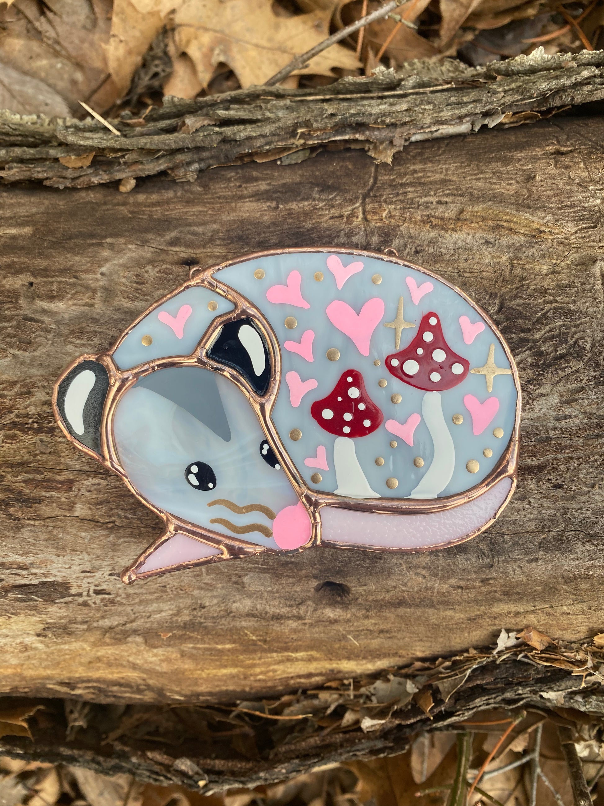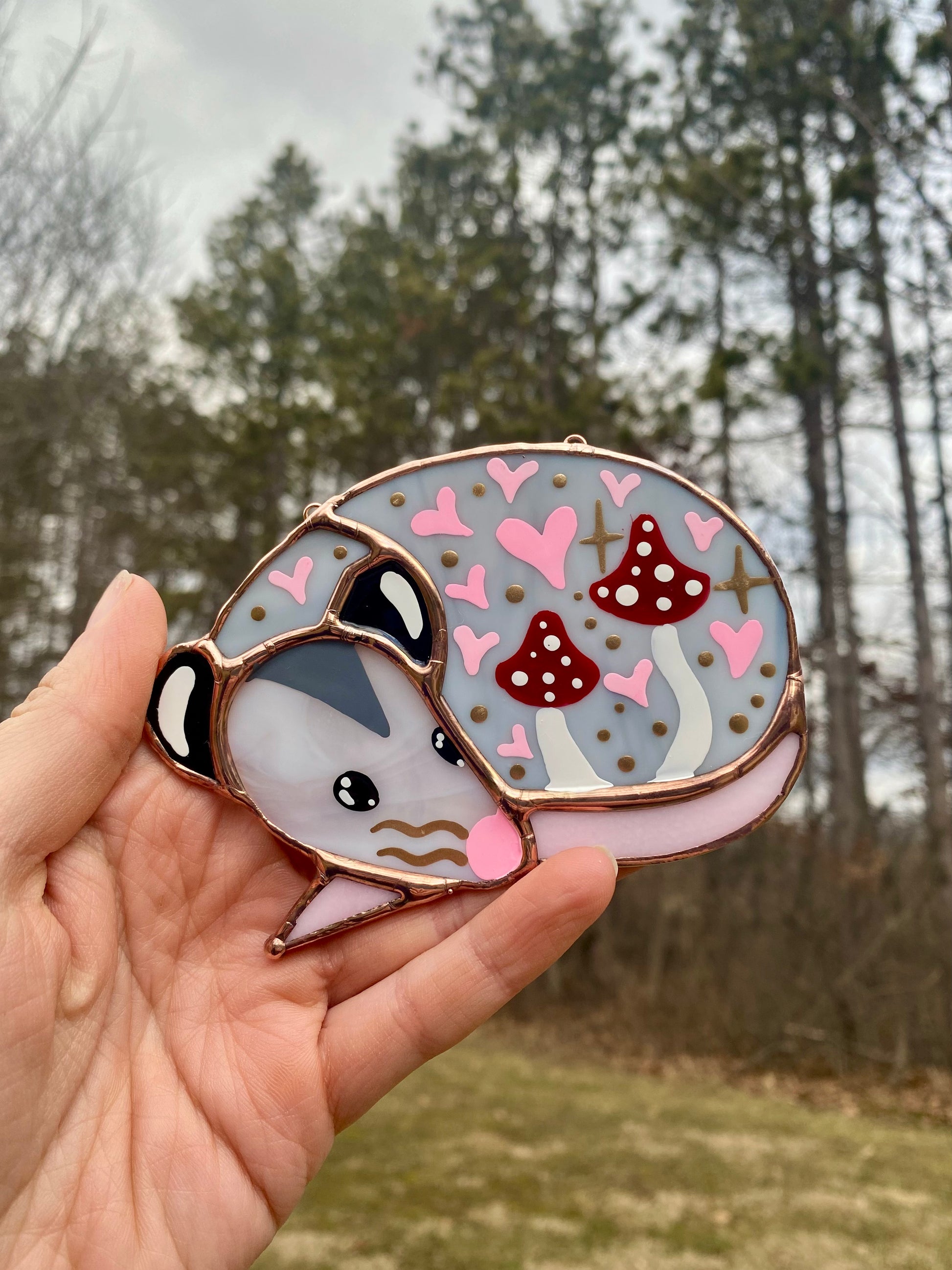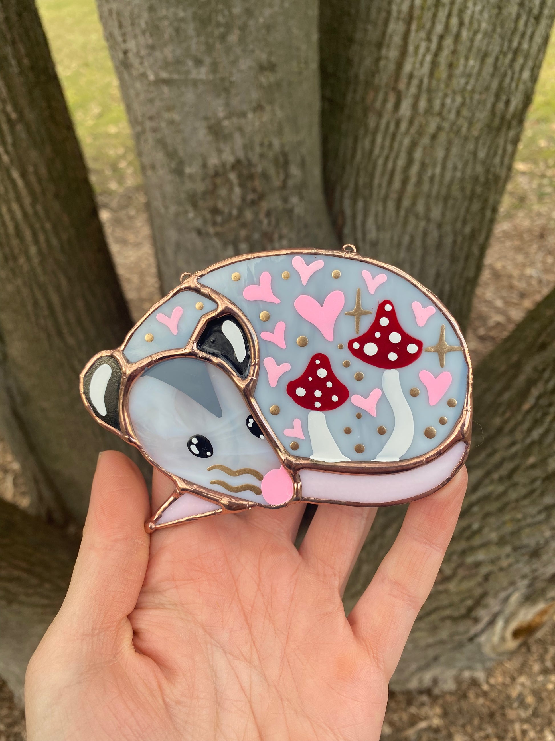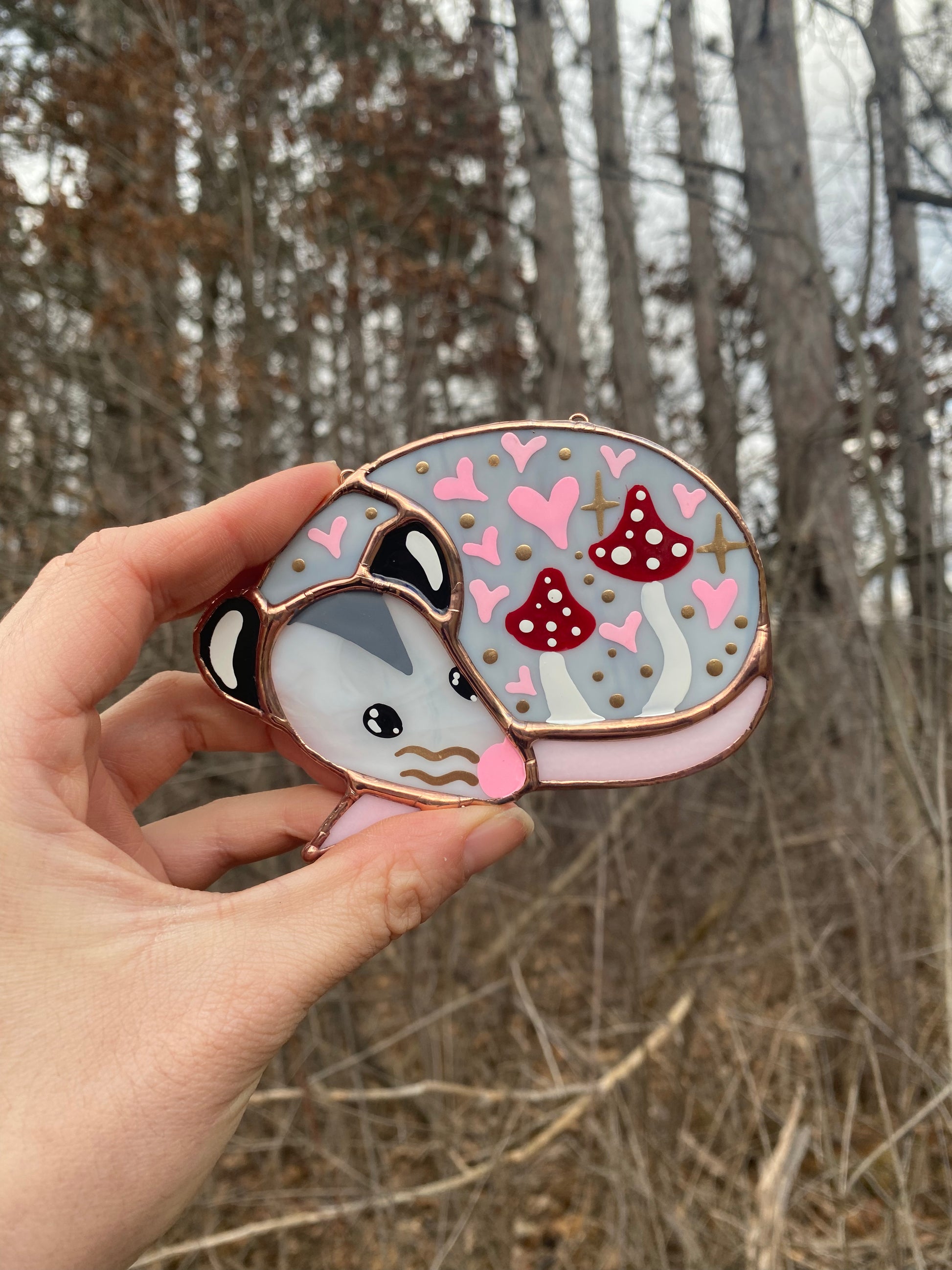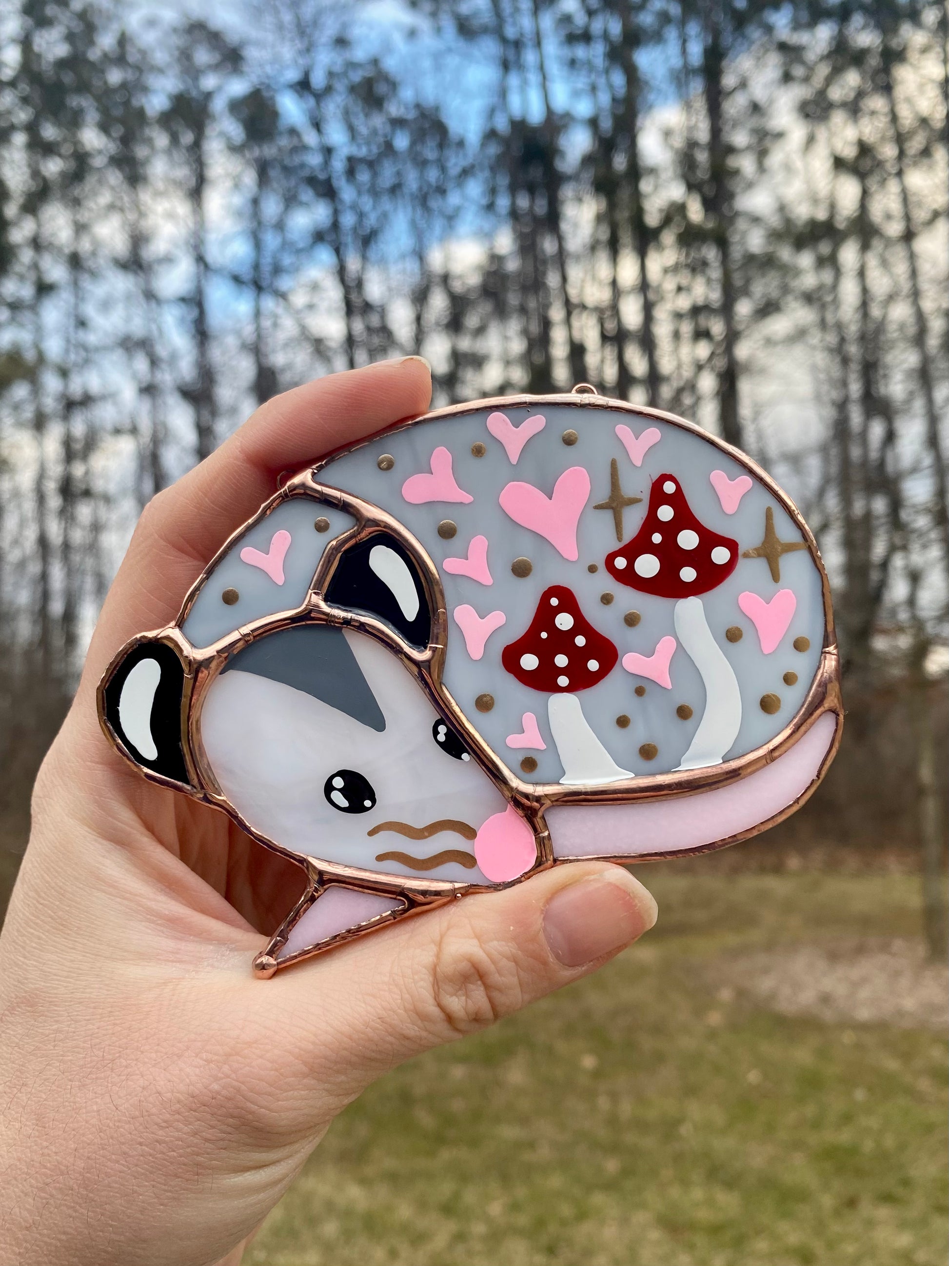 Mini Red (ver 2) Valentine Sleepy Opossum Stained Glass Suncatcher