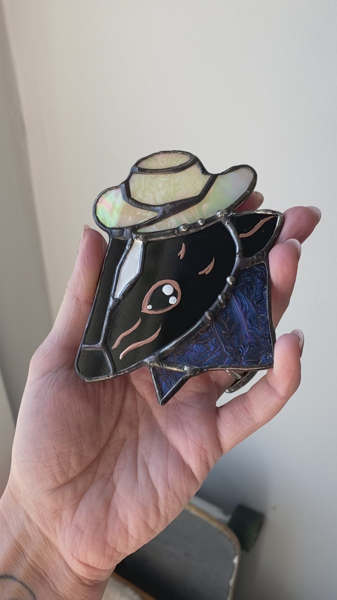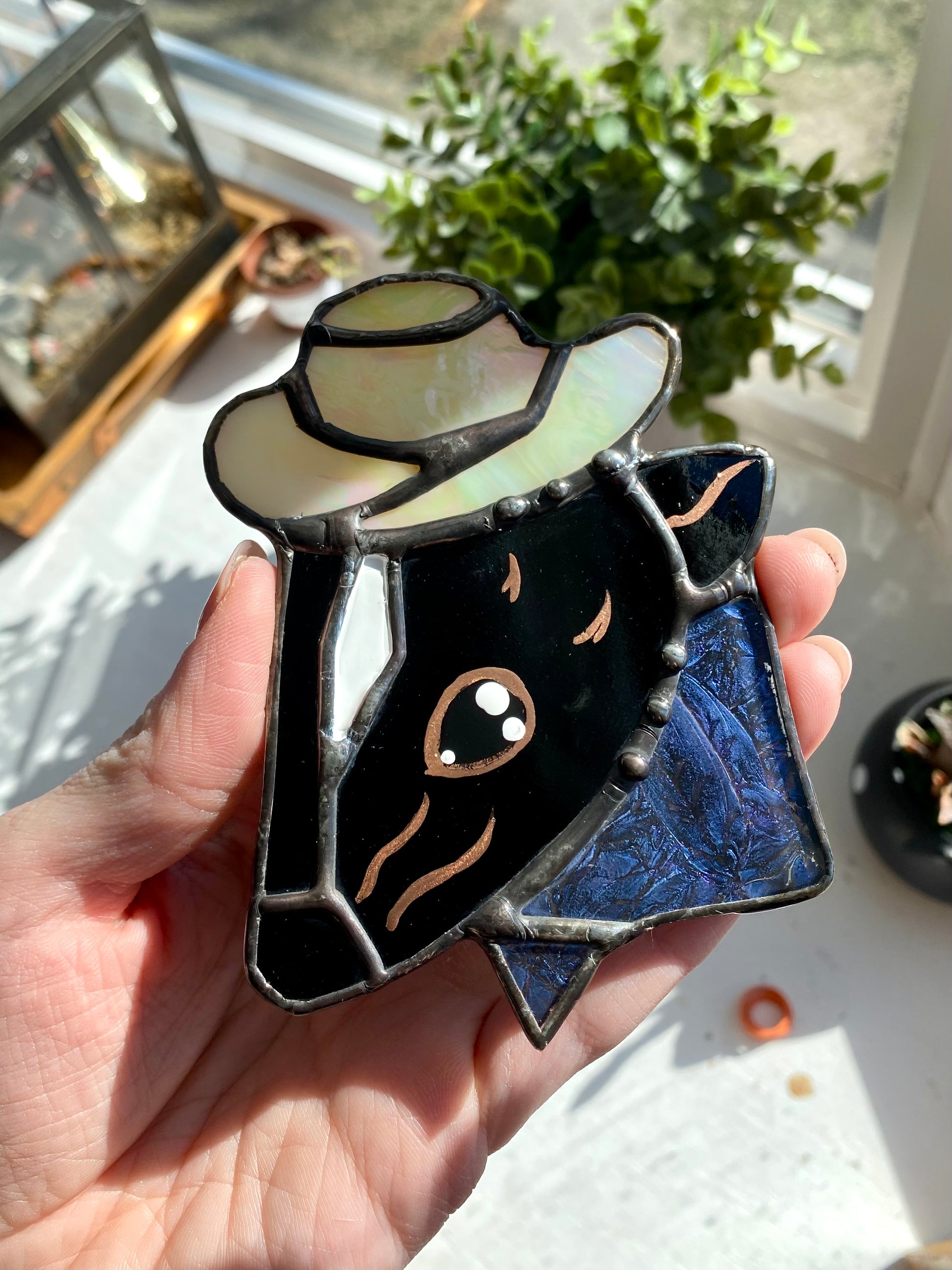 One of one! Measures 4.5” tall and 3.5” wide. Has a brass chain and comes with a suction cup to hang ‘em up!