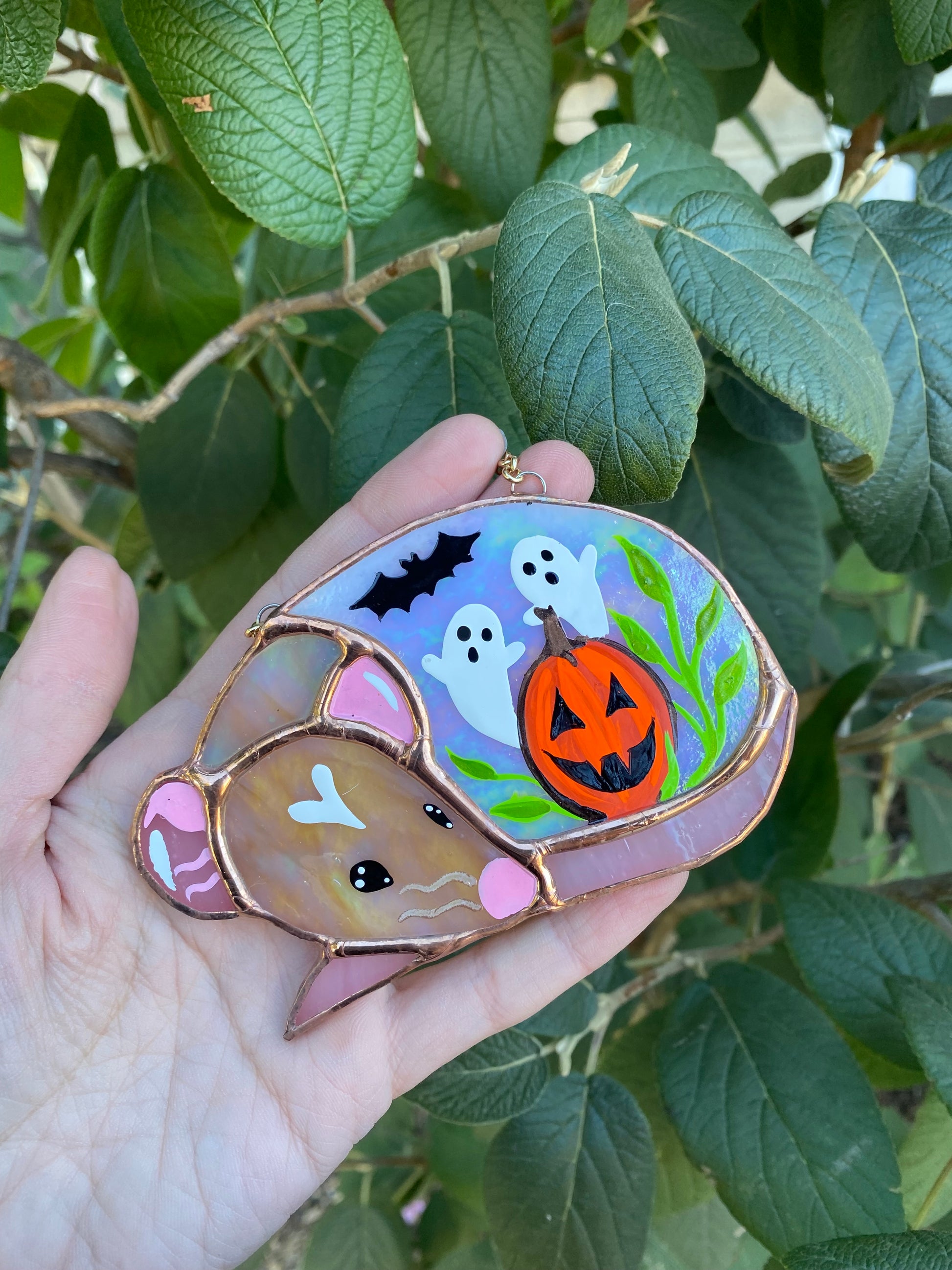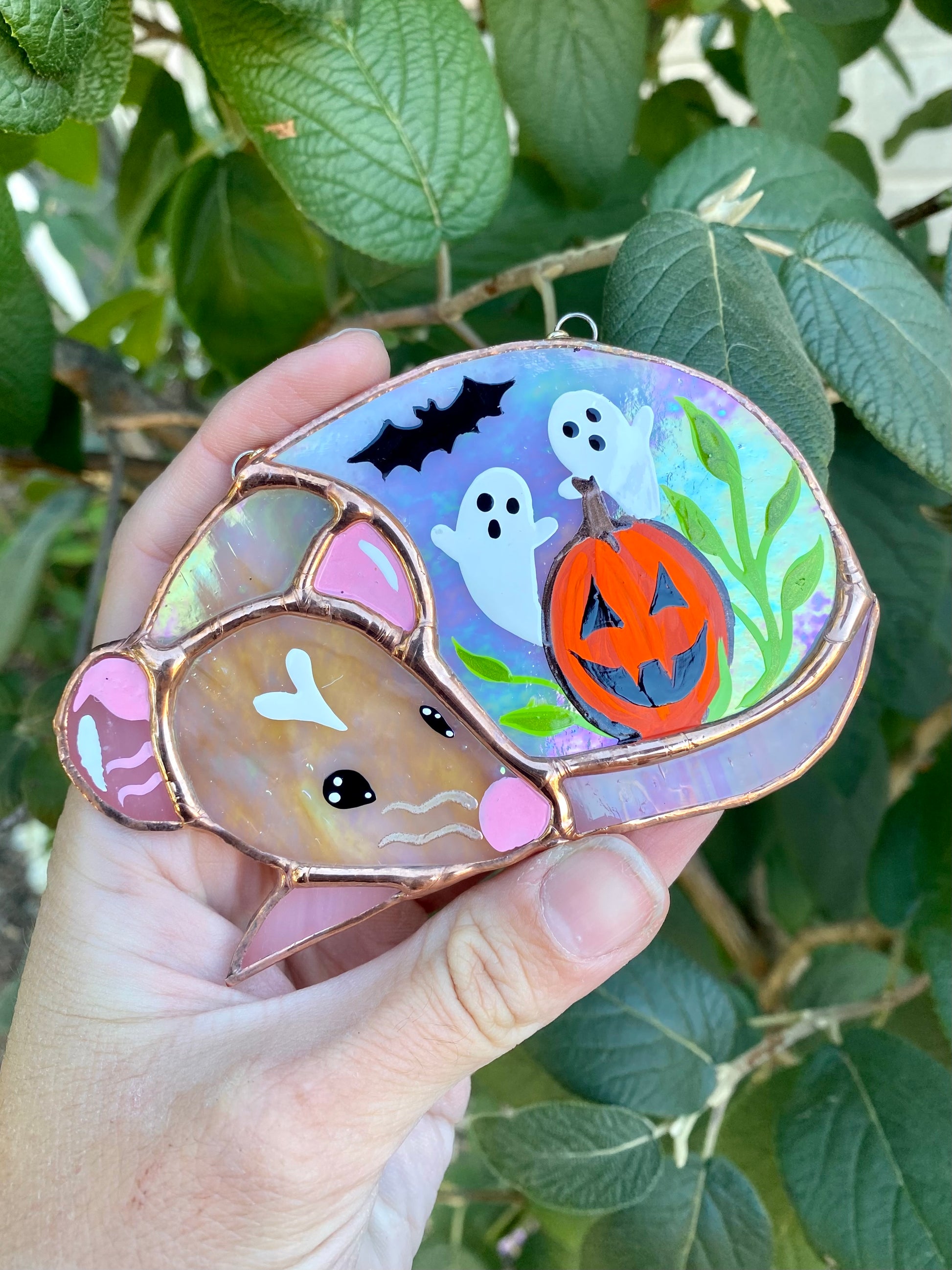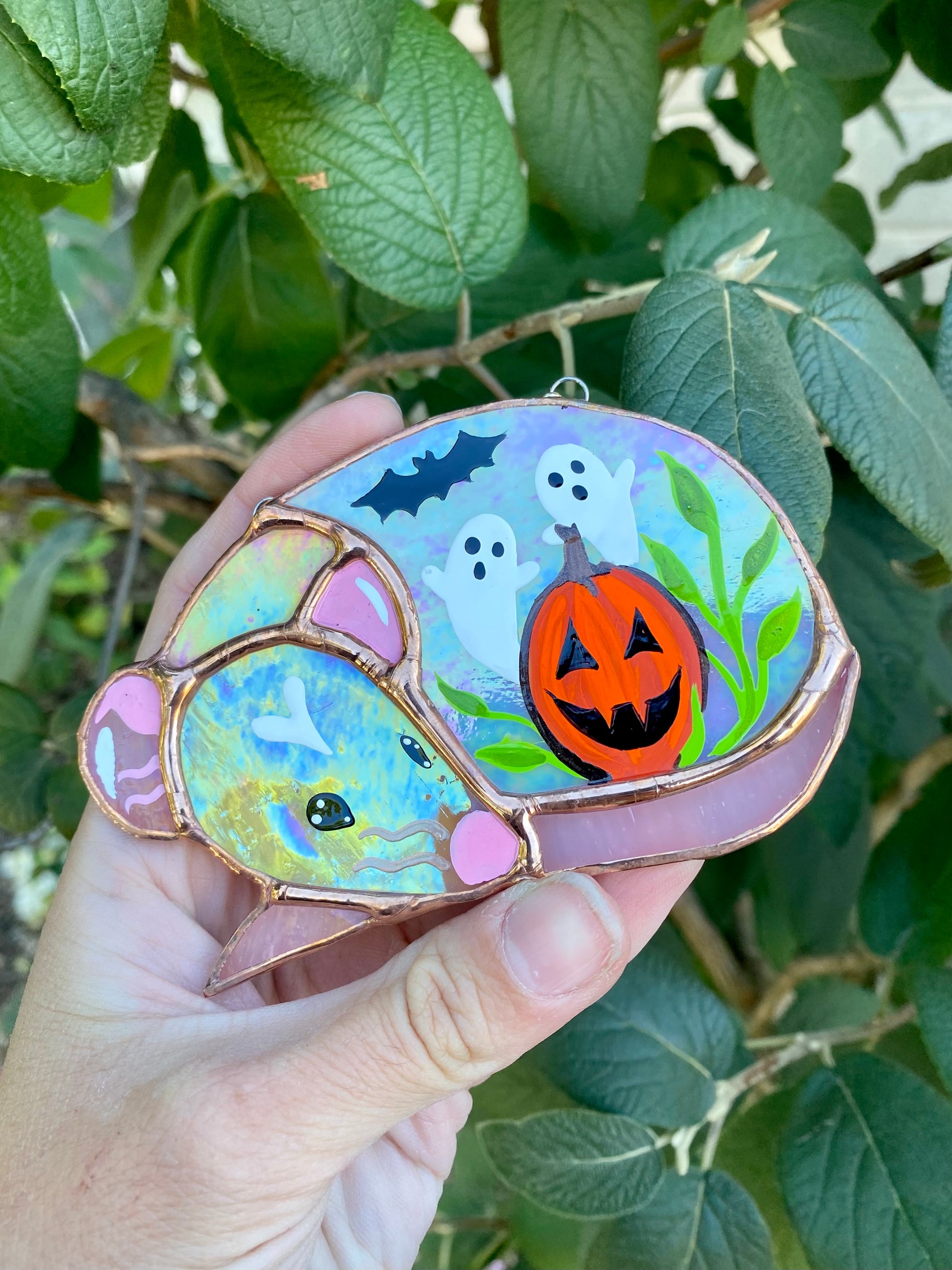 Mini Tan Iridescent Hooded Rat with Pumpkin Stained Glass Suncatcher
