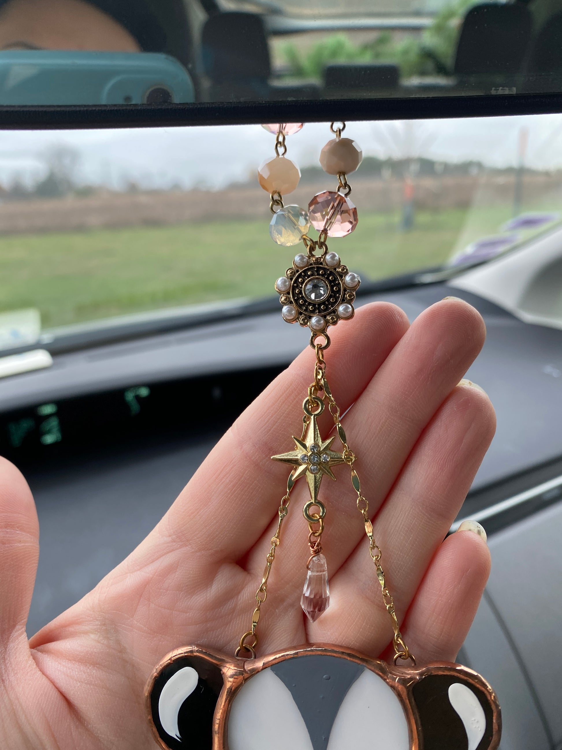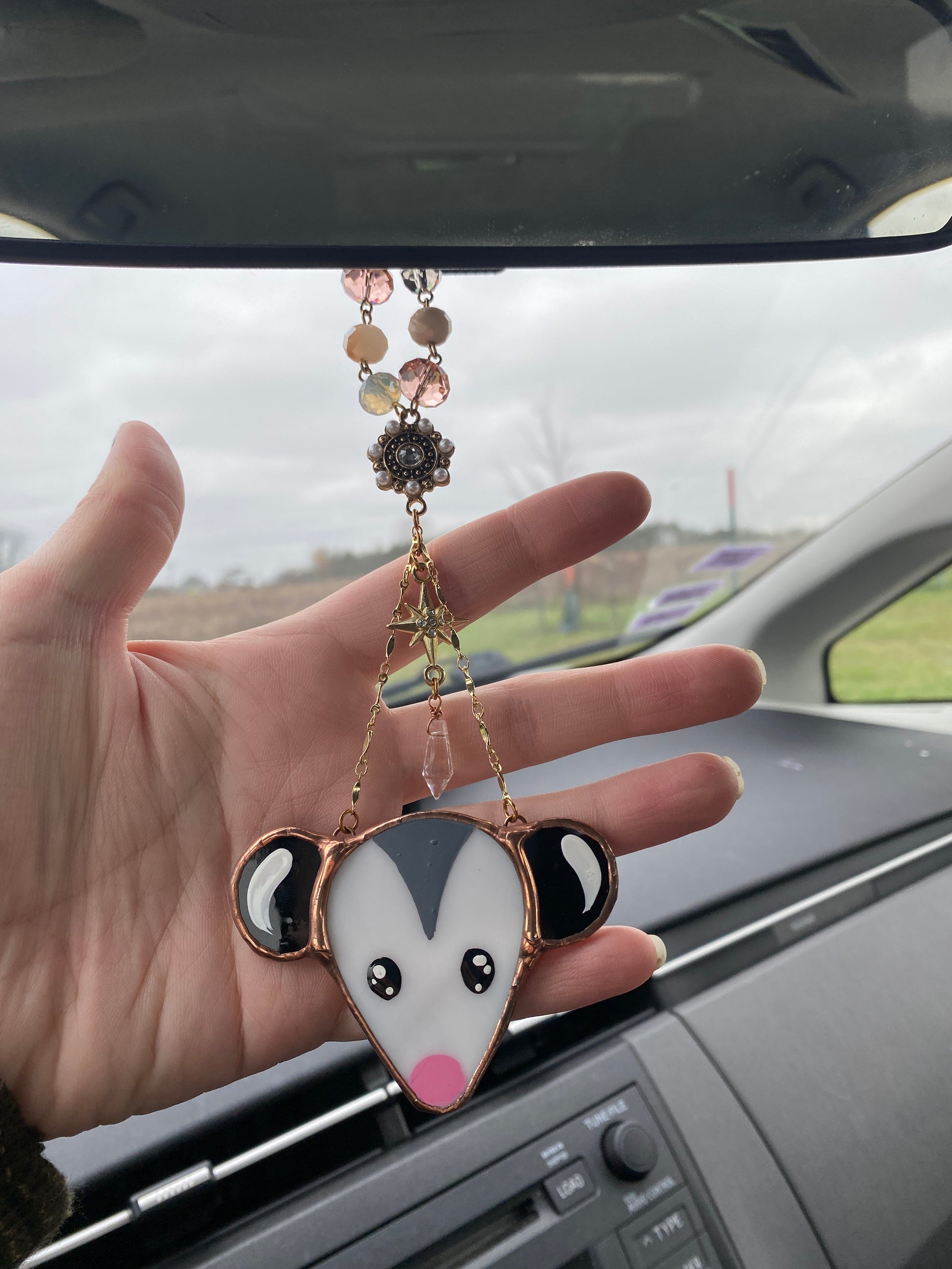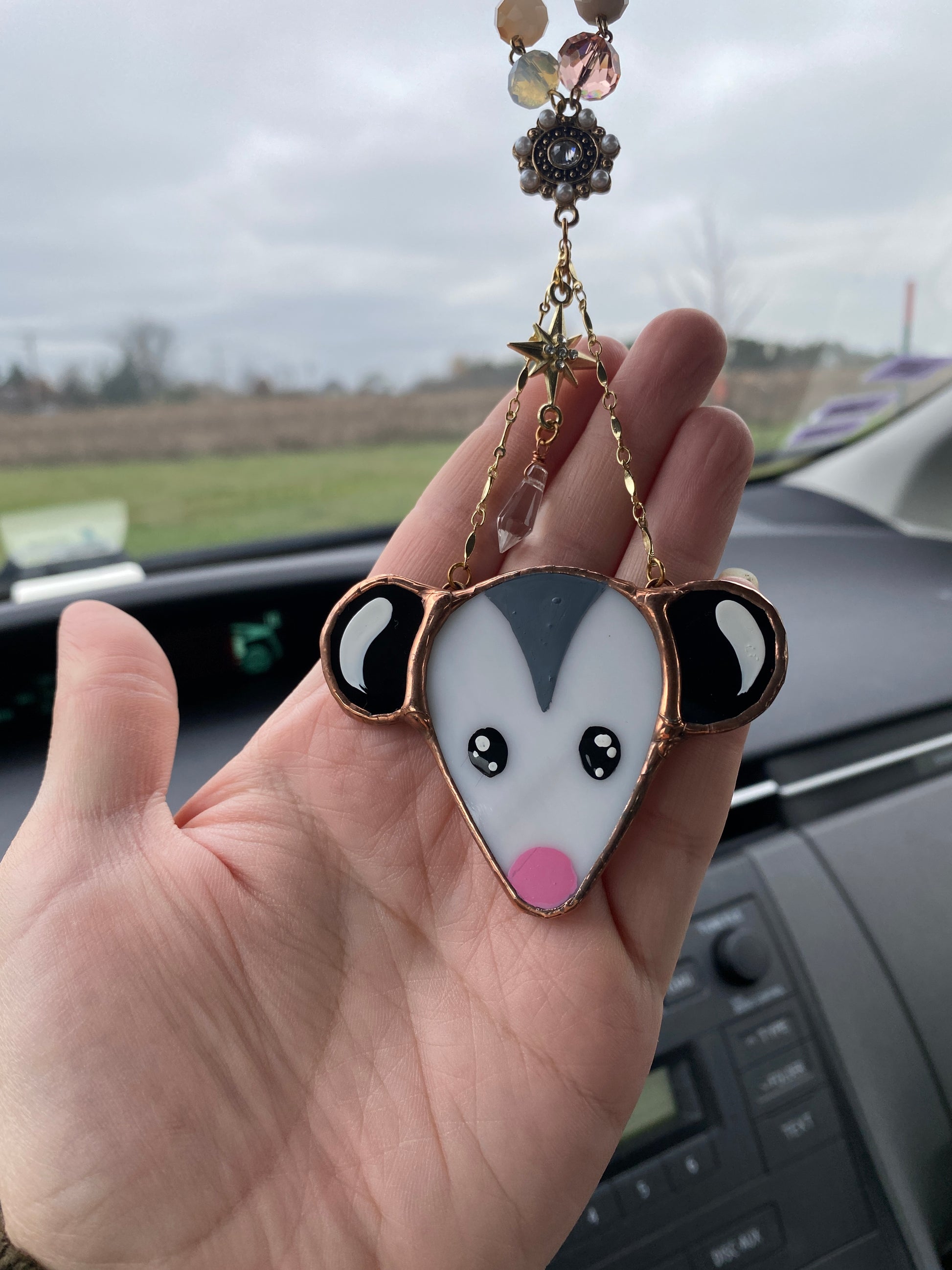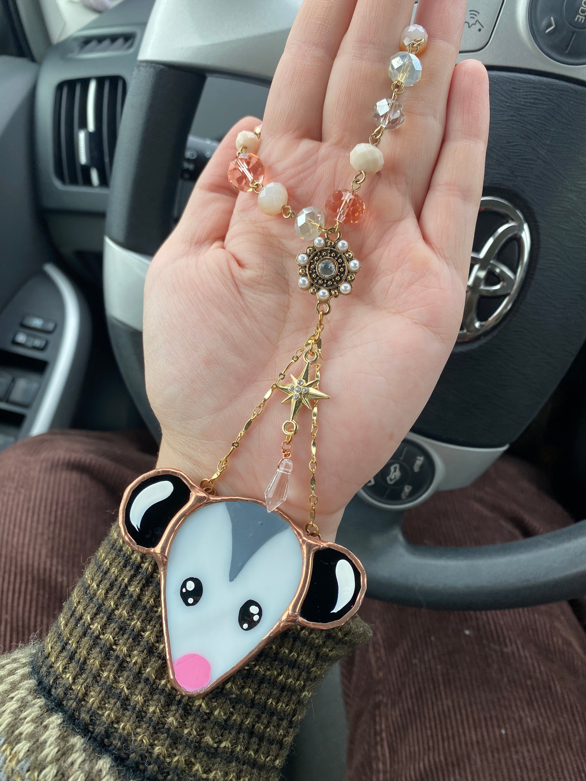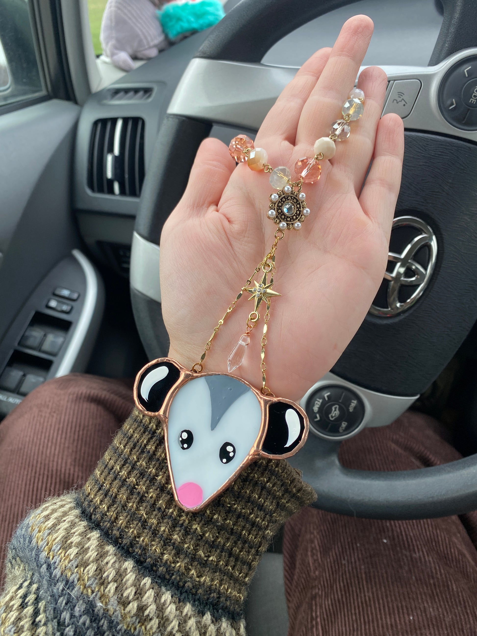 Opossum measures 2.73” by 2.3”. Total length of 8.5”. Comes on a gold beaded suncatcher chain with clasp.