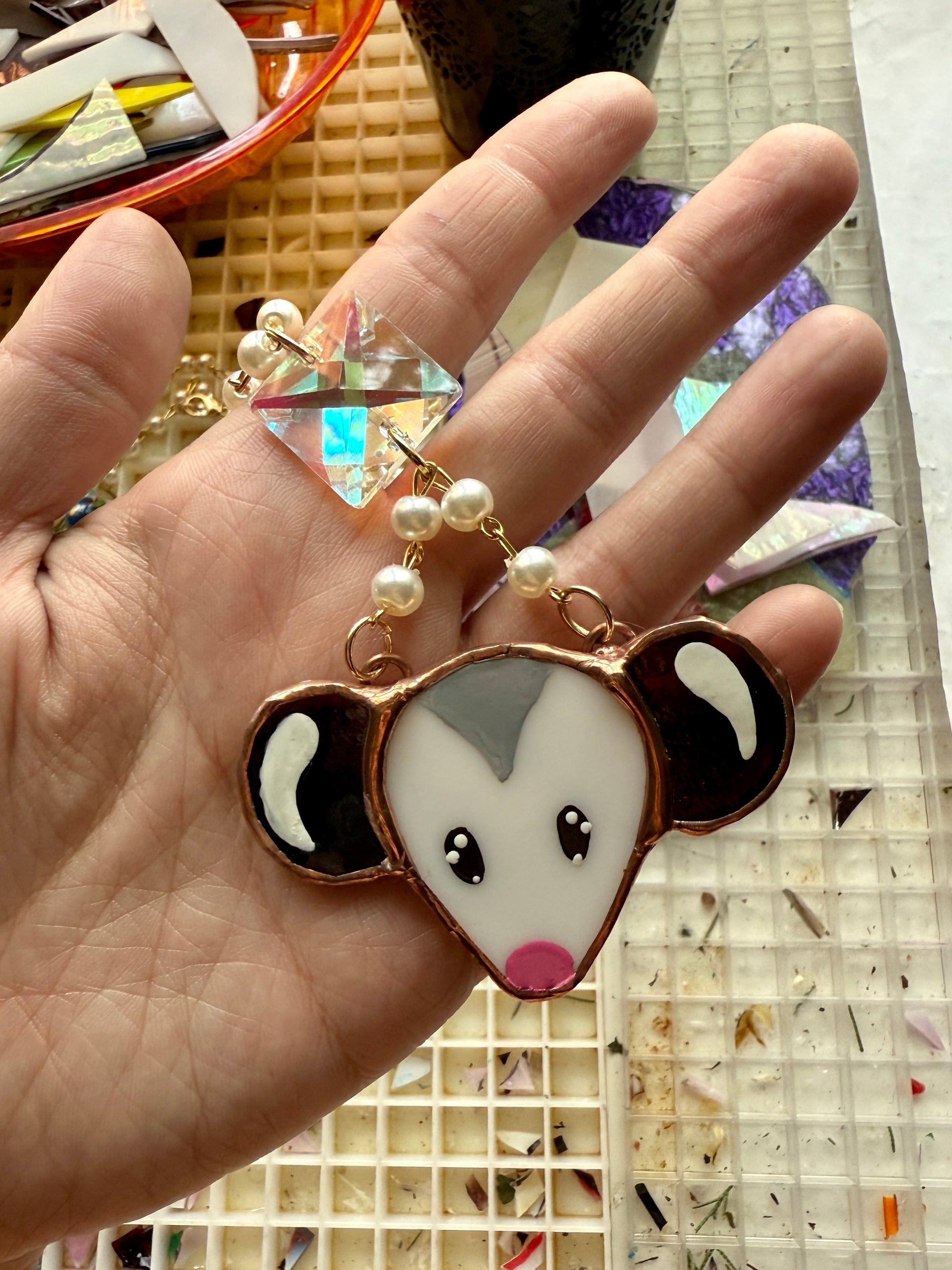 Pearl and Jewel Opossum Stained Glass Charm