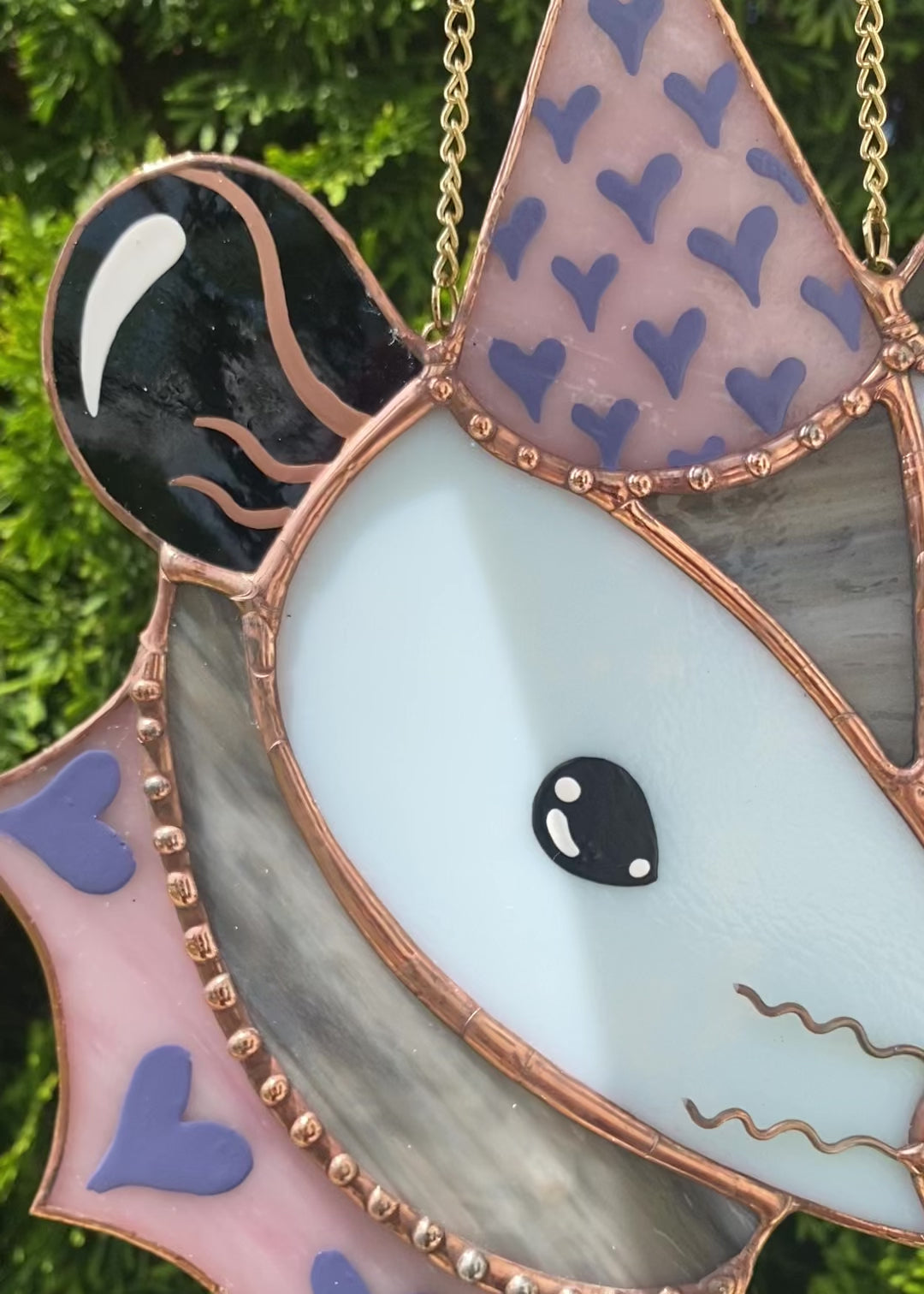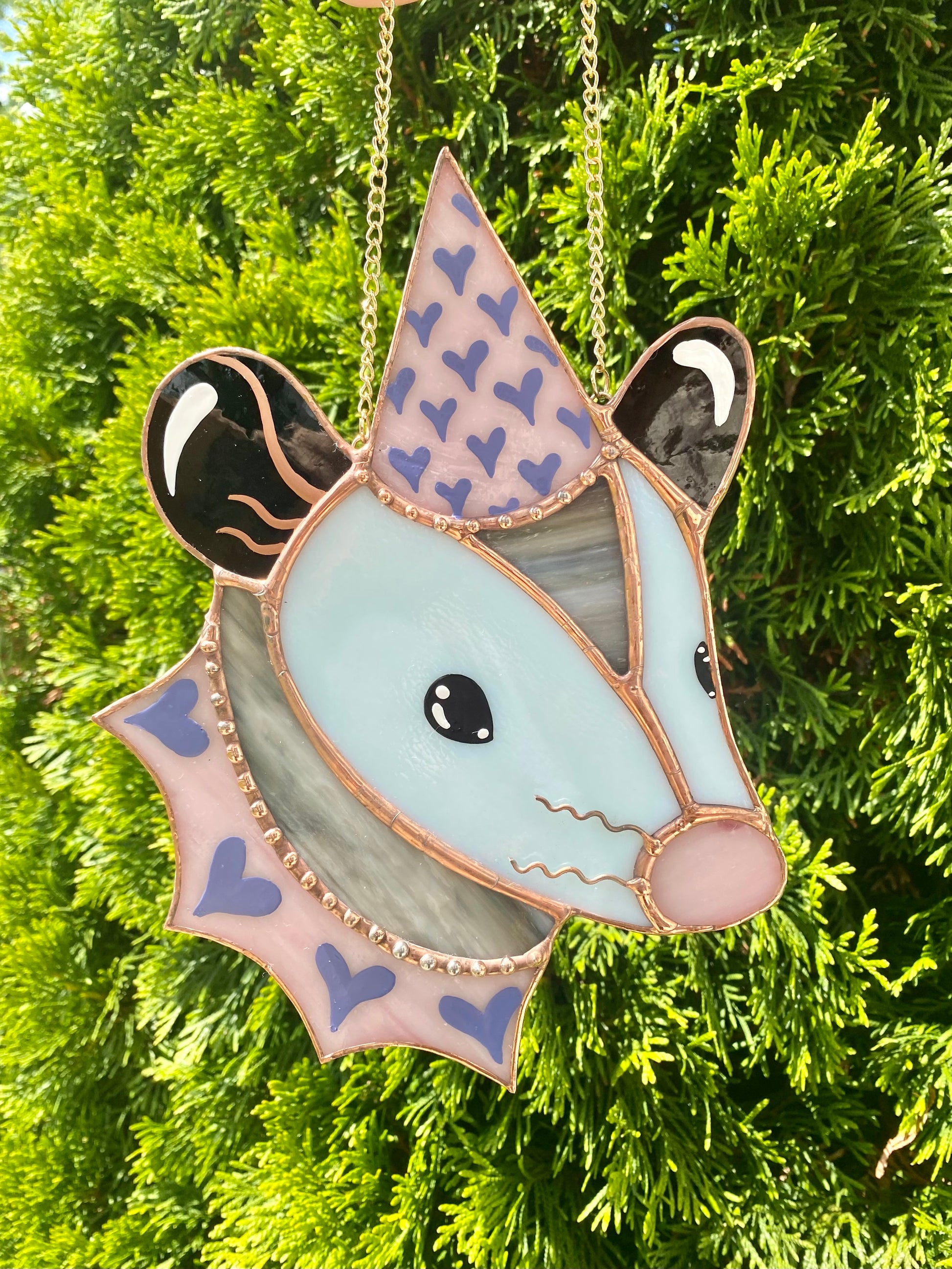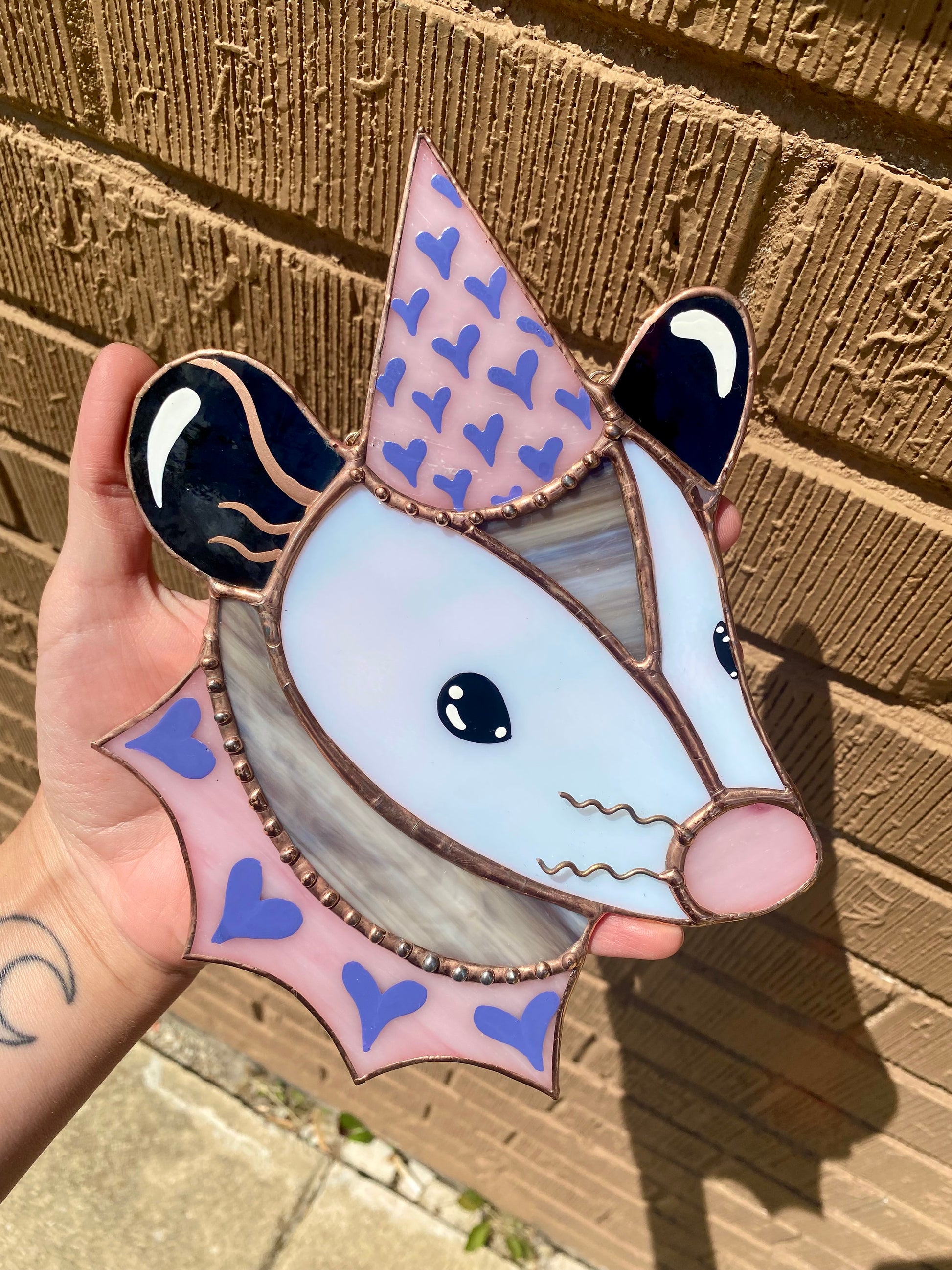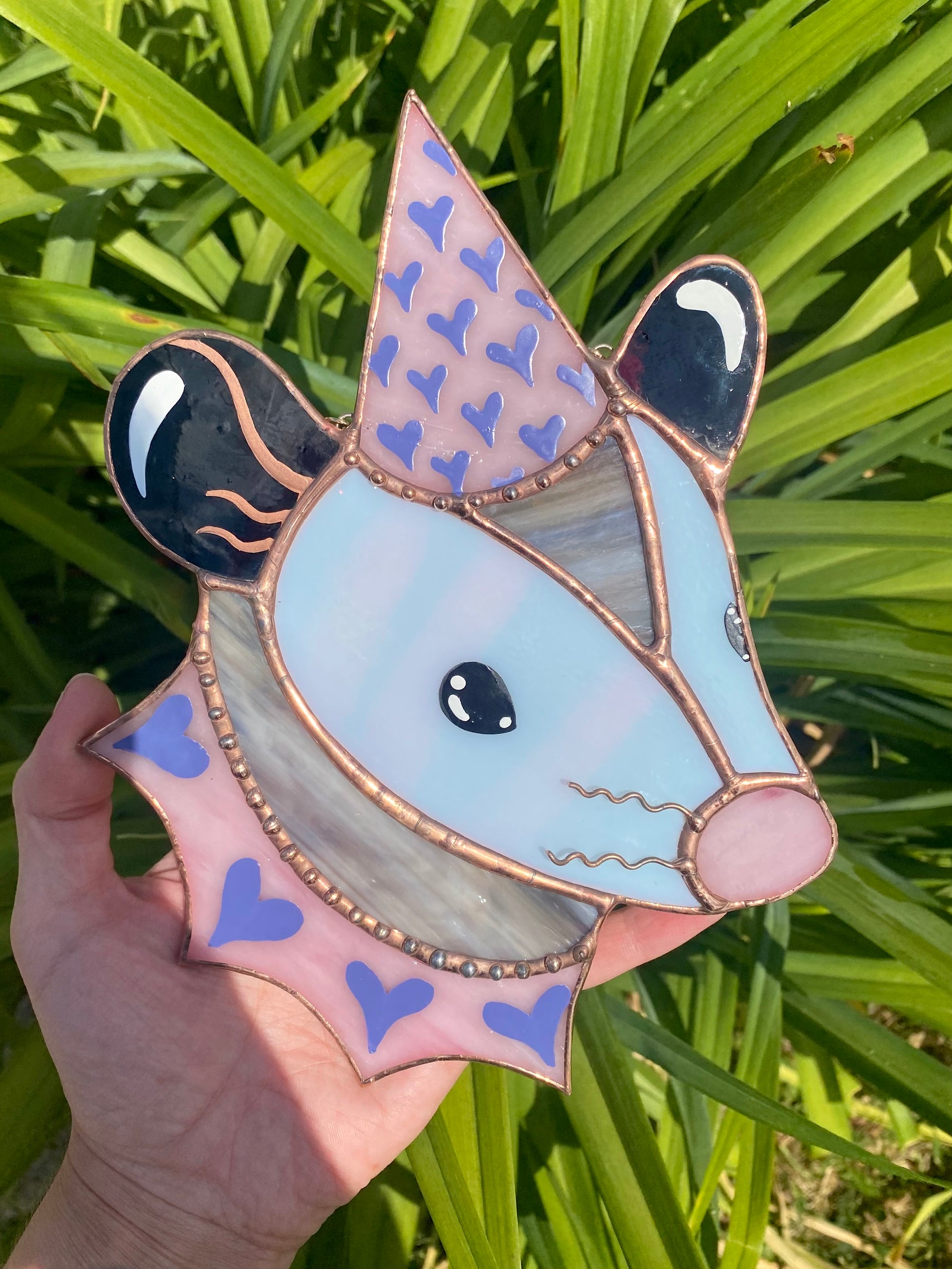 Pink and Purple Heart Opossum Stained Glass Suncatcher