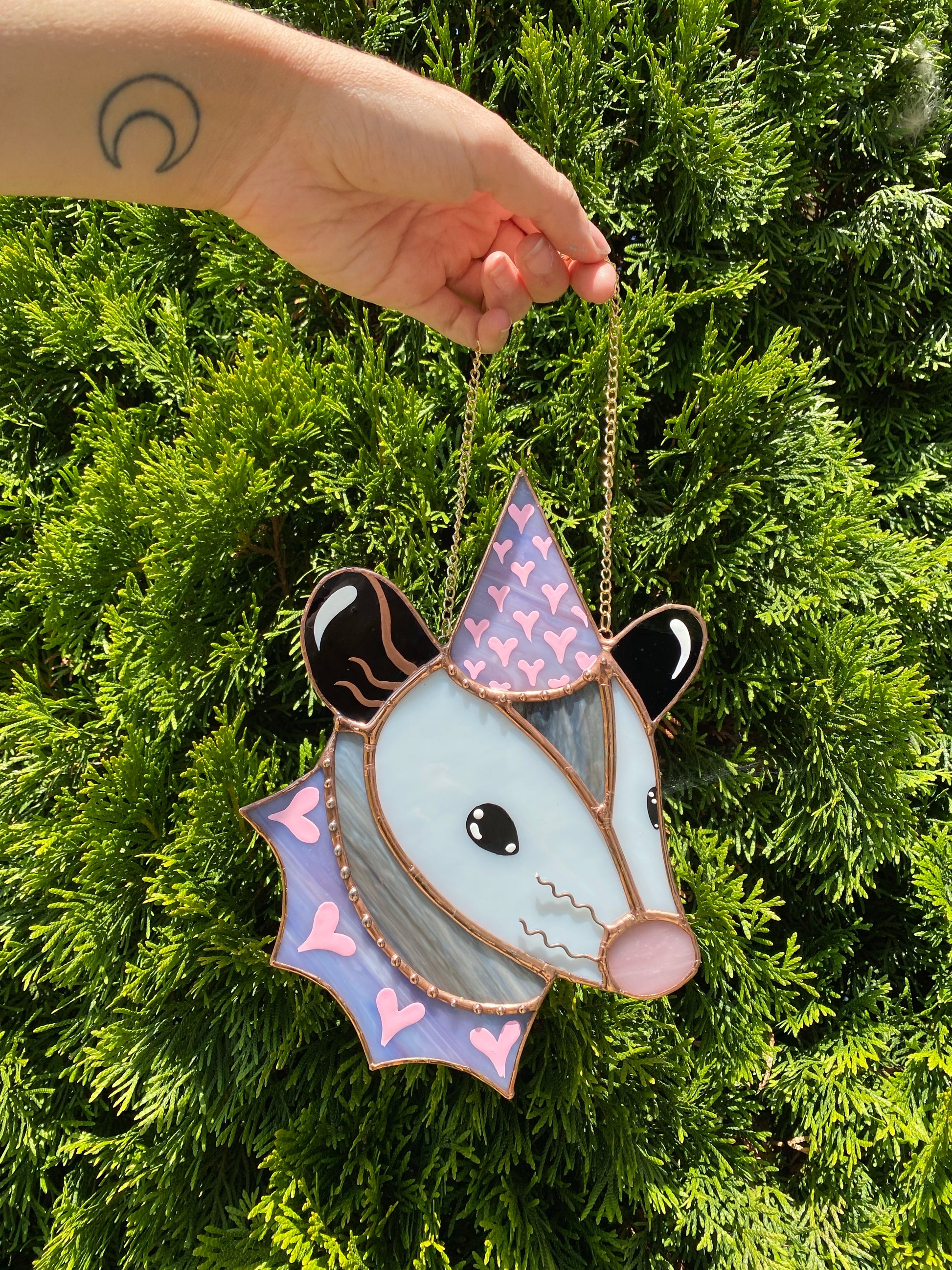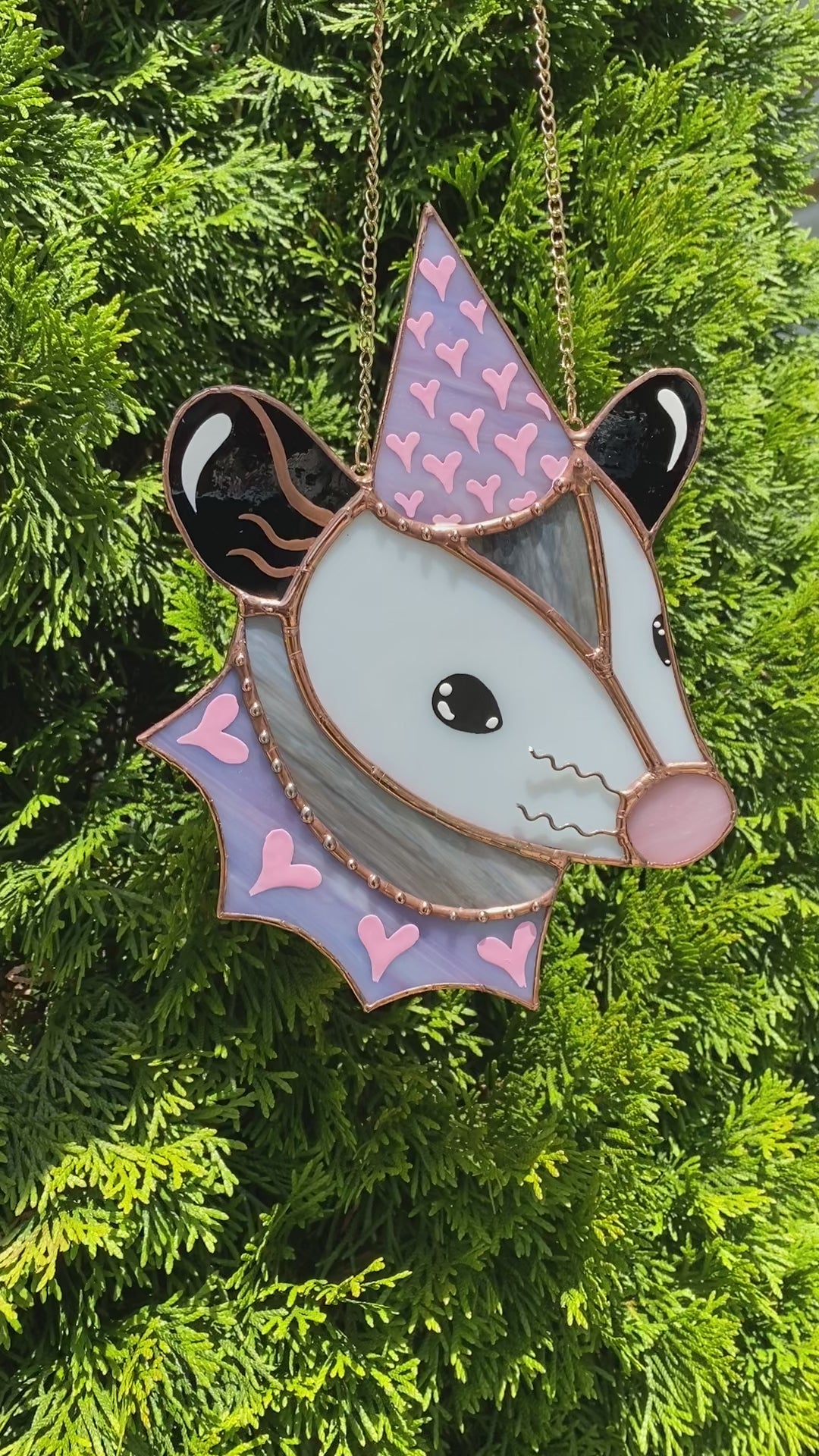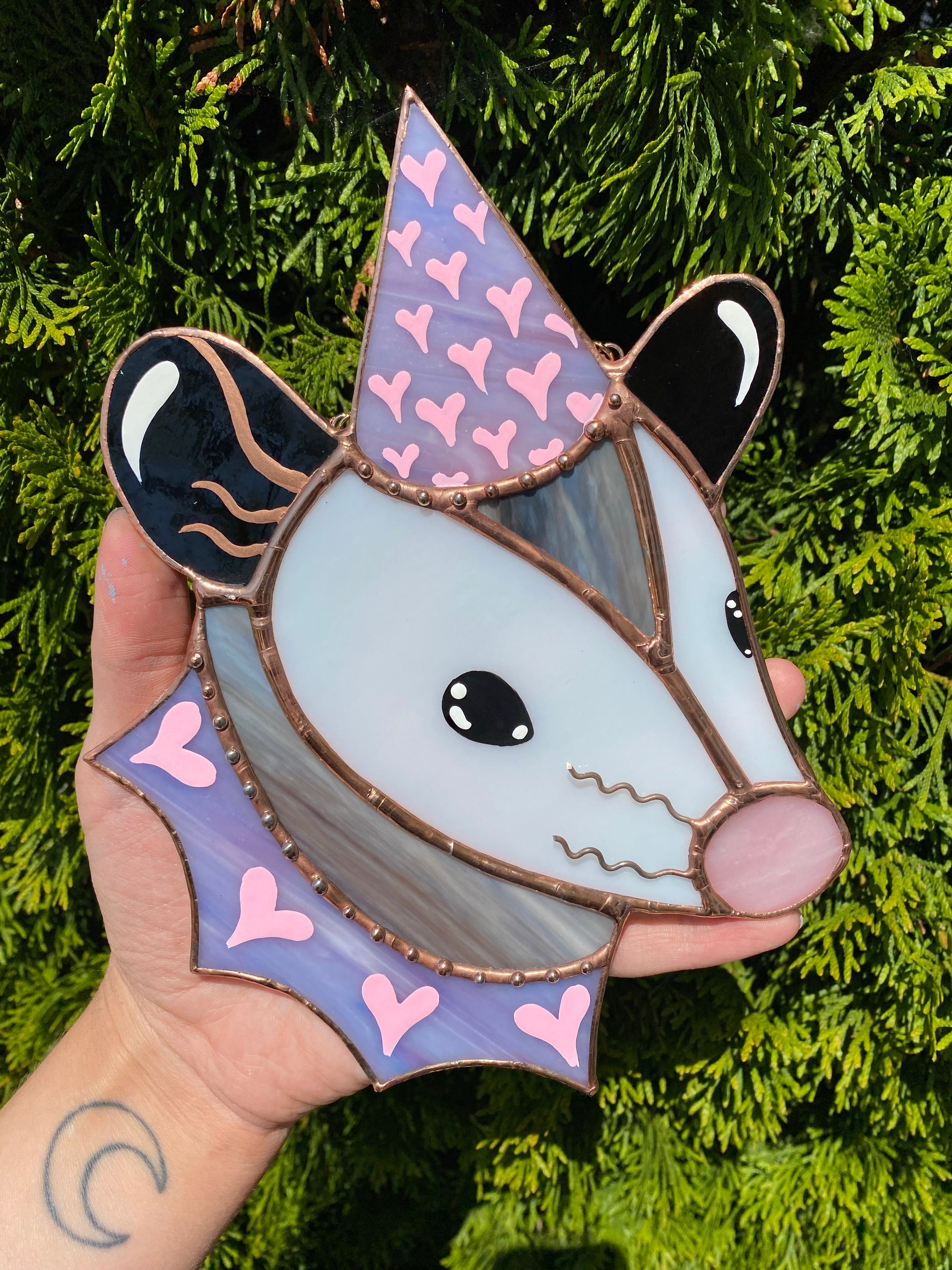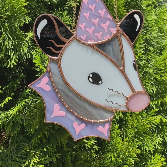 Pink and Purple Heart Opossum Stained Glass Suncatcher