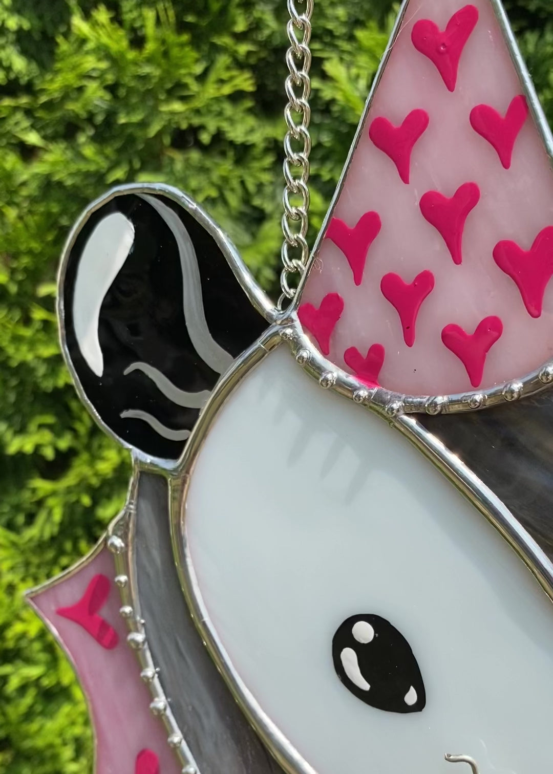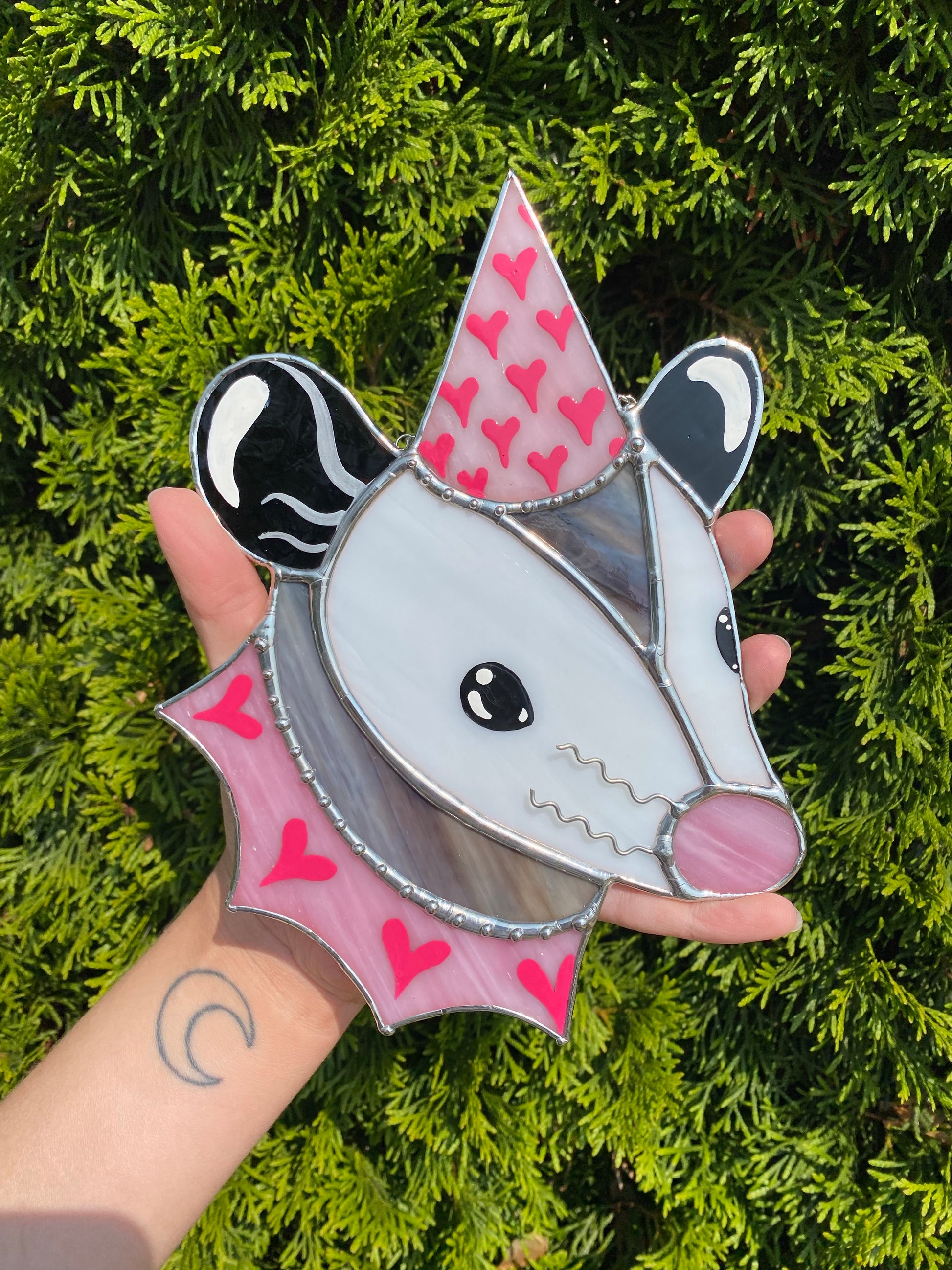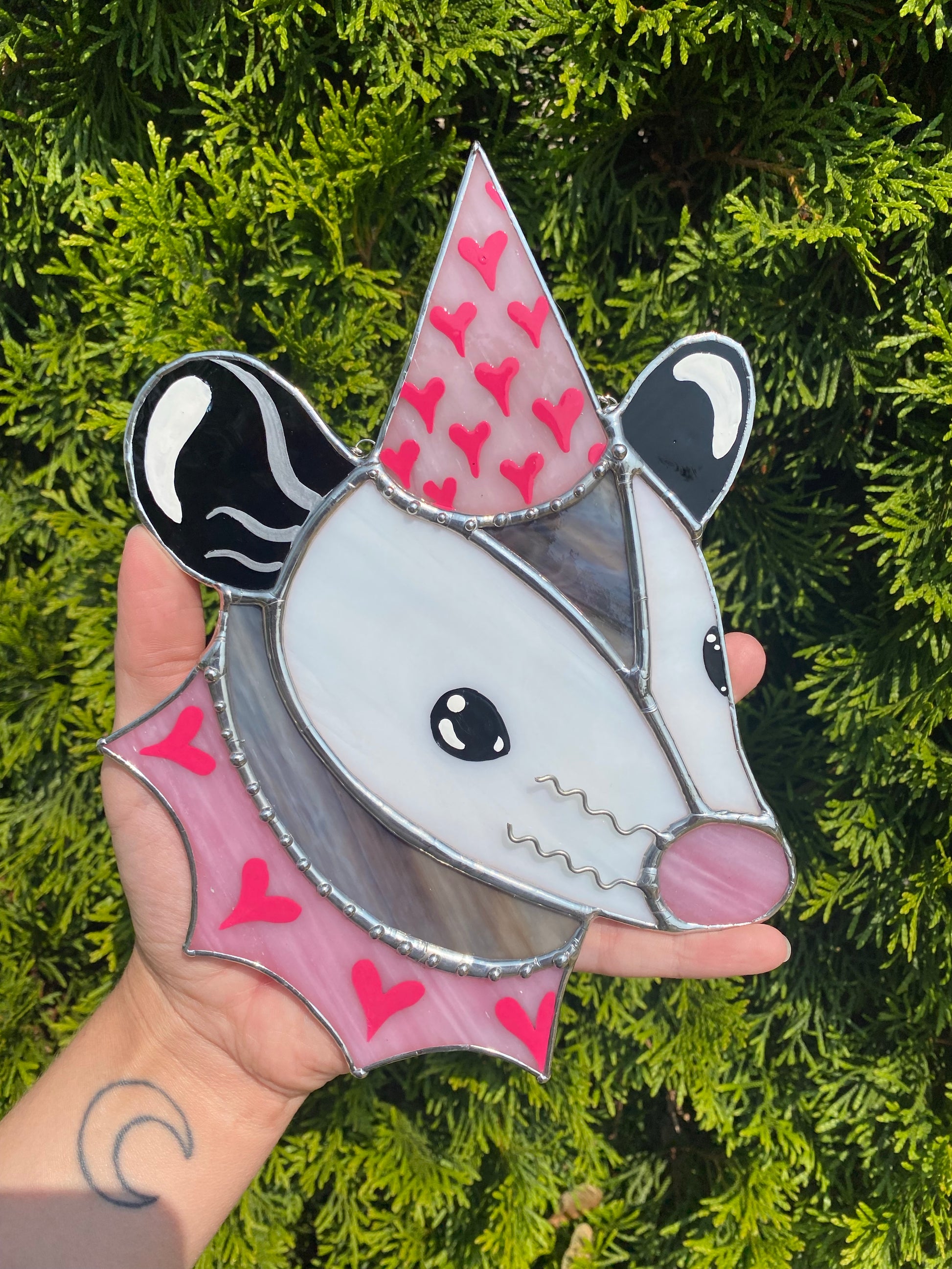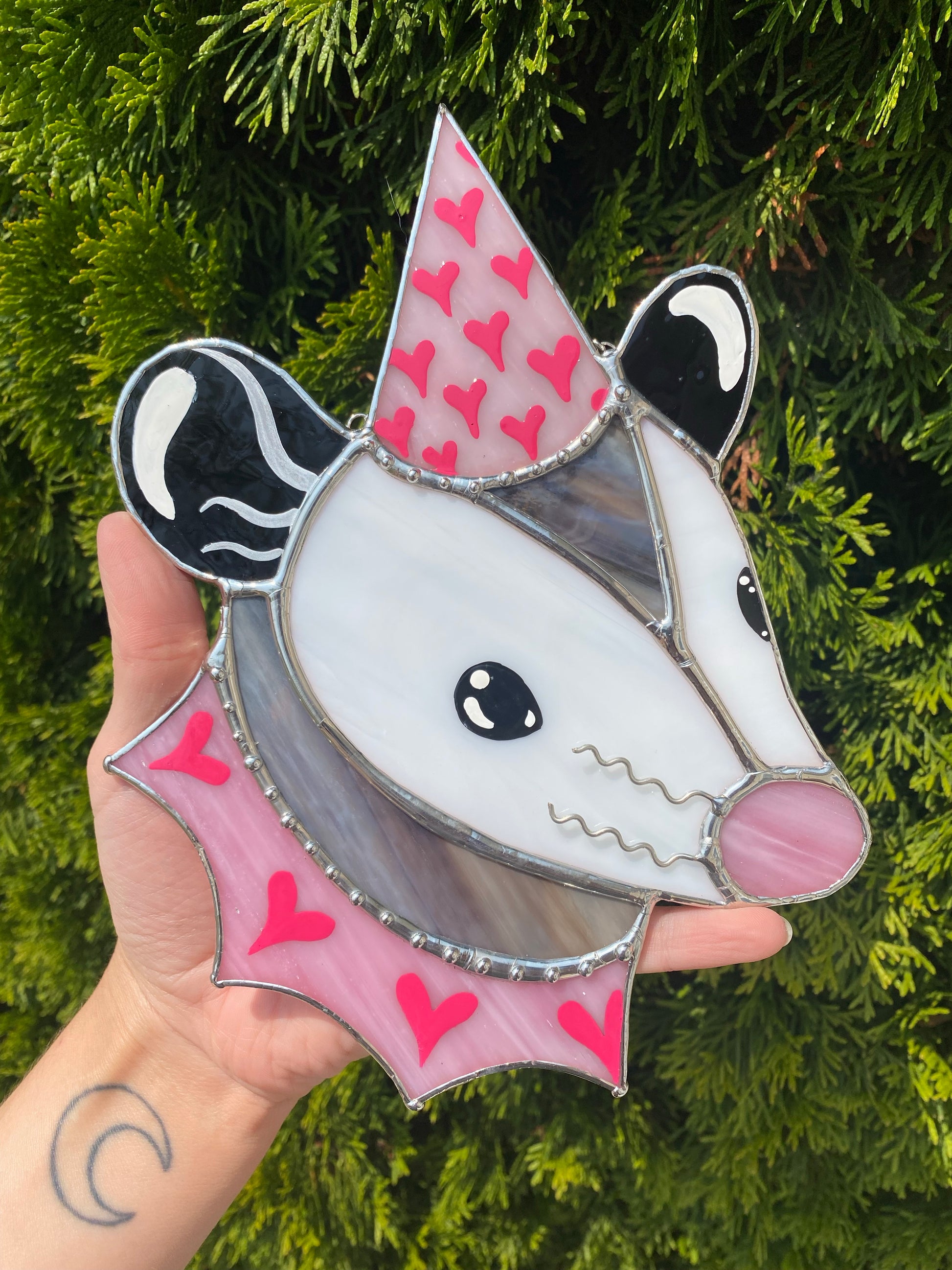 Pink and Silver Heart Opossum Stained Glass Suncatcher