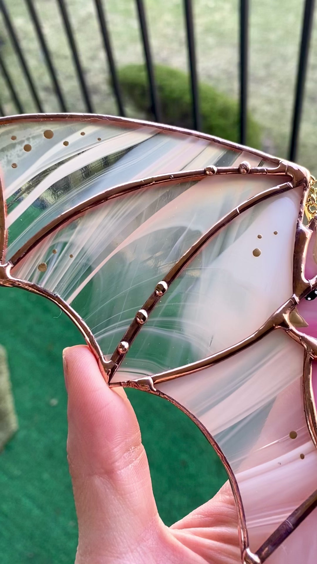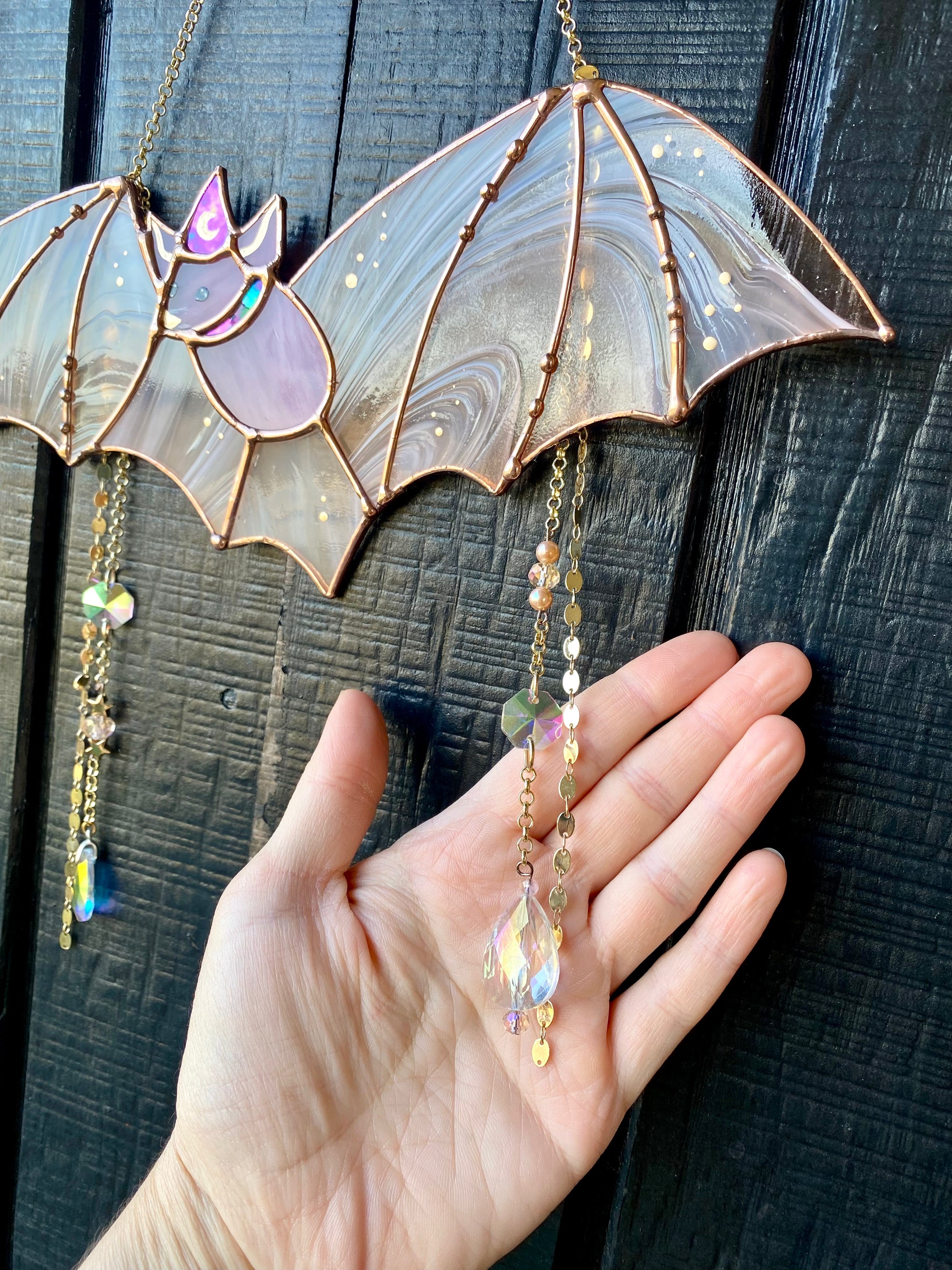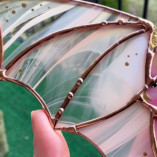 One of a kind! Made with a peachy swirl glass for wings with suncatcher beads! Measures 12” long and 5” tall (not including length of beads). Total length from top of chain to bottom of jewels is 15”. Has a gold chain and screw-in hook to hang her up wherever you please!
