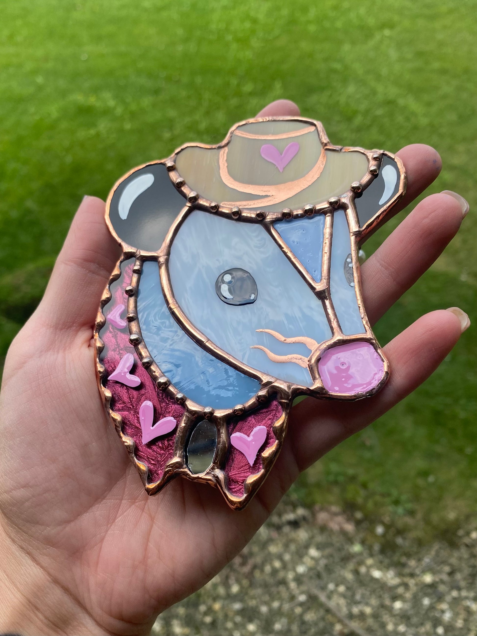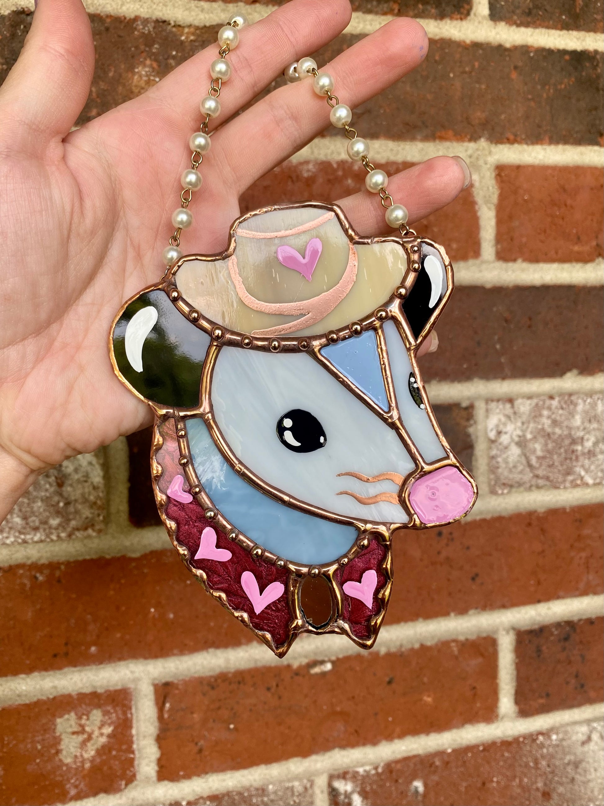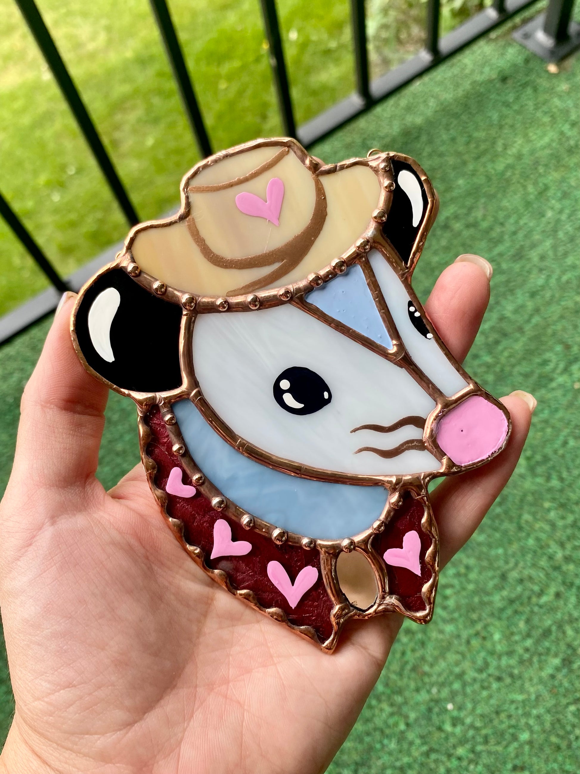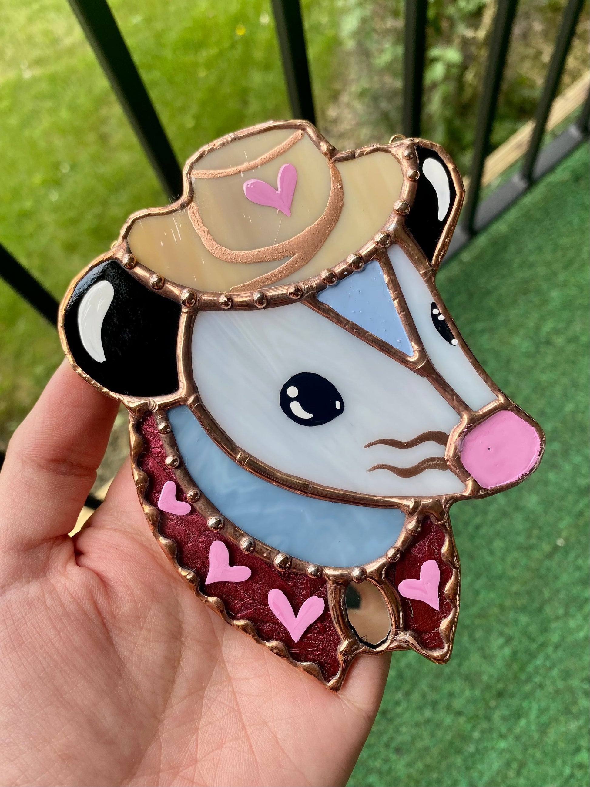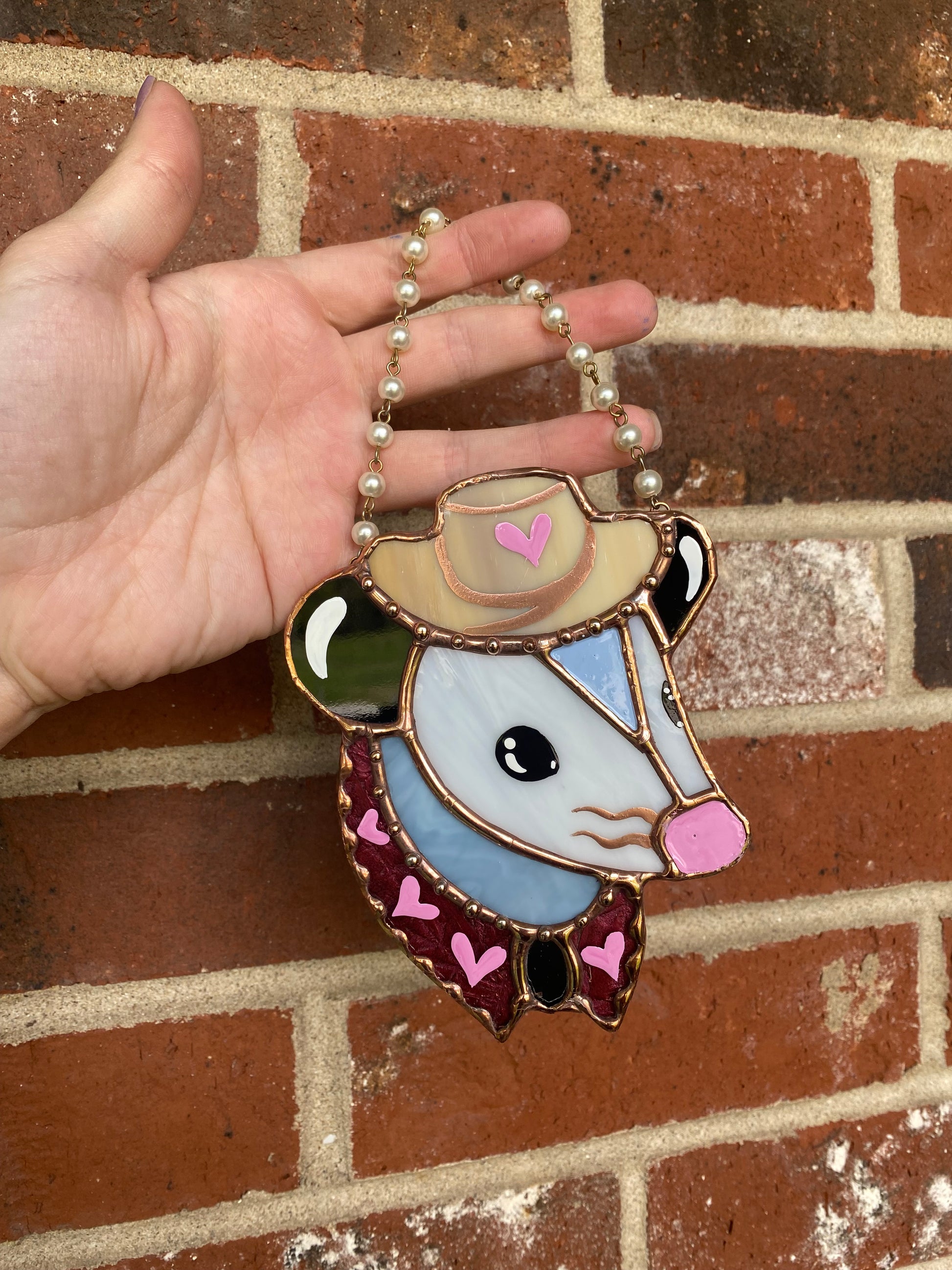 Pink Heart Cowboy Opossum Stained Glass Ornament