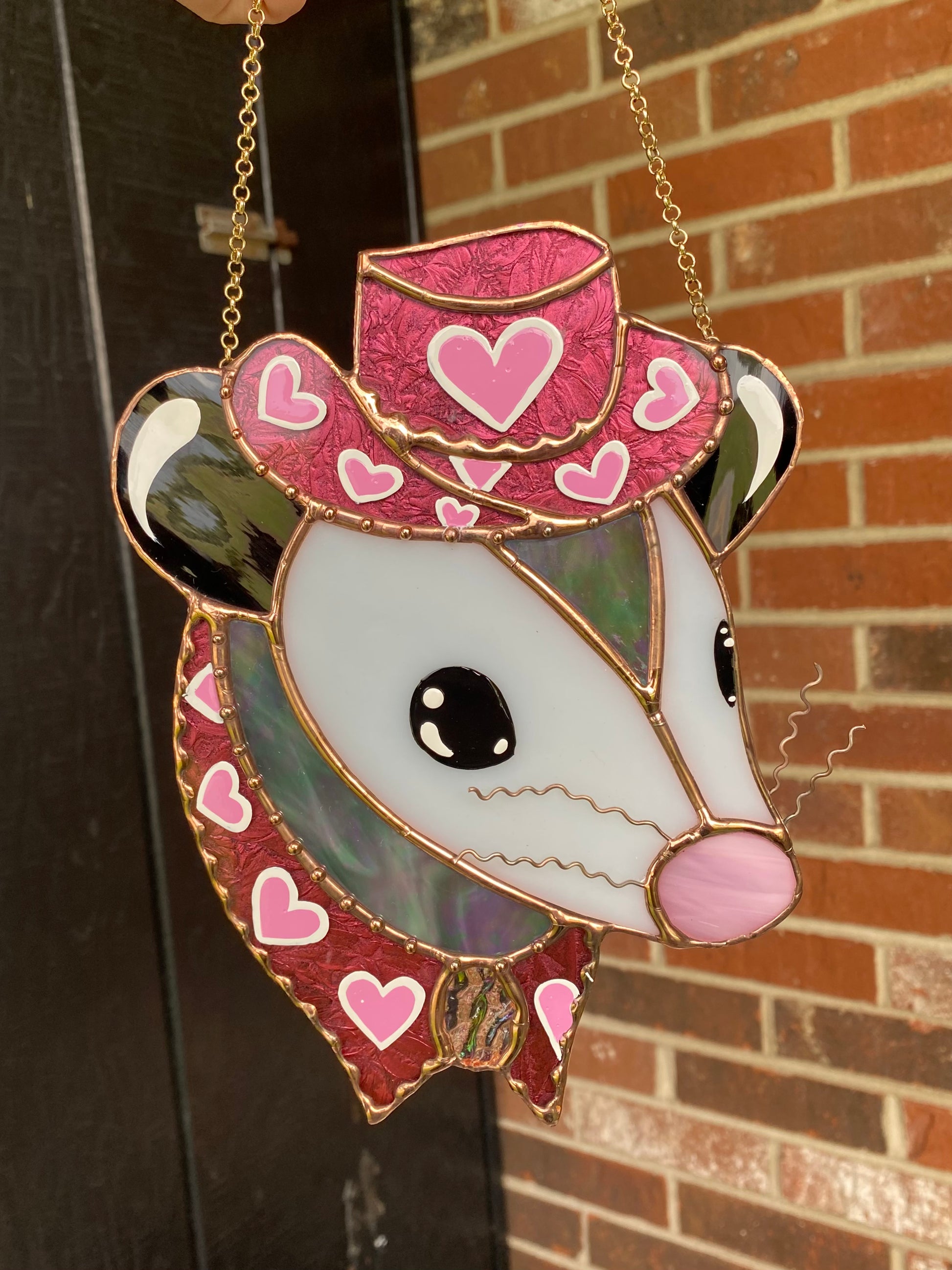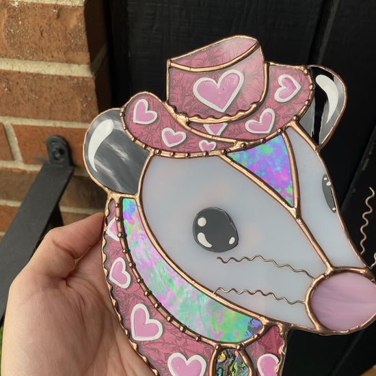 Measures 8.5” tall and 6” wide. Made with iridescent and Van Gogh glass. Has a gold chain and screw-in hook to hang her up wherever you please!