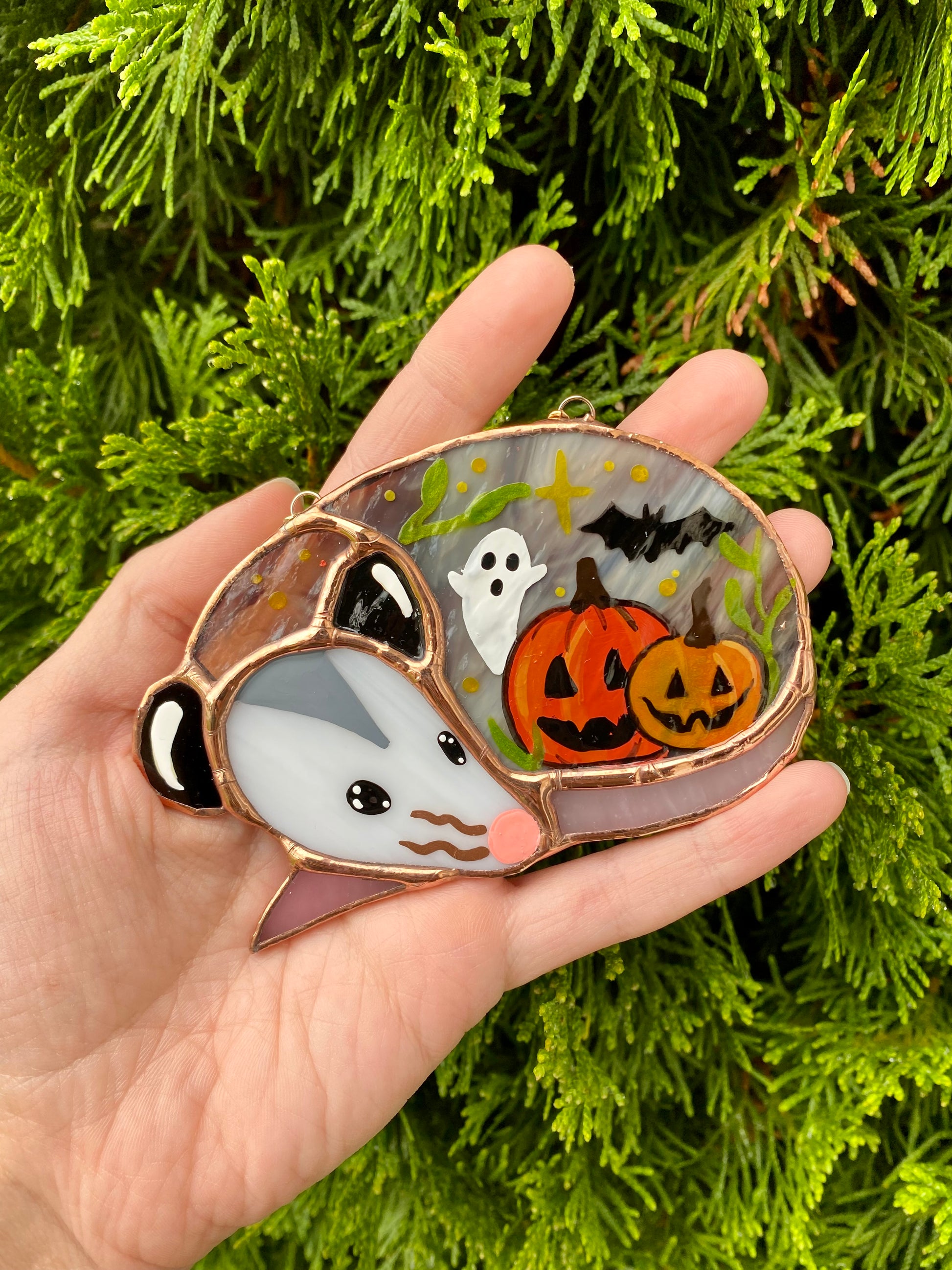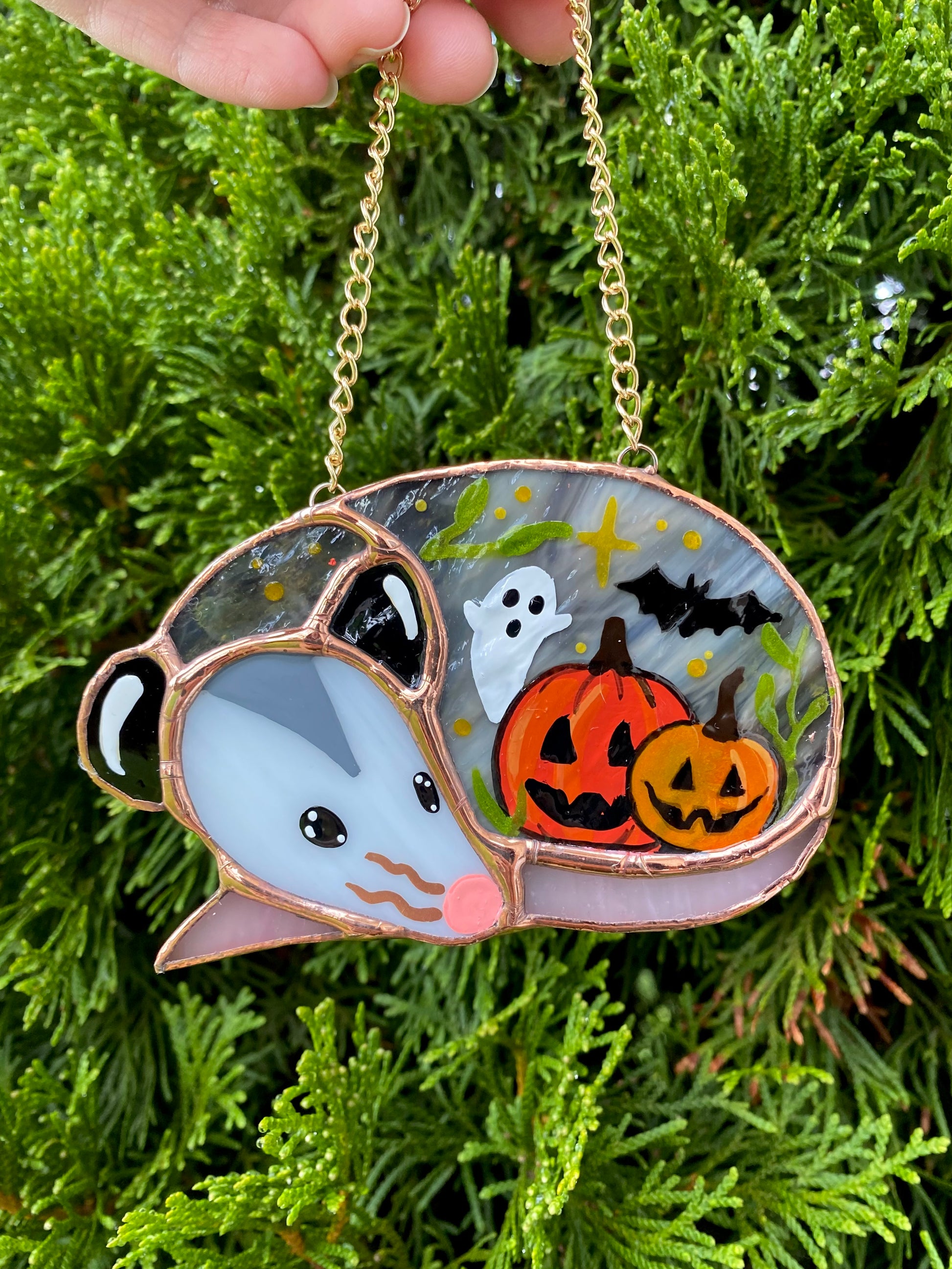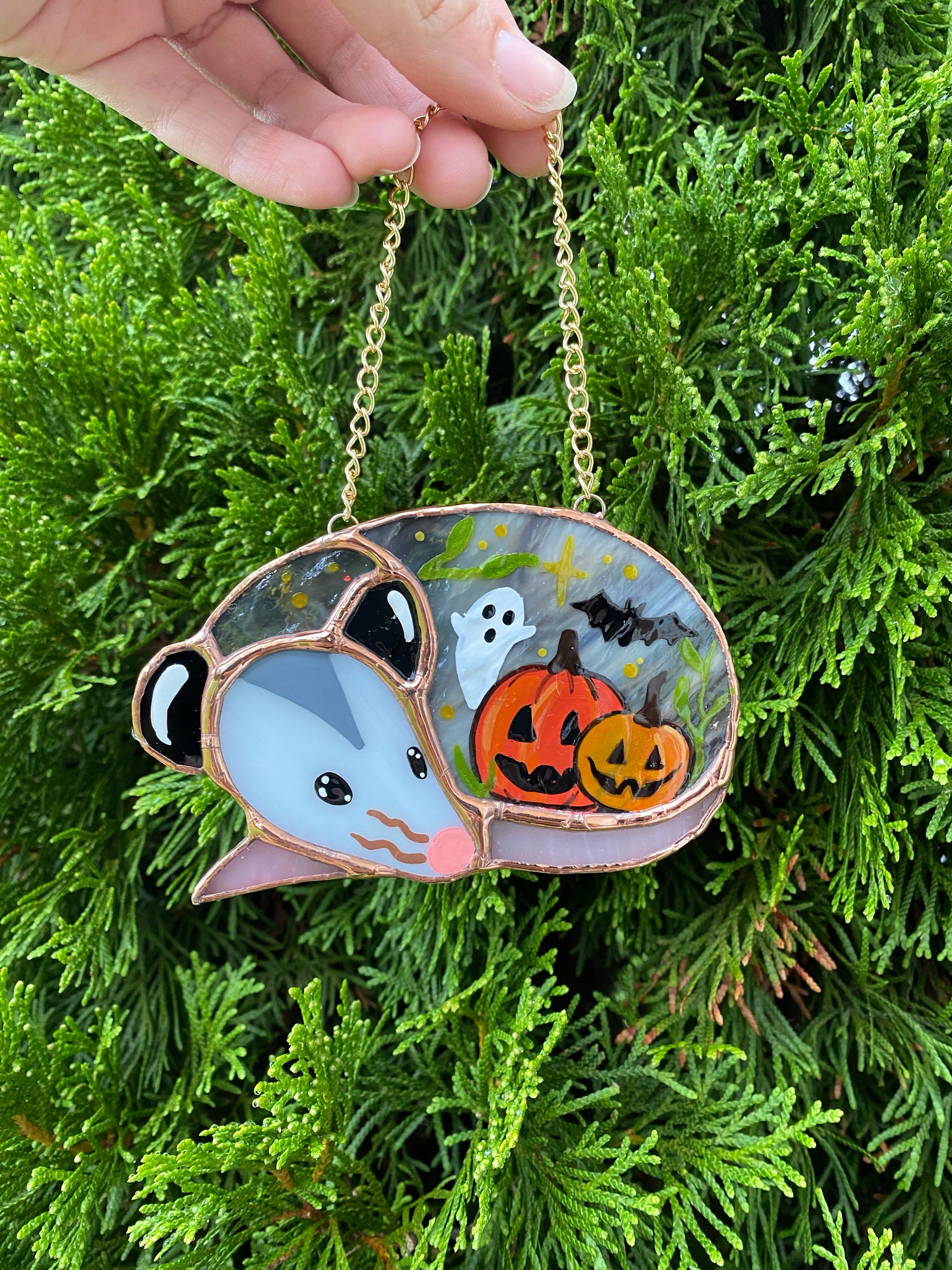 (Version 2) Pumpkins, Ghost and Bat Sleepy Opossum Mini Stained Glass Suncatcher