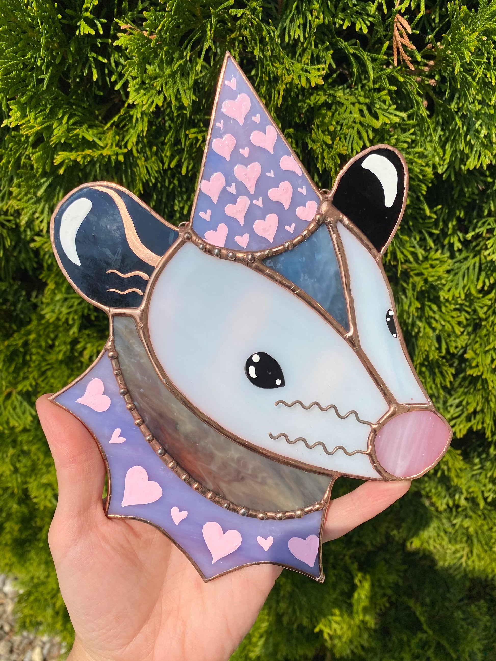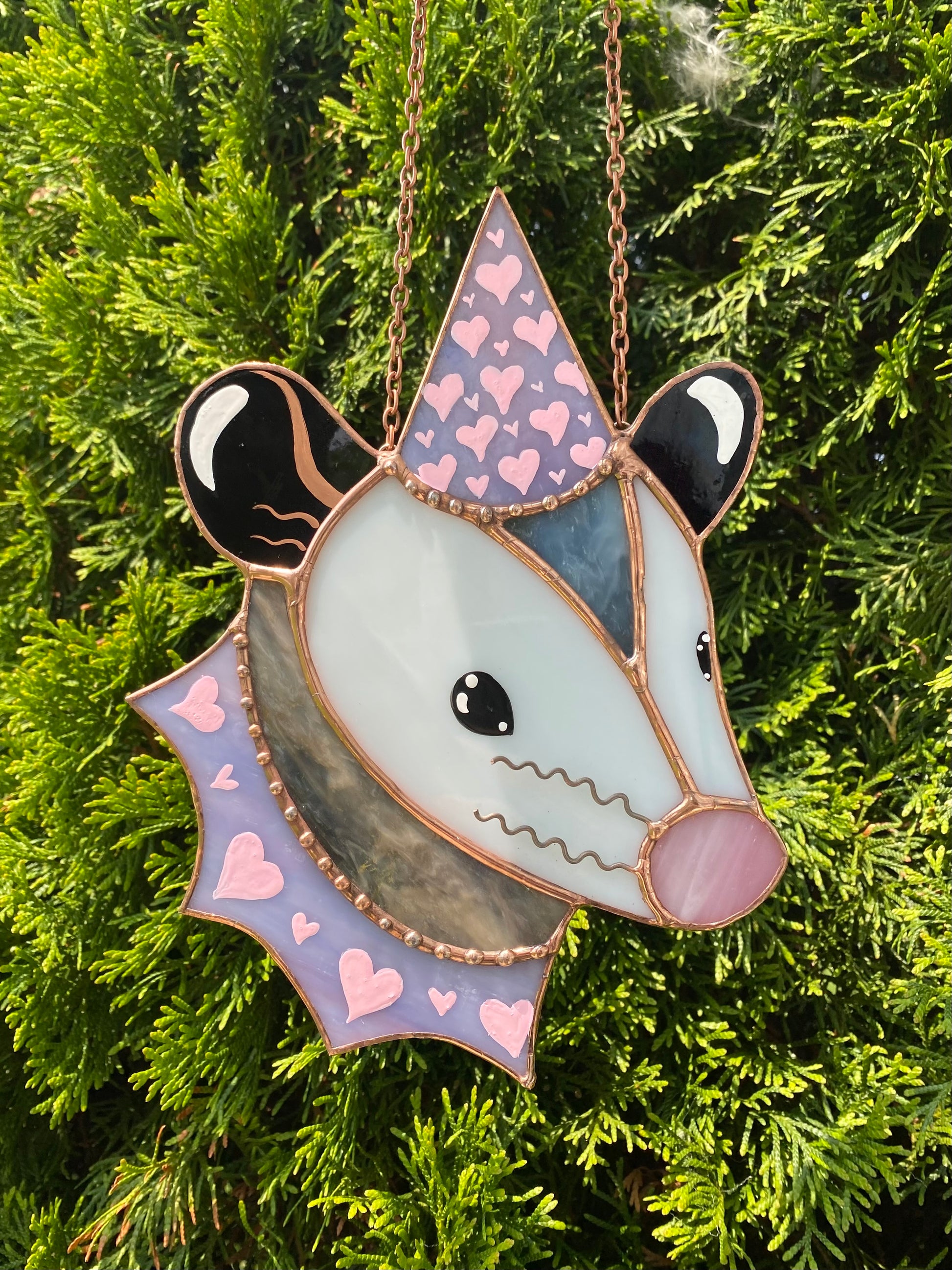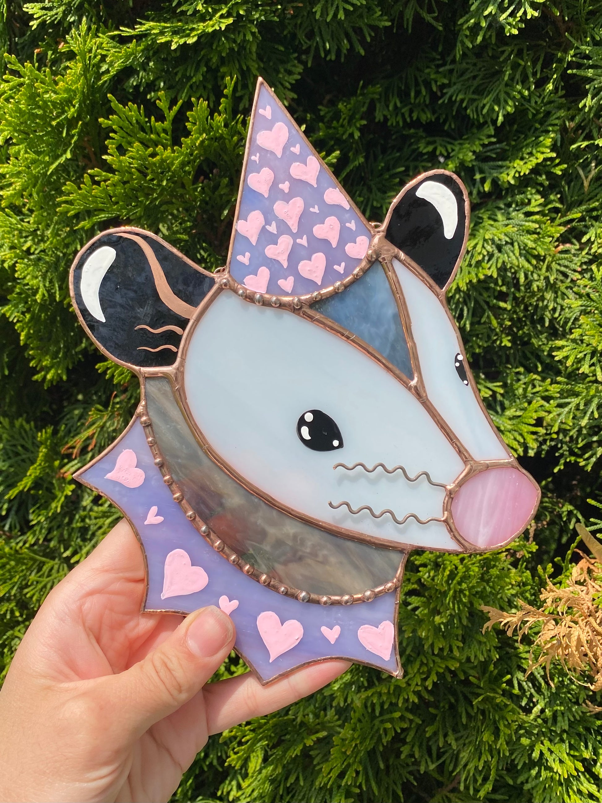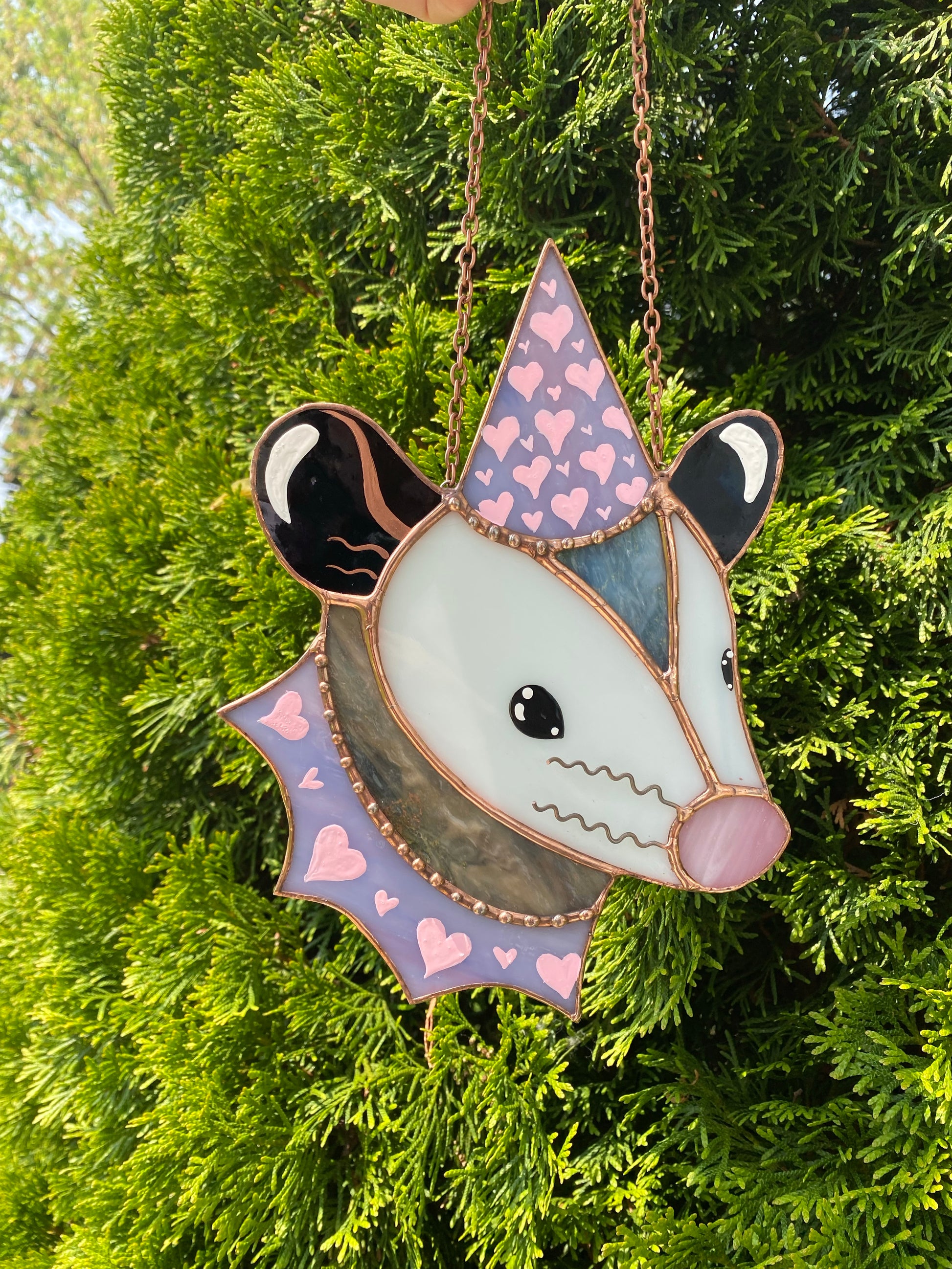 Purple and Pink Heart Opossum Stained Glass Suncatcher