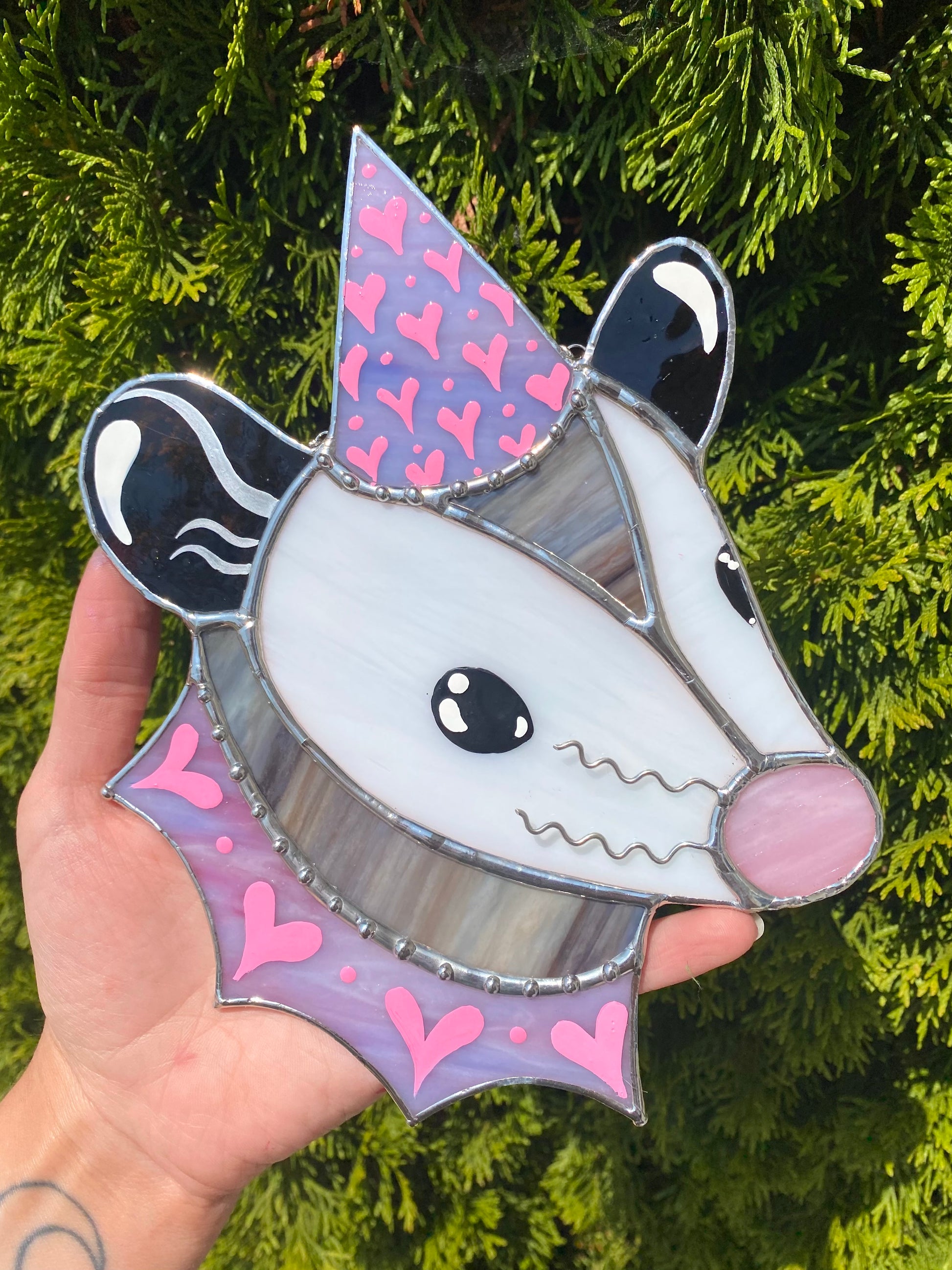 Purple and Silver Heart Opossum Stained Glass Suncatcher