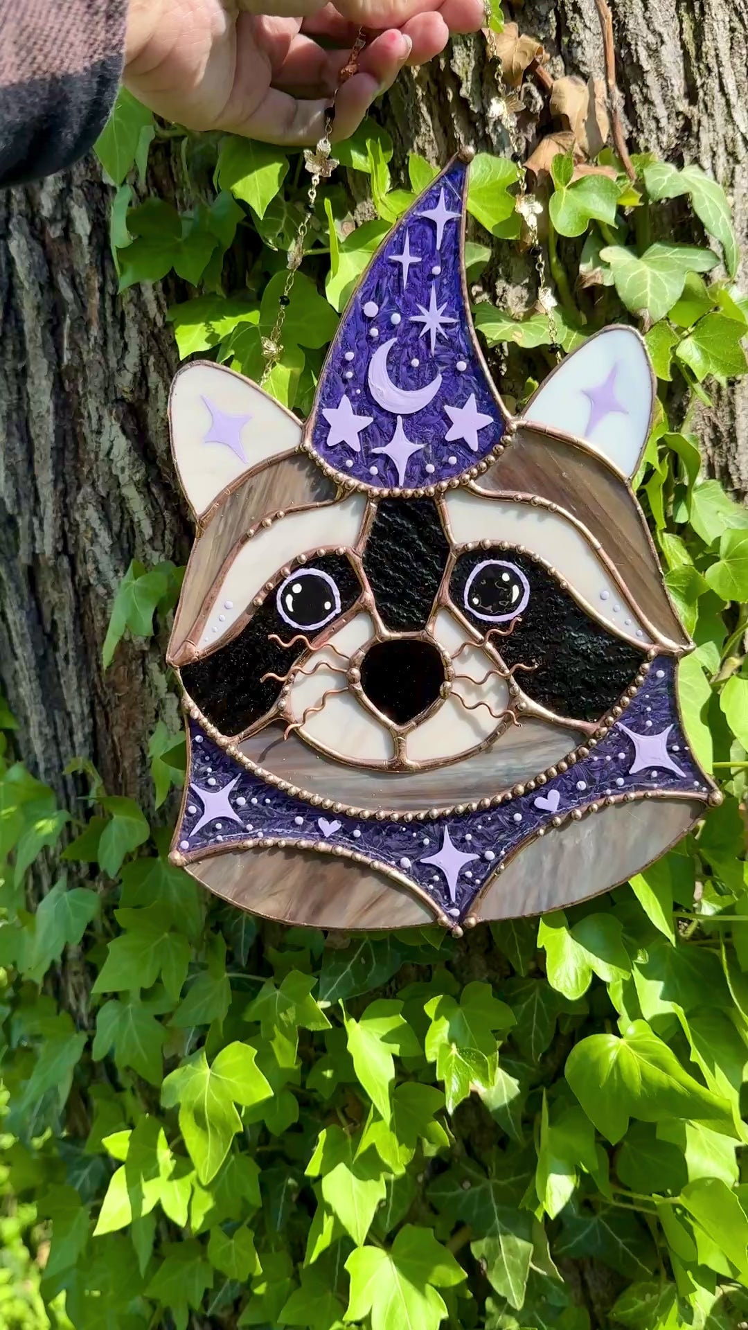 Purple Celestial Wizard Raccoon Stained Glass Suncatcher