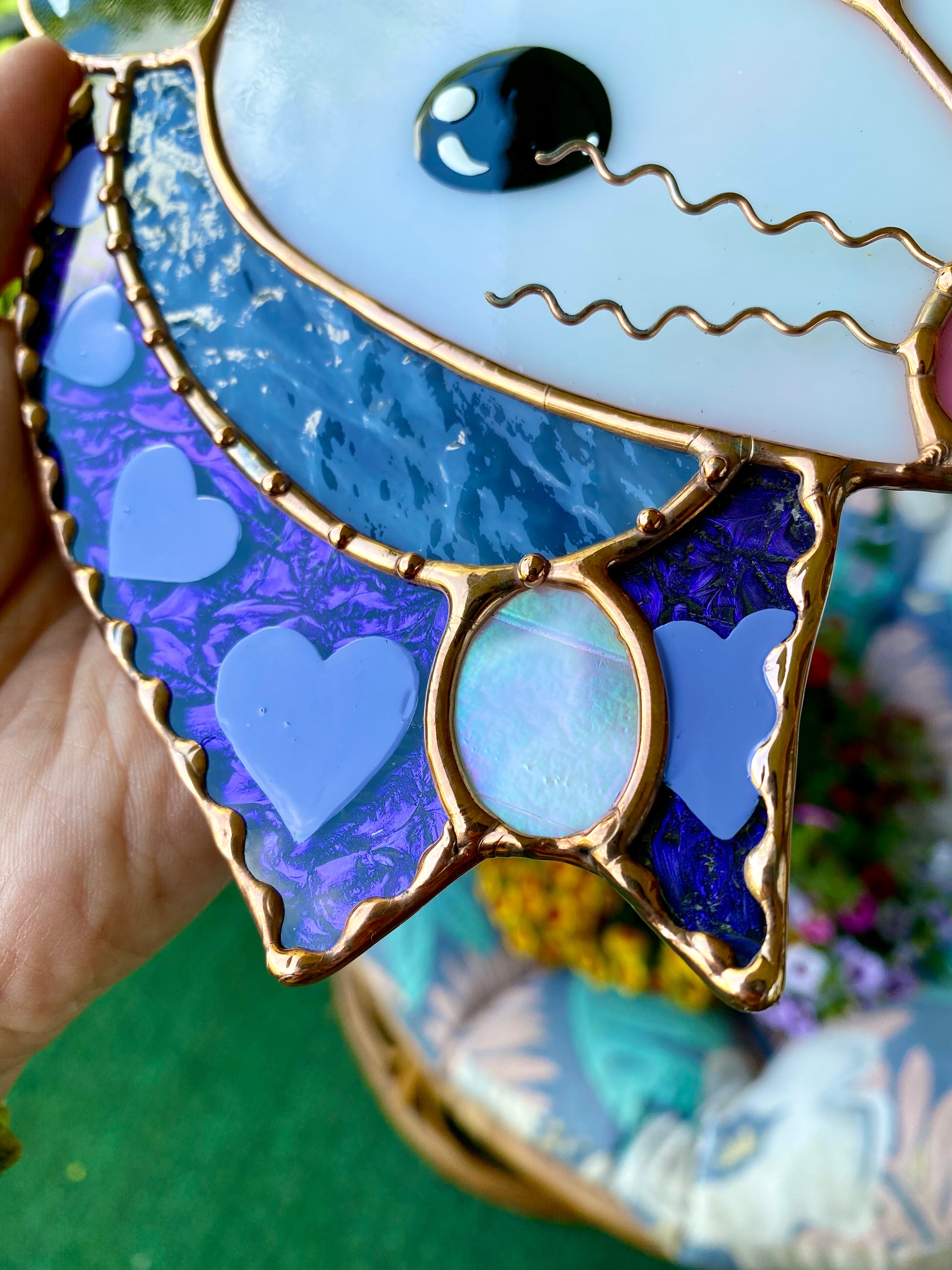 Measures 8.5” tall and 6” wide. Made with purple Van Gogh glass and irridescent mottled glass for the bolo tie. Has a gold chain and hang up kit to hang her up wherever you please!