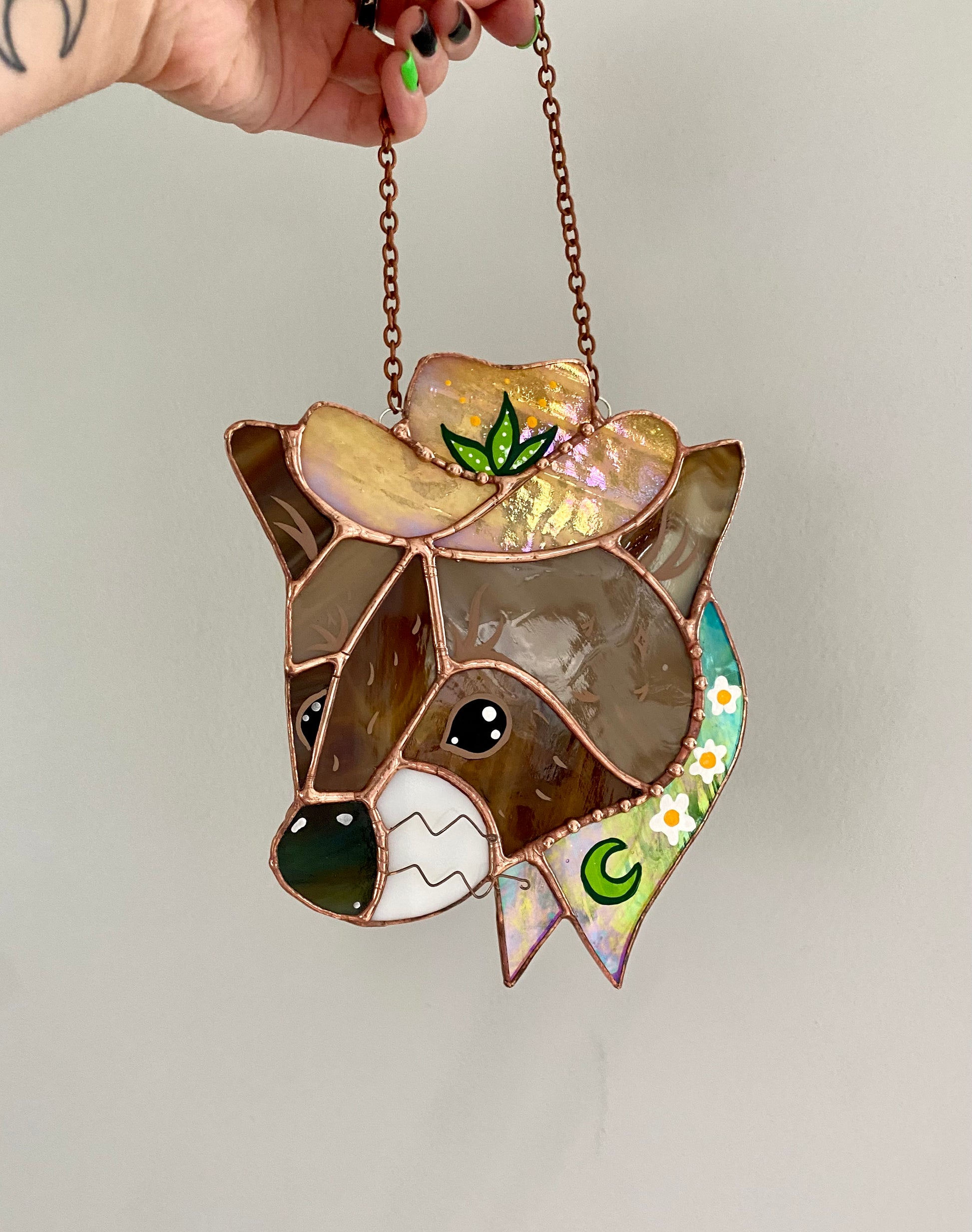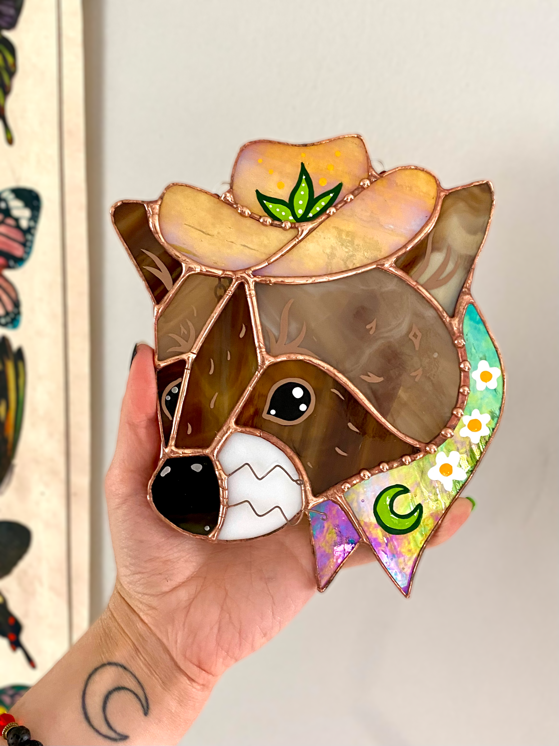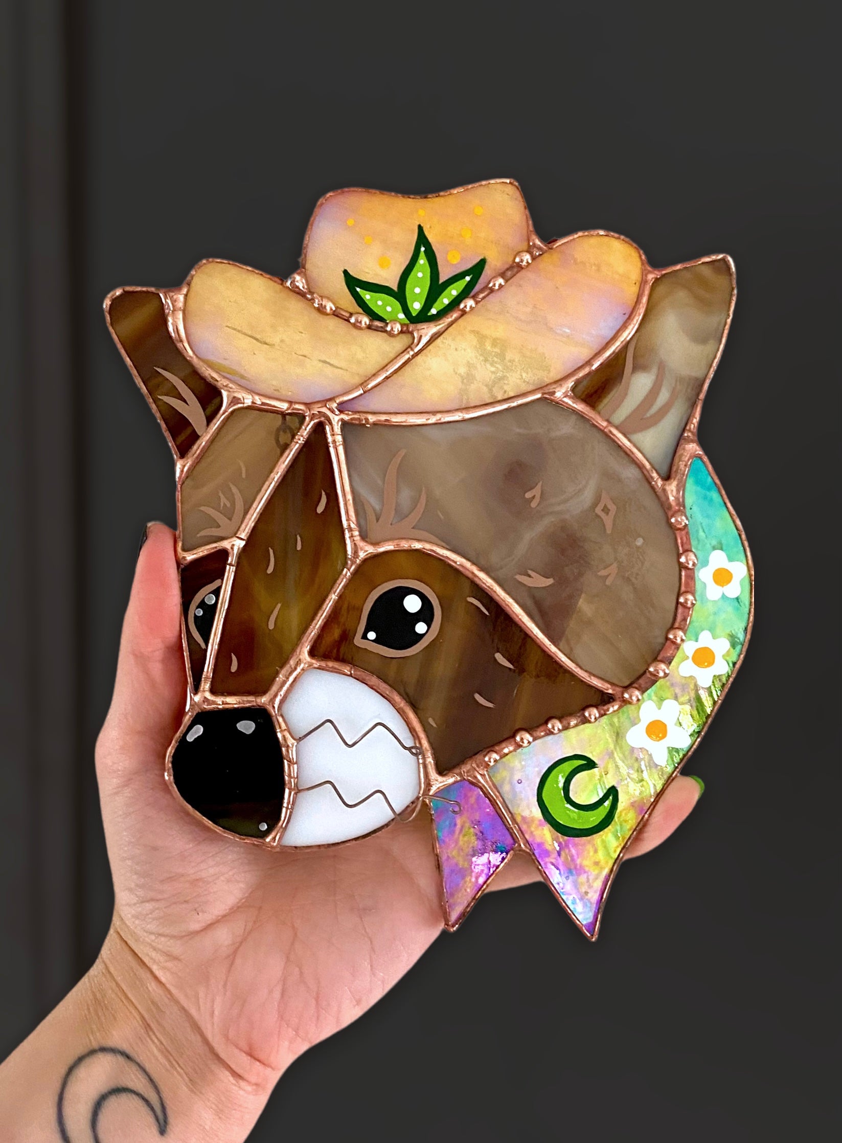 CRACKED! Raccoon Cowboy Stained Glass Suncatcher