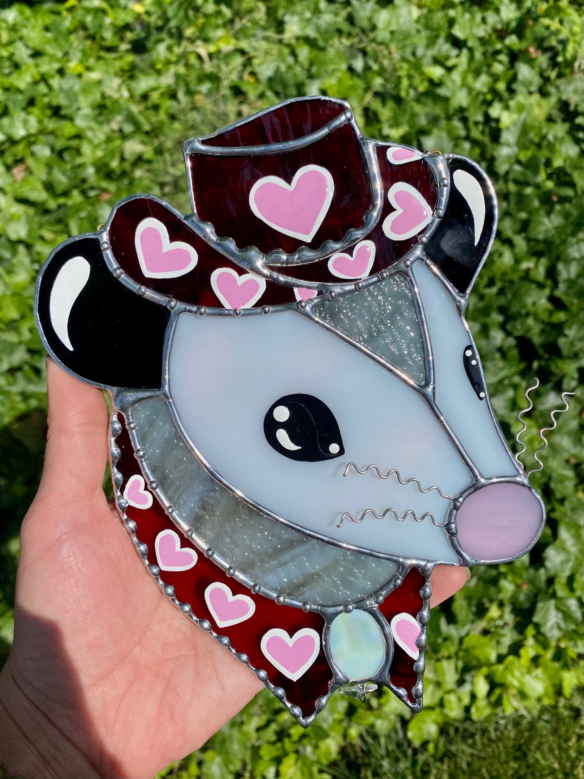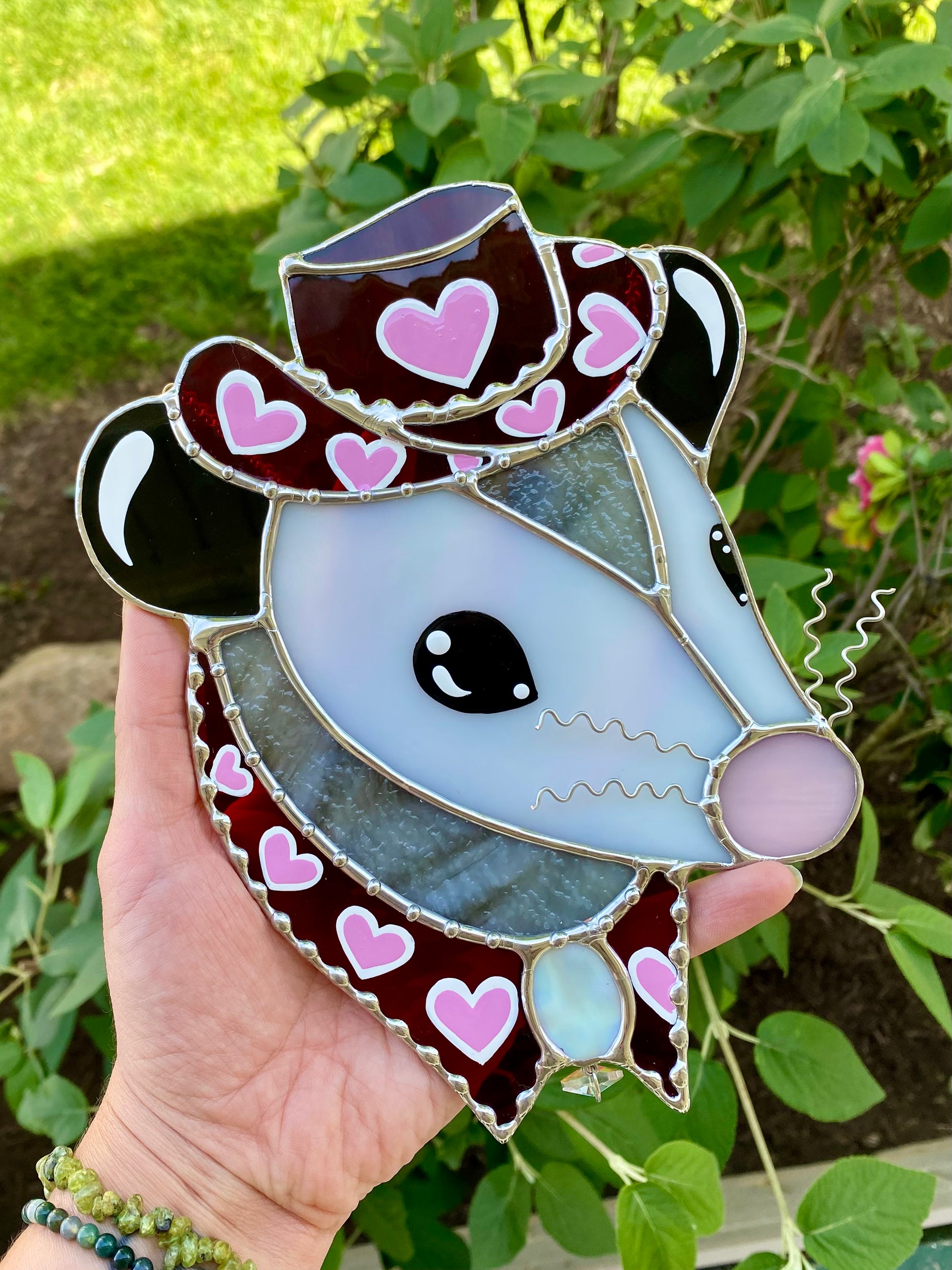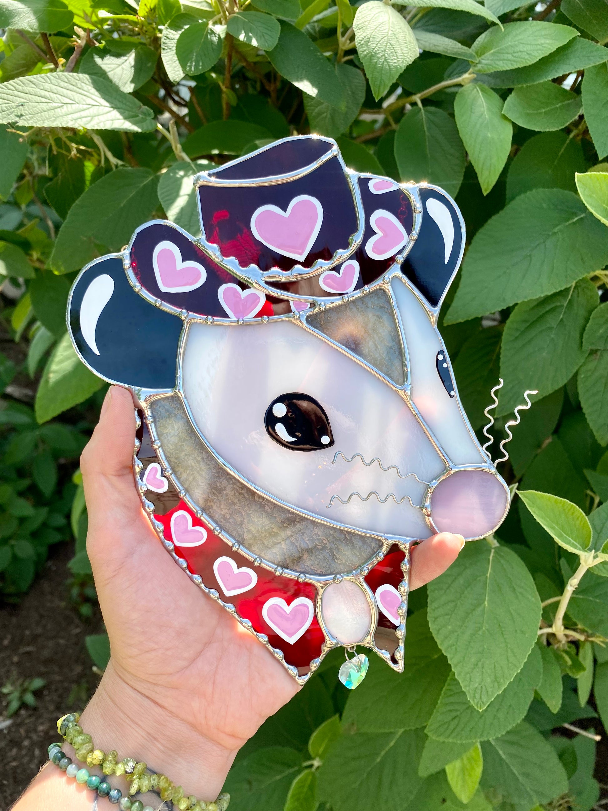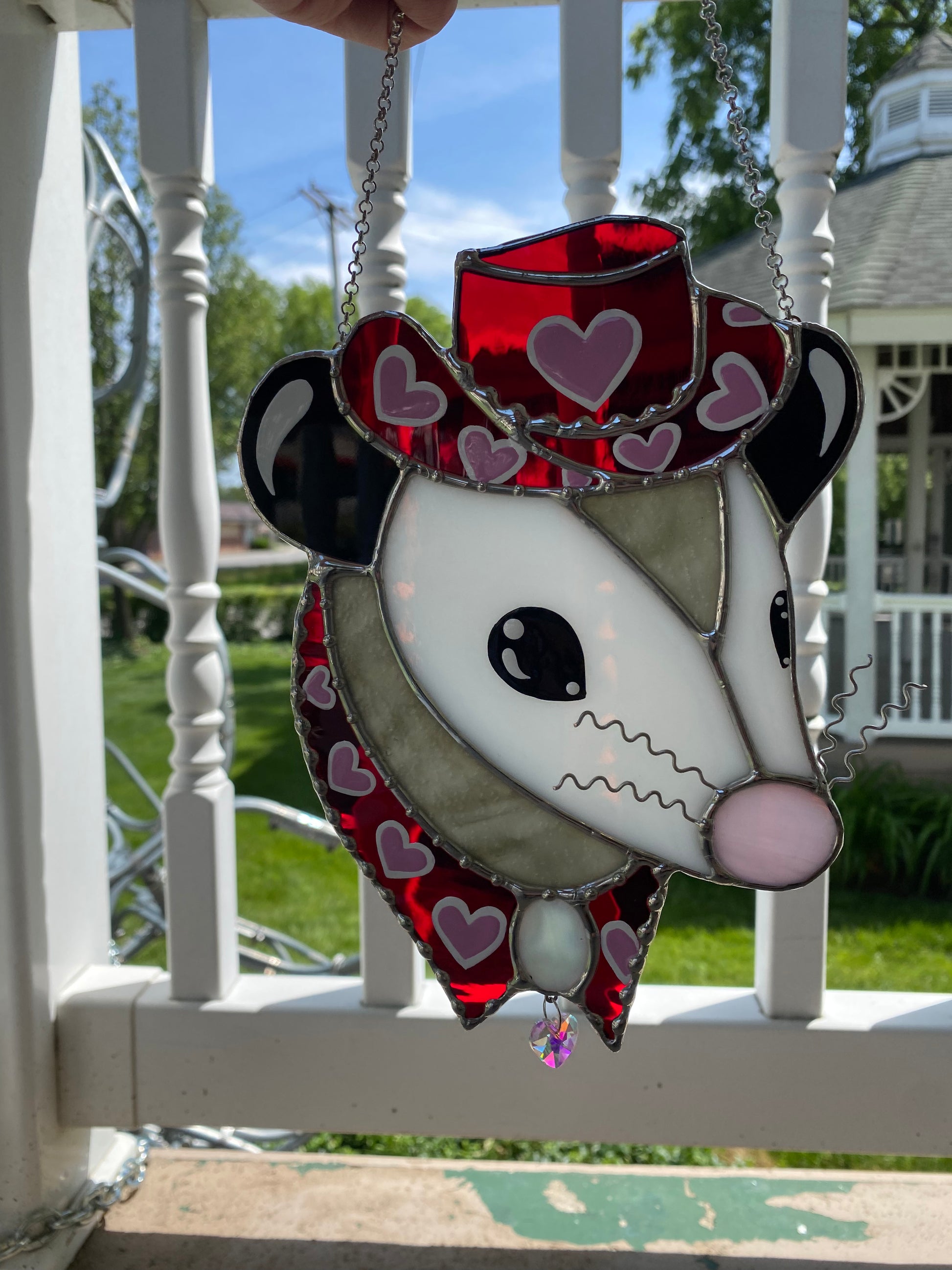 Red Lovely Cowboy Opossum Stained Glass Suncatcher