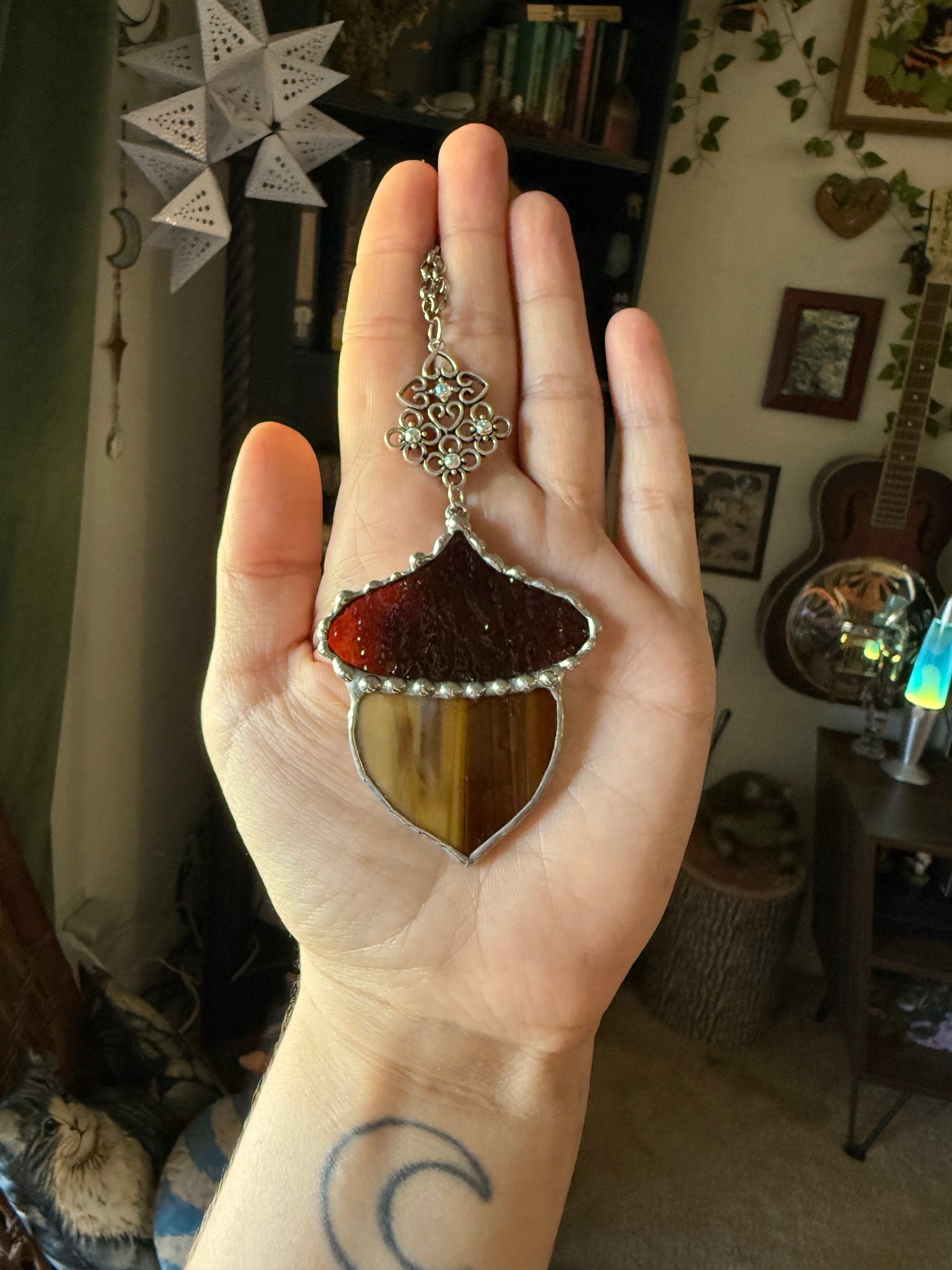 acorn with silver charm and chain. Has a clasp for easy hanging around rear view mirror.