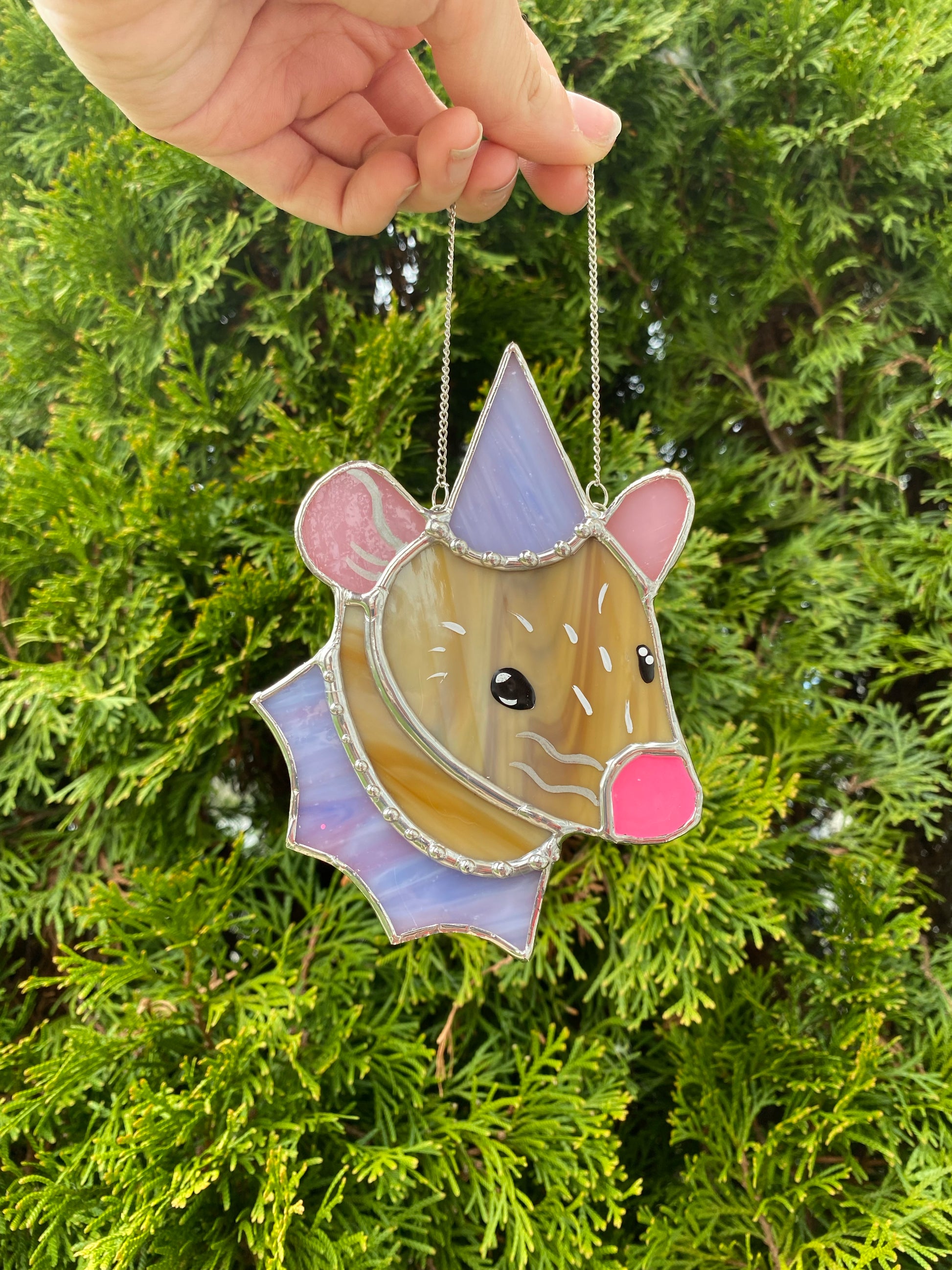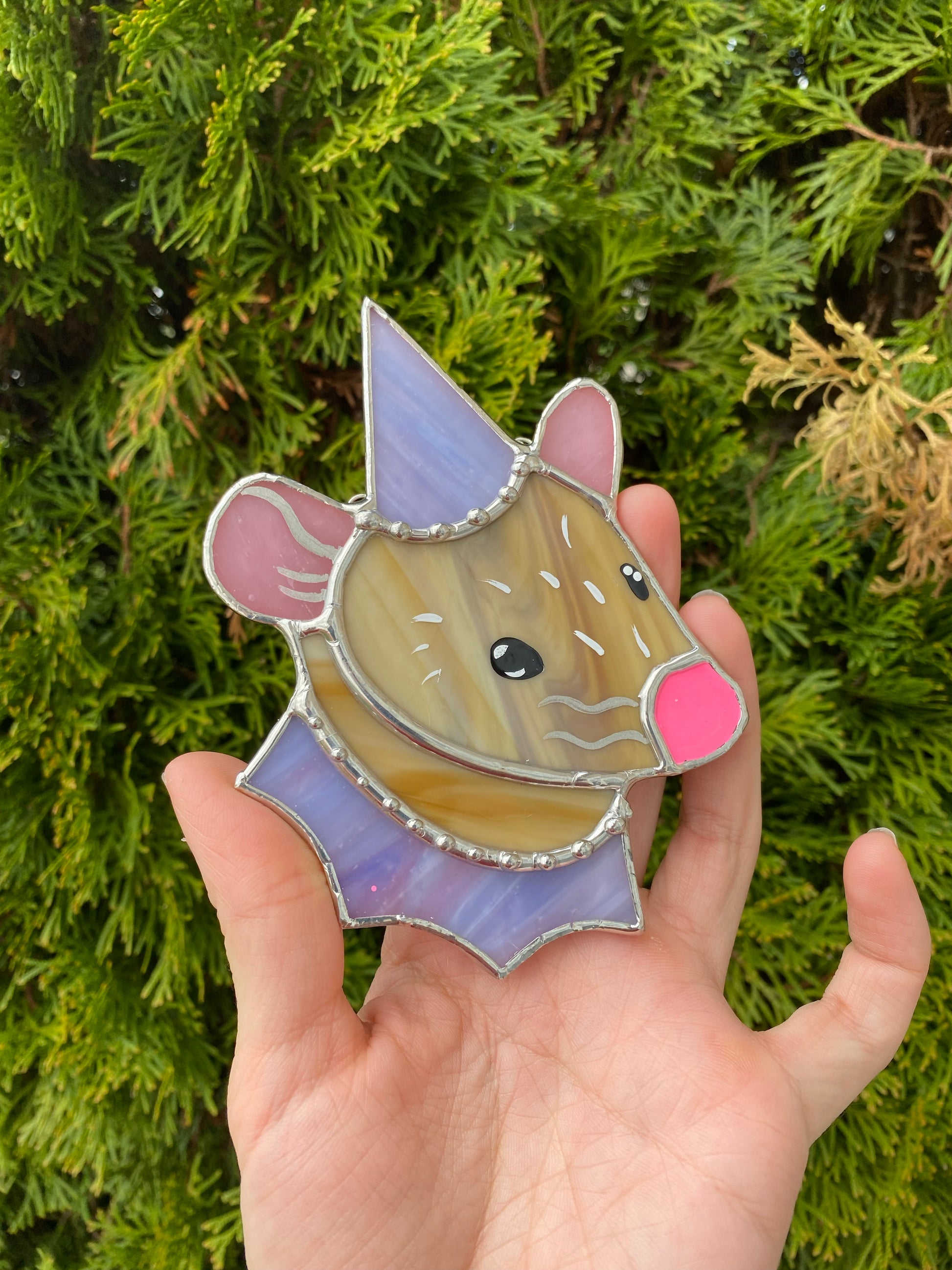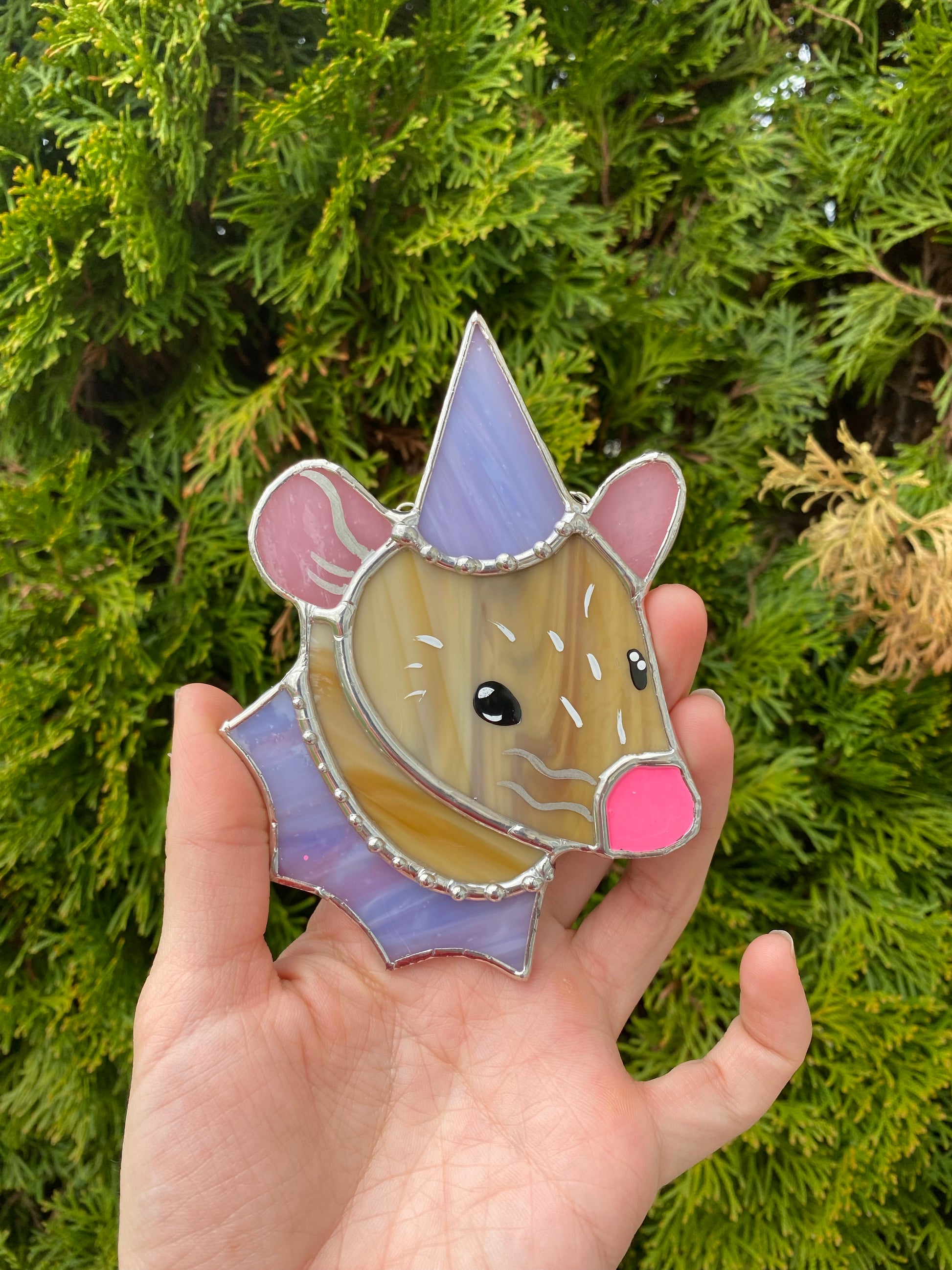 Silver and Pink Tan Wizard Rat Mini Stained Glass Suncatcher