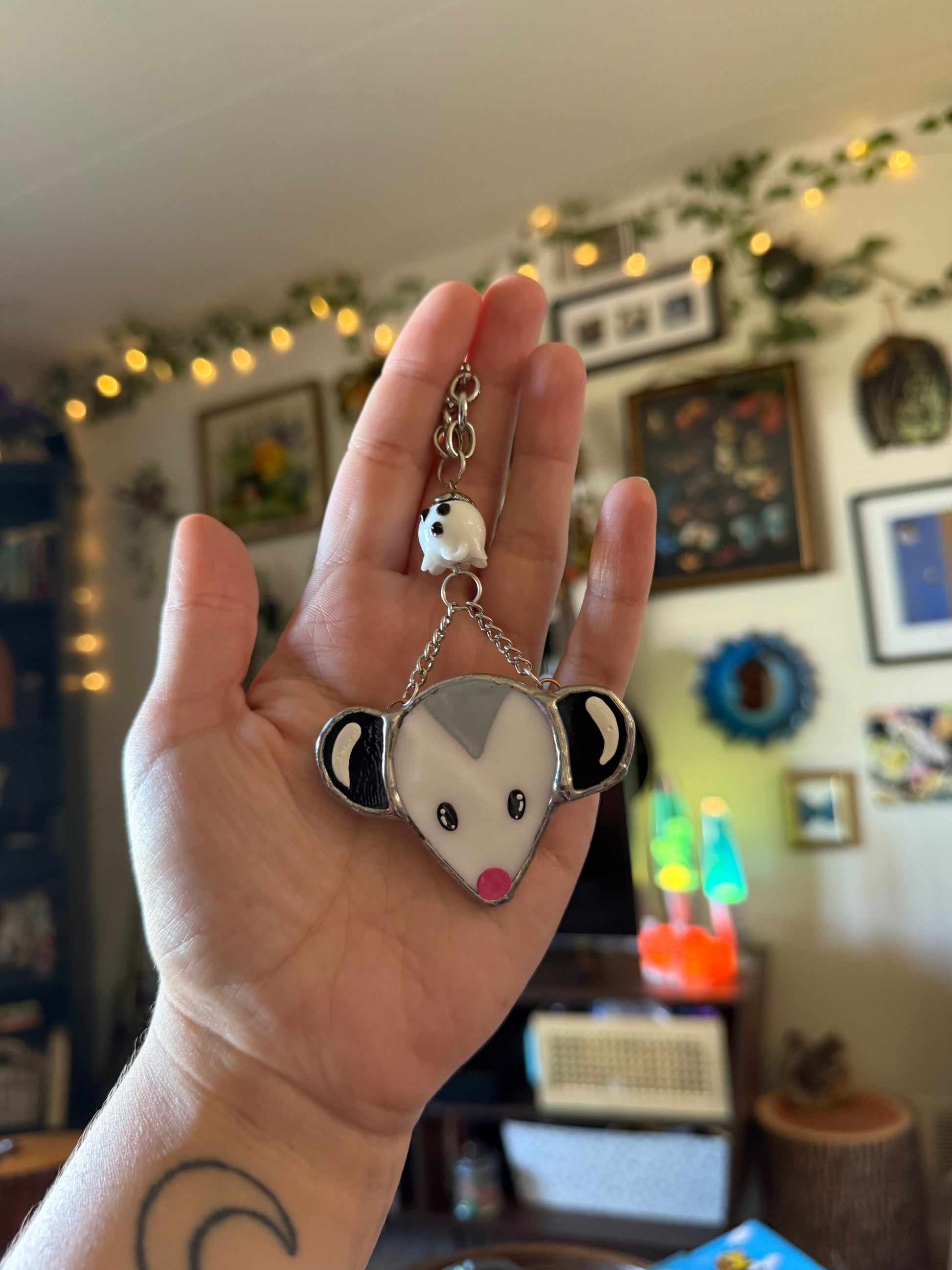 opossum with ghost charm and silver chain. Has a clasp for easy hanging around rear view mirror.