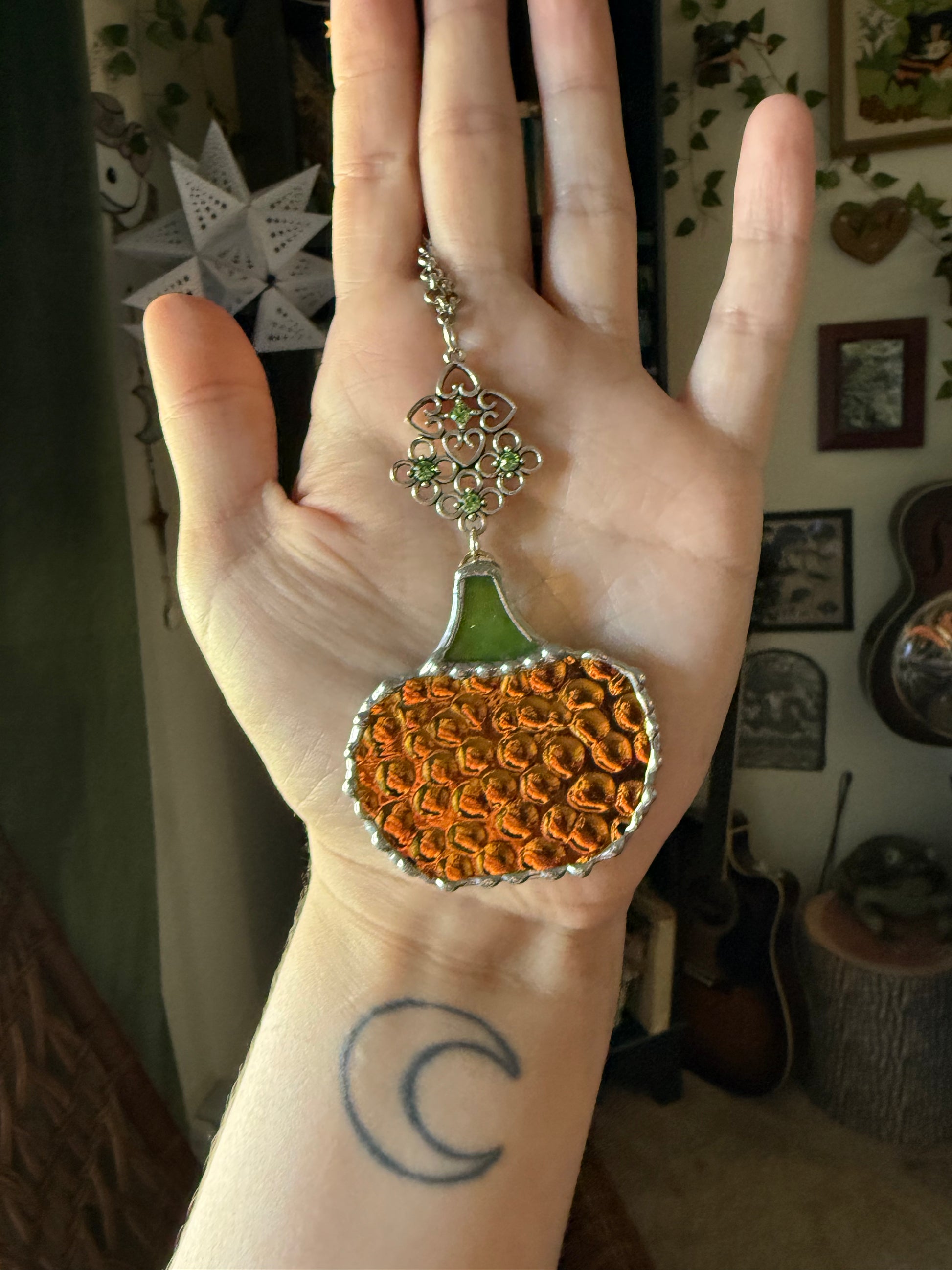 orange to green dichroic pumpkin with green and silver ornate charm and silver chain. Has a clasp for easy hanging around rear view mirror.