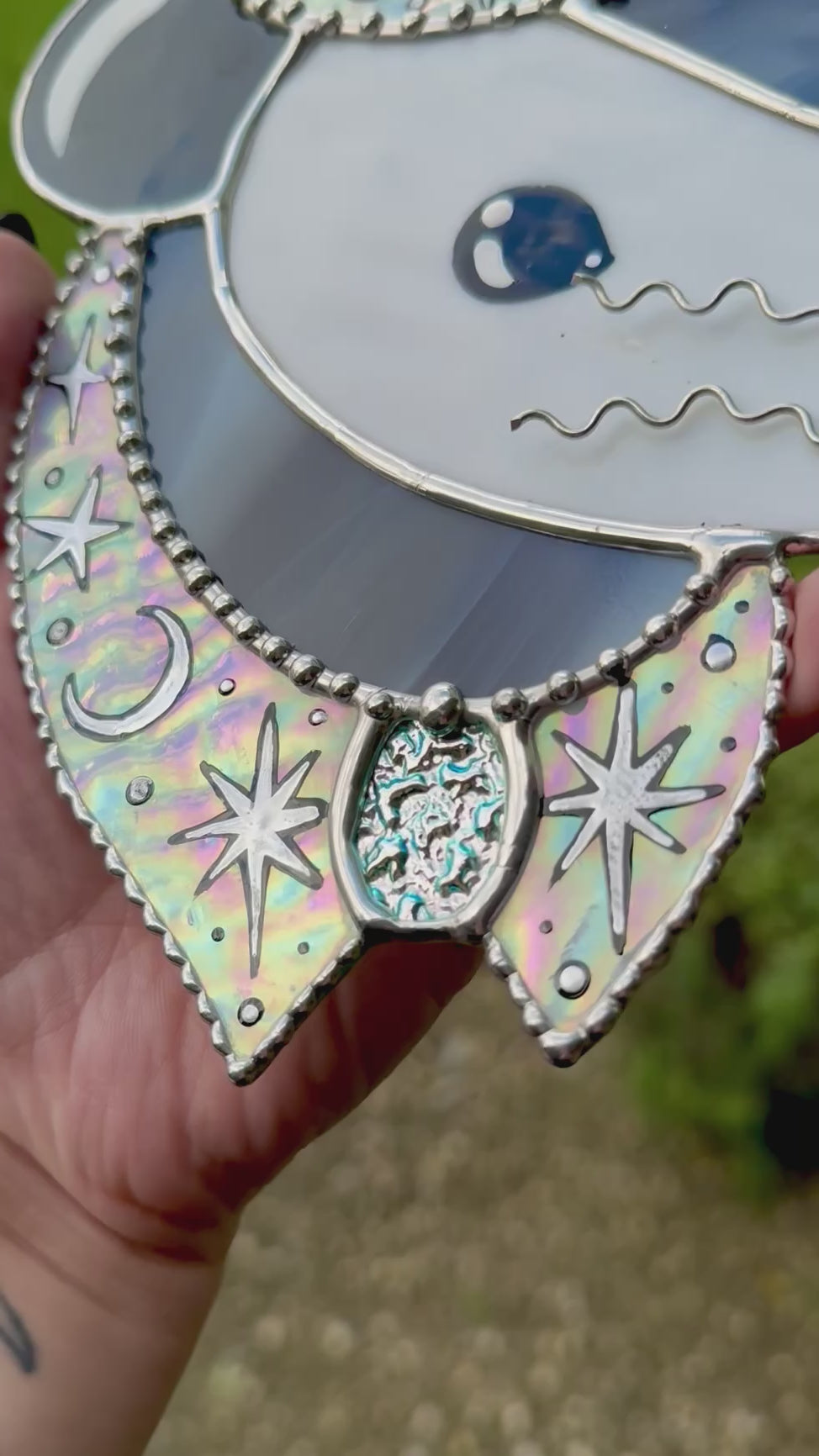 One of a kind! Measures 8.5” tall and 6” wide. Painted details on white iridescent ripple glass and a silver dichroic bolo tie. Has a silver chain for hanging. Ships via USPS. Each suncatcher is packaged with care to ensure it arrives safe.