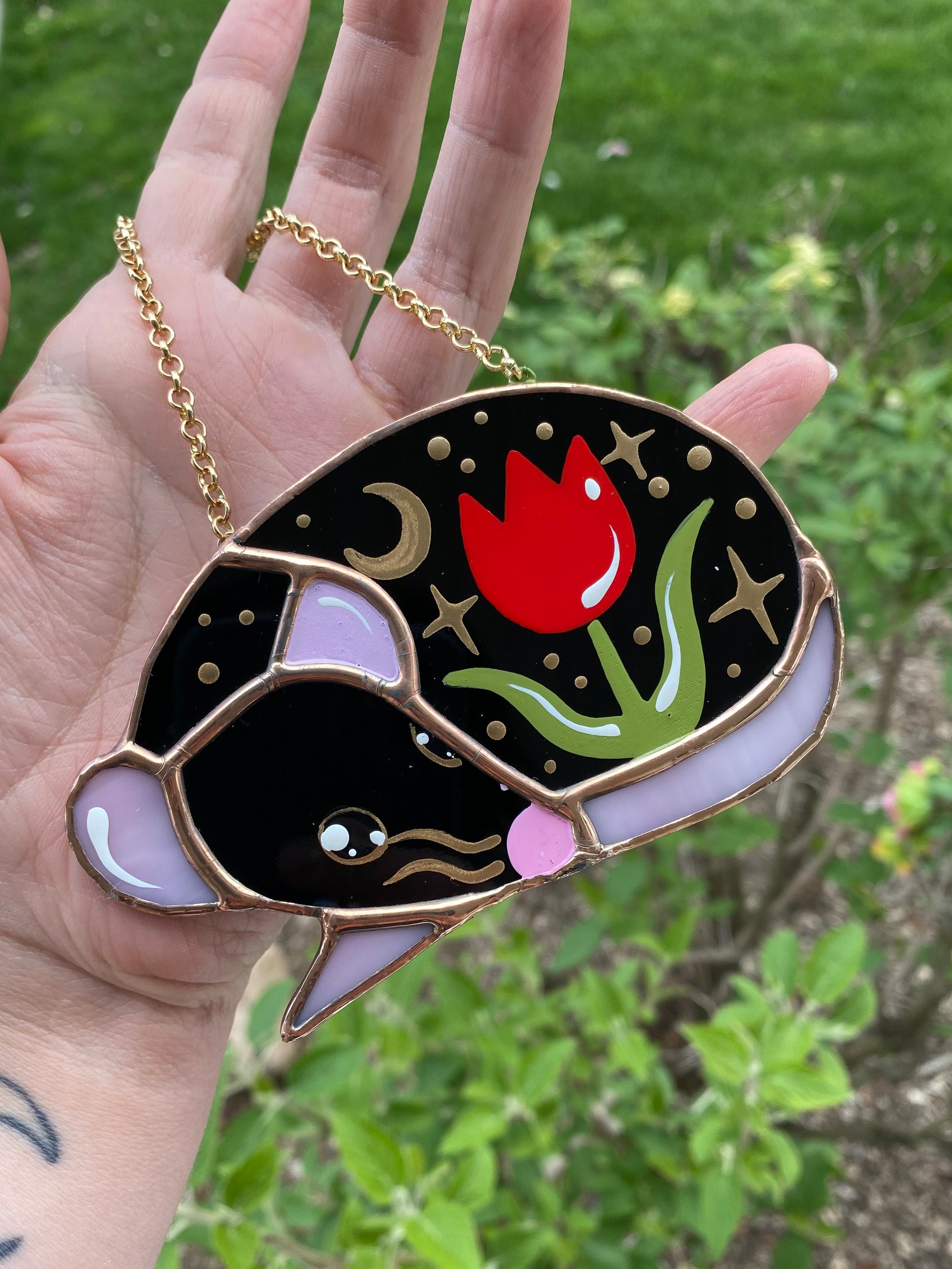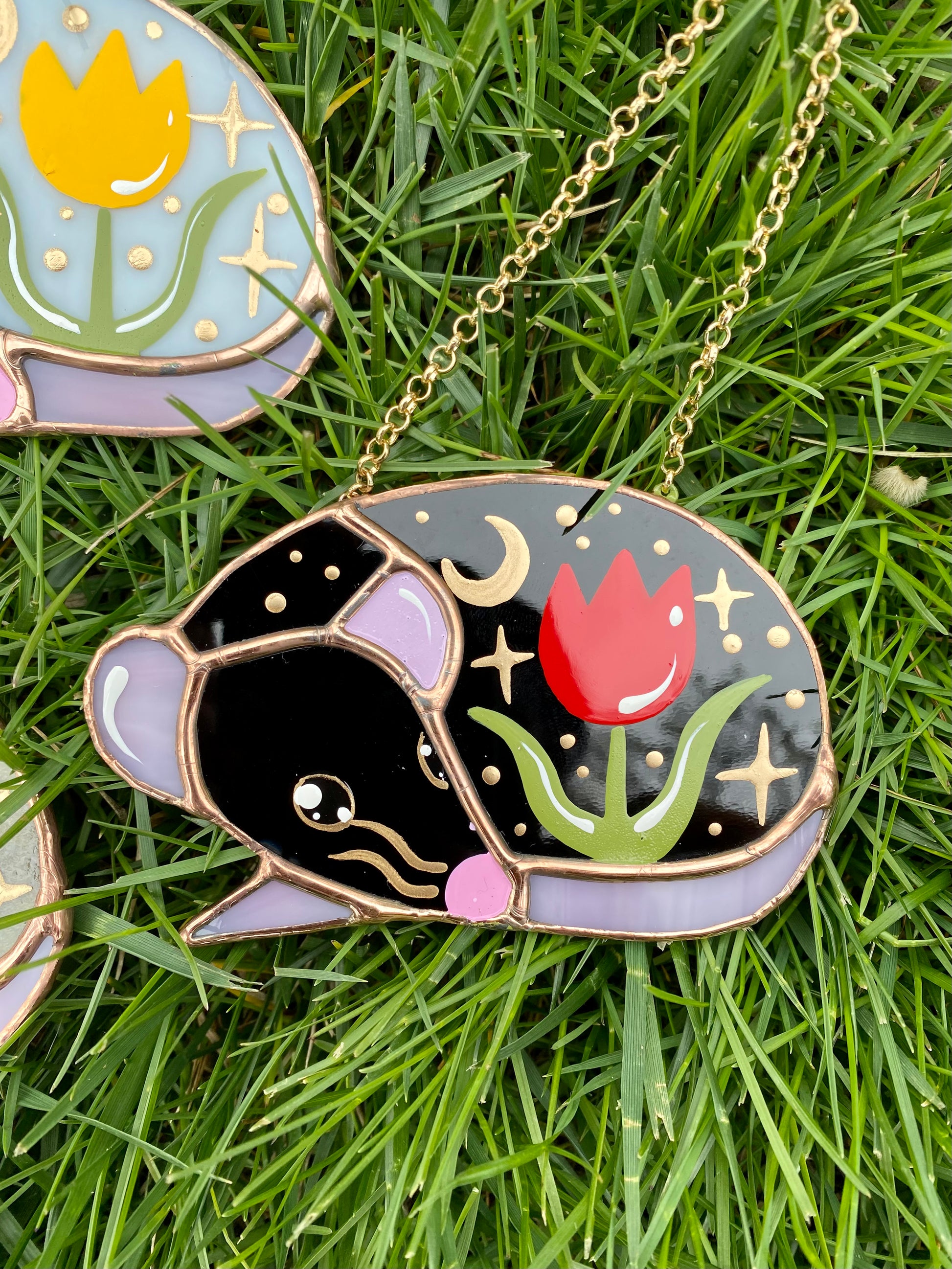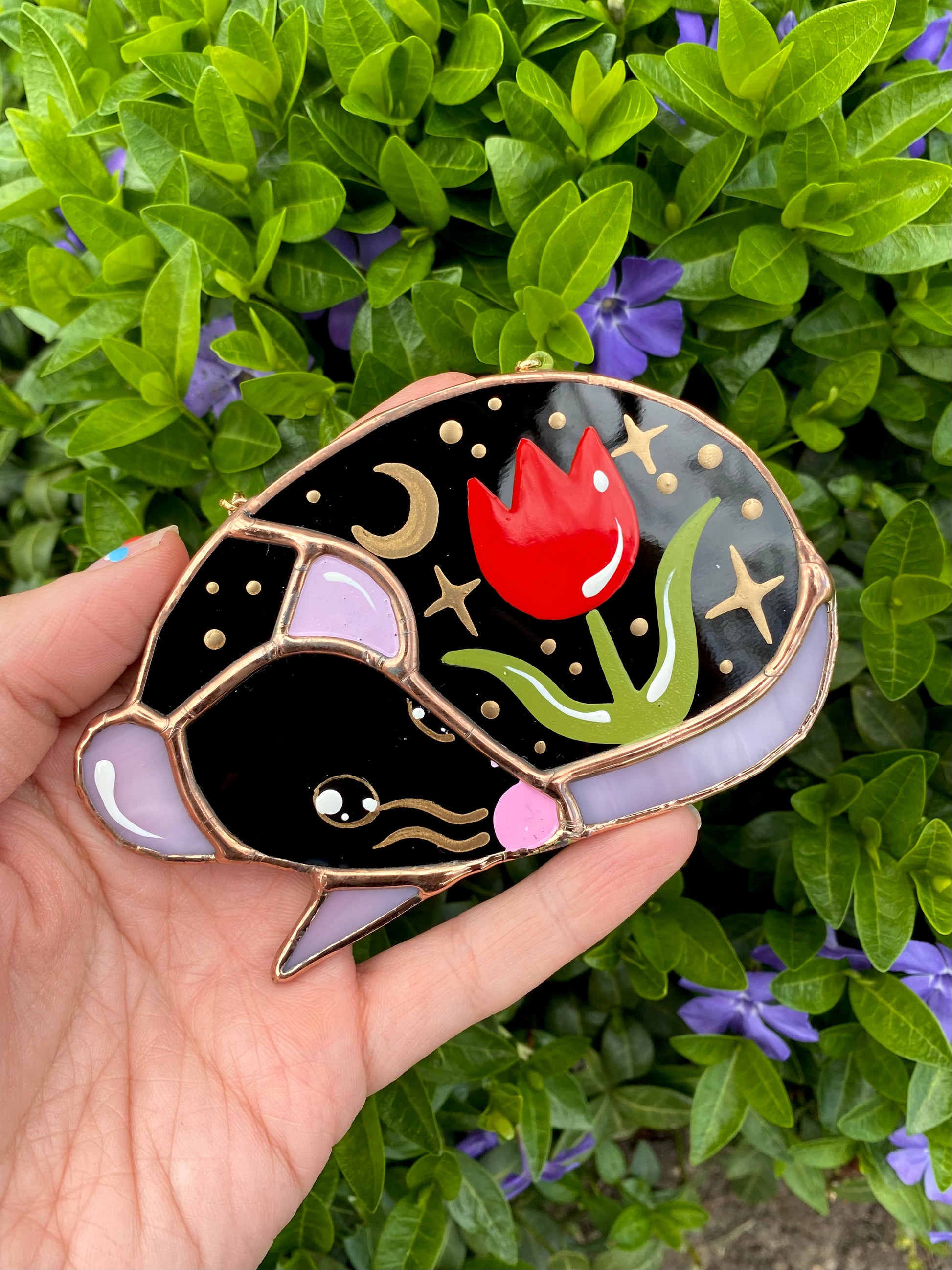 Sleepy Black Tulip Rat Mini Stained Glass Ornament