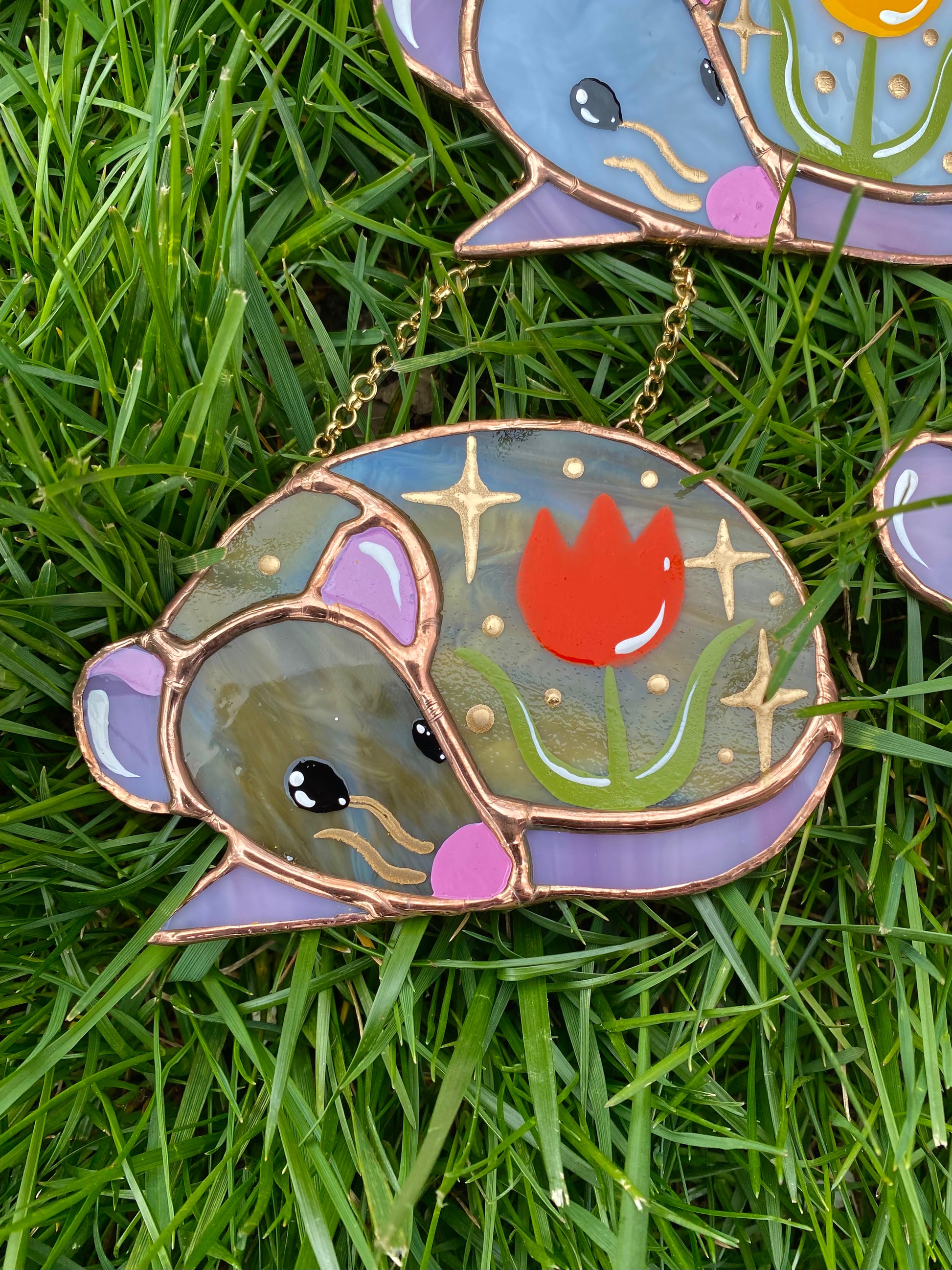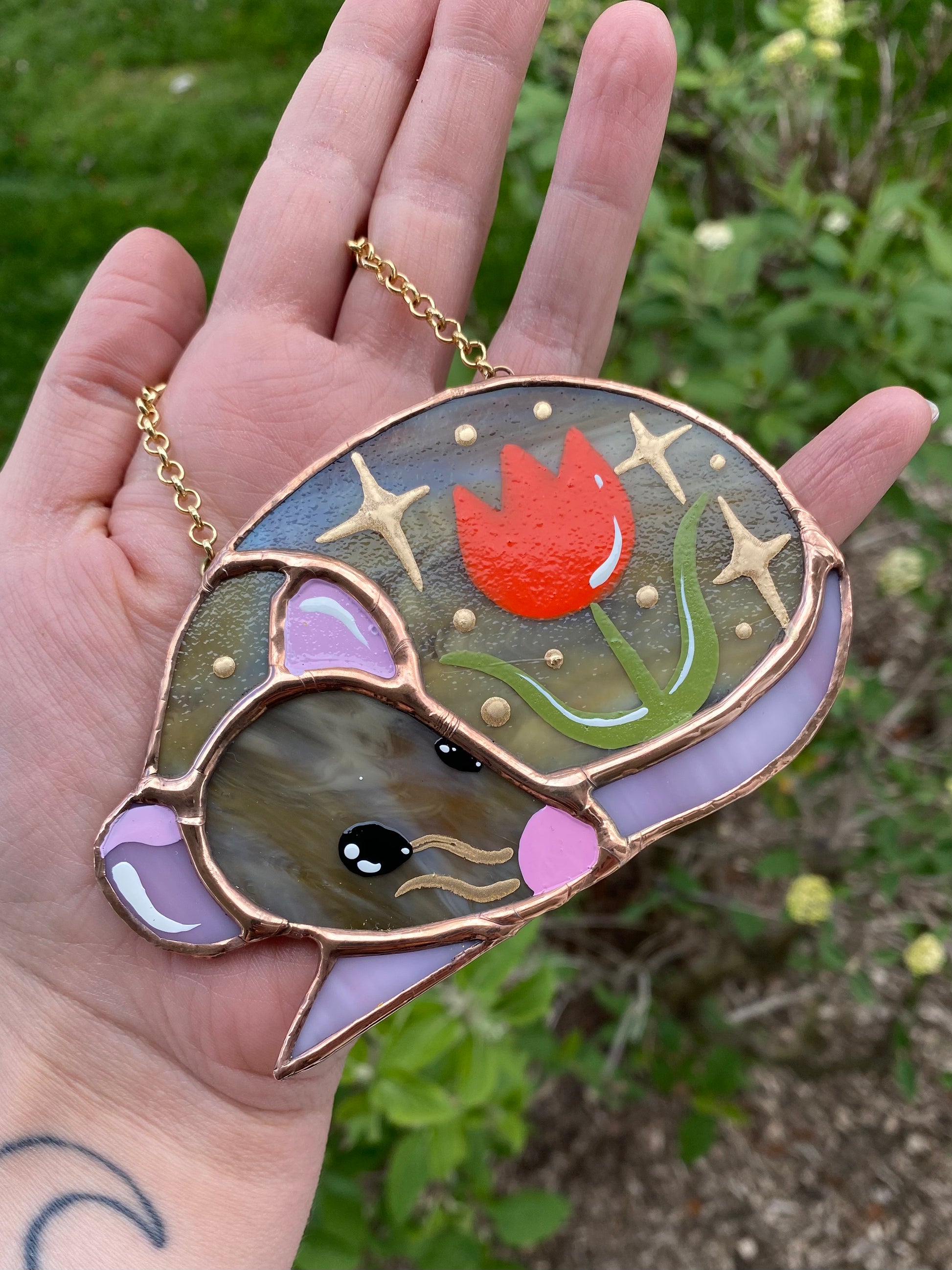 Sleepy Brown Tulip Rat Mini Stained Glass Ornament