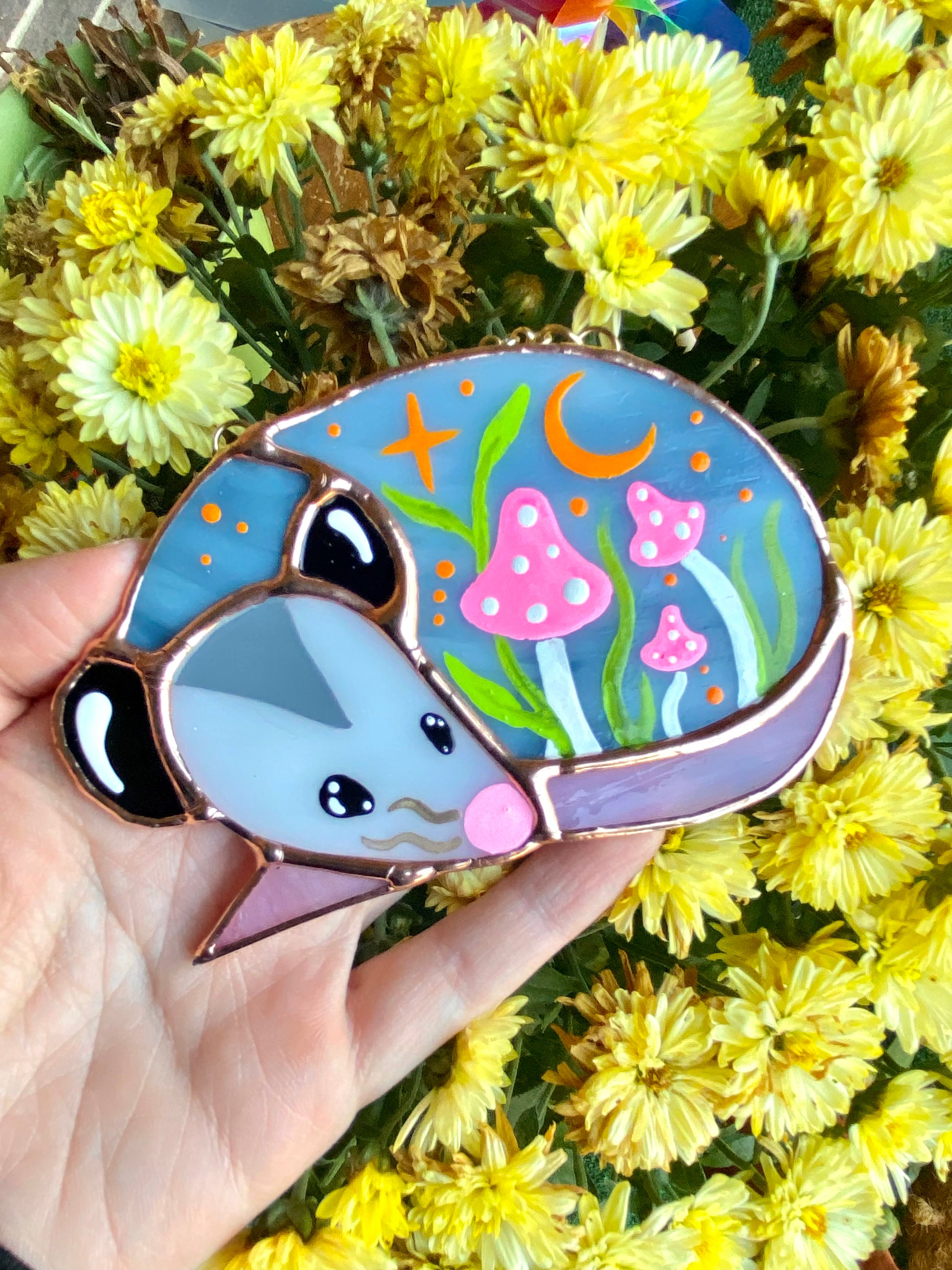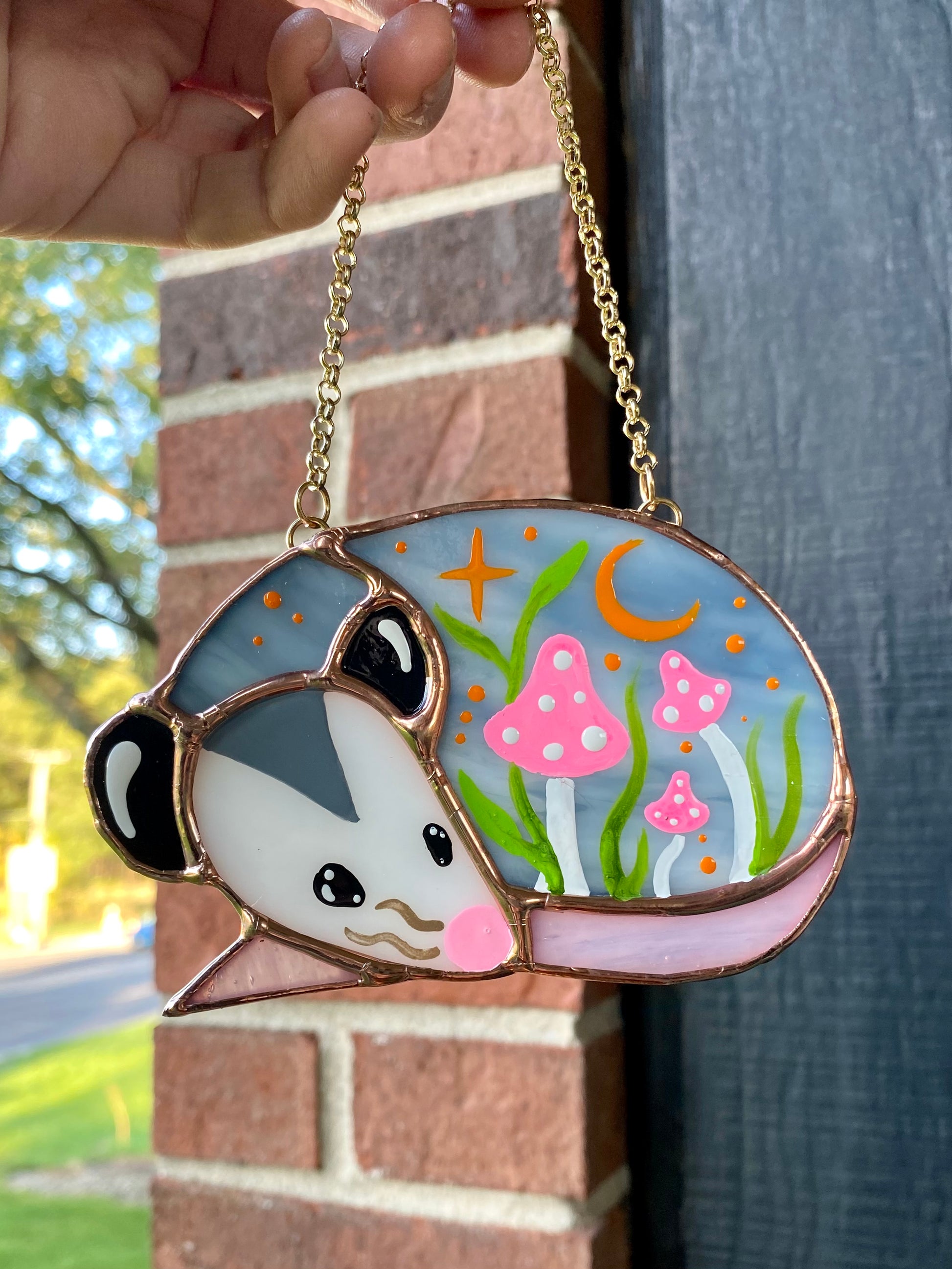Sleepy Pink Mushroom Opossum Mini Stained Glass Suncatcher