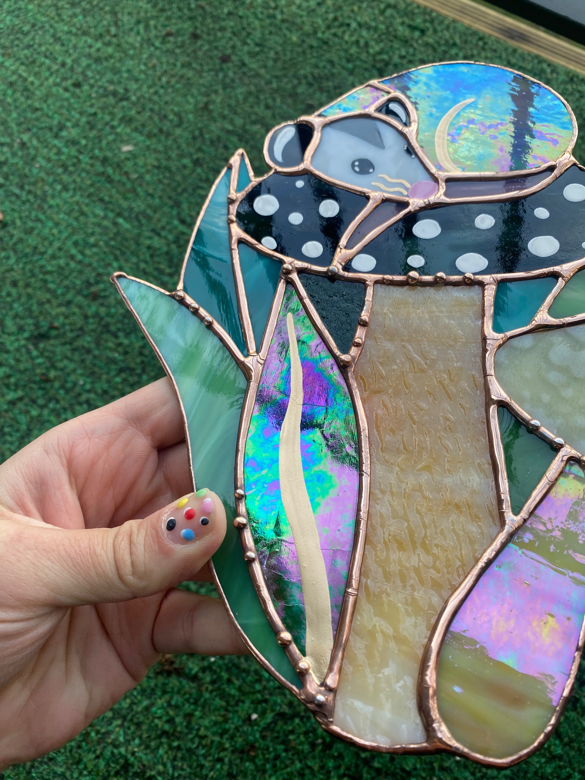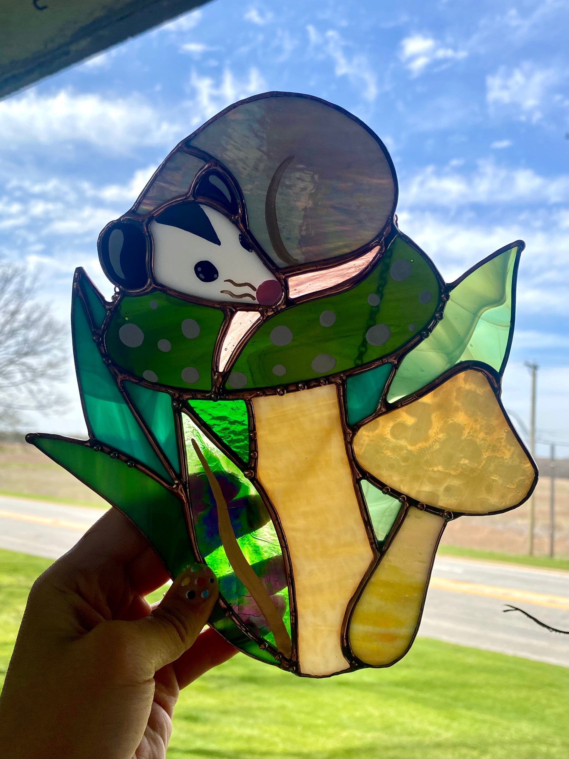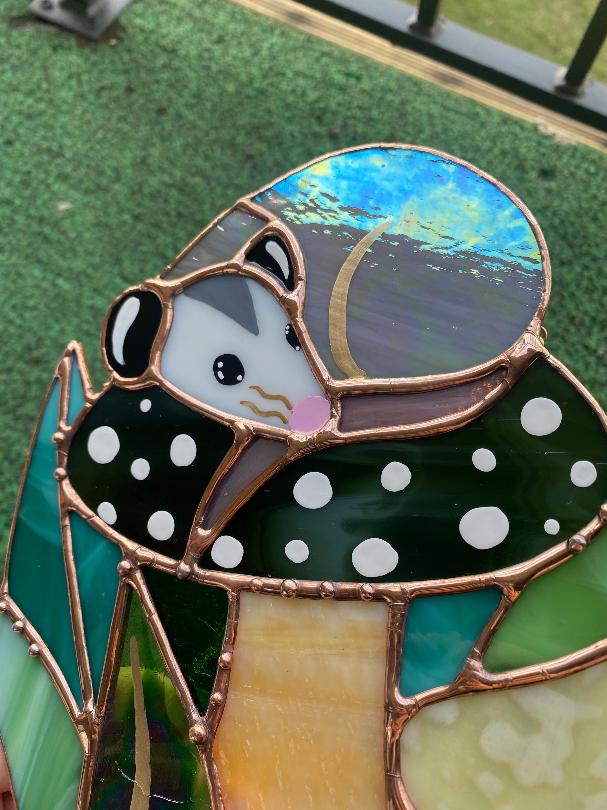 Sleepy Opossum Mushroom Stained Glass Suncatcher