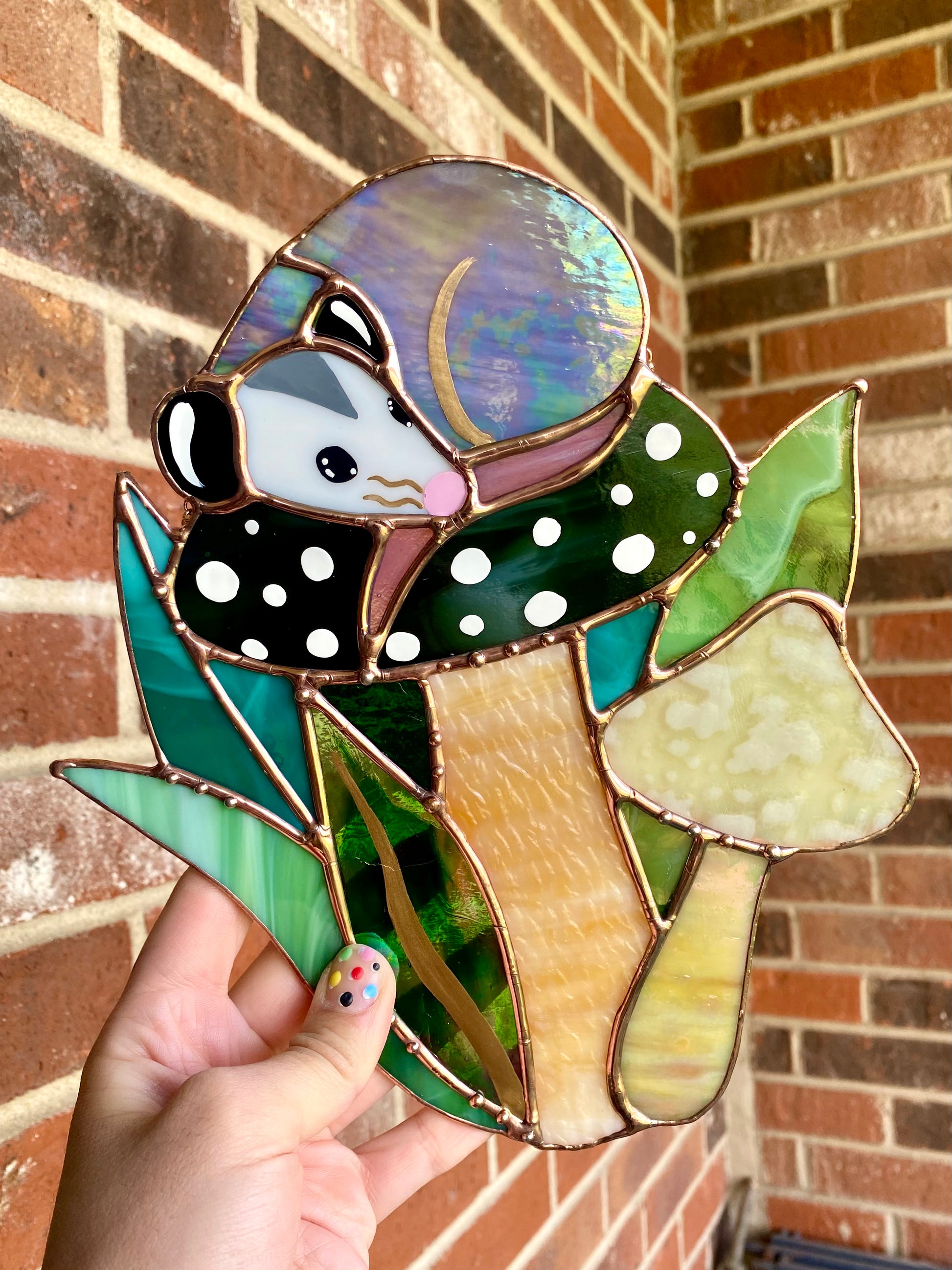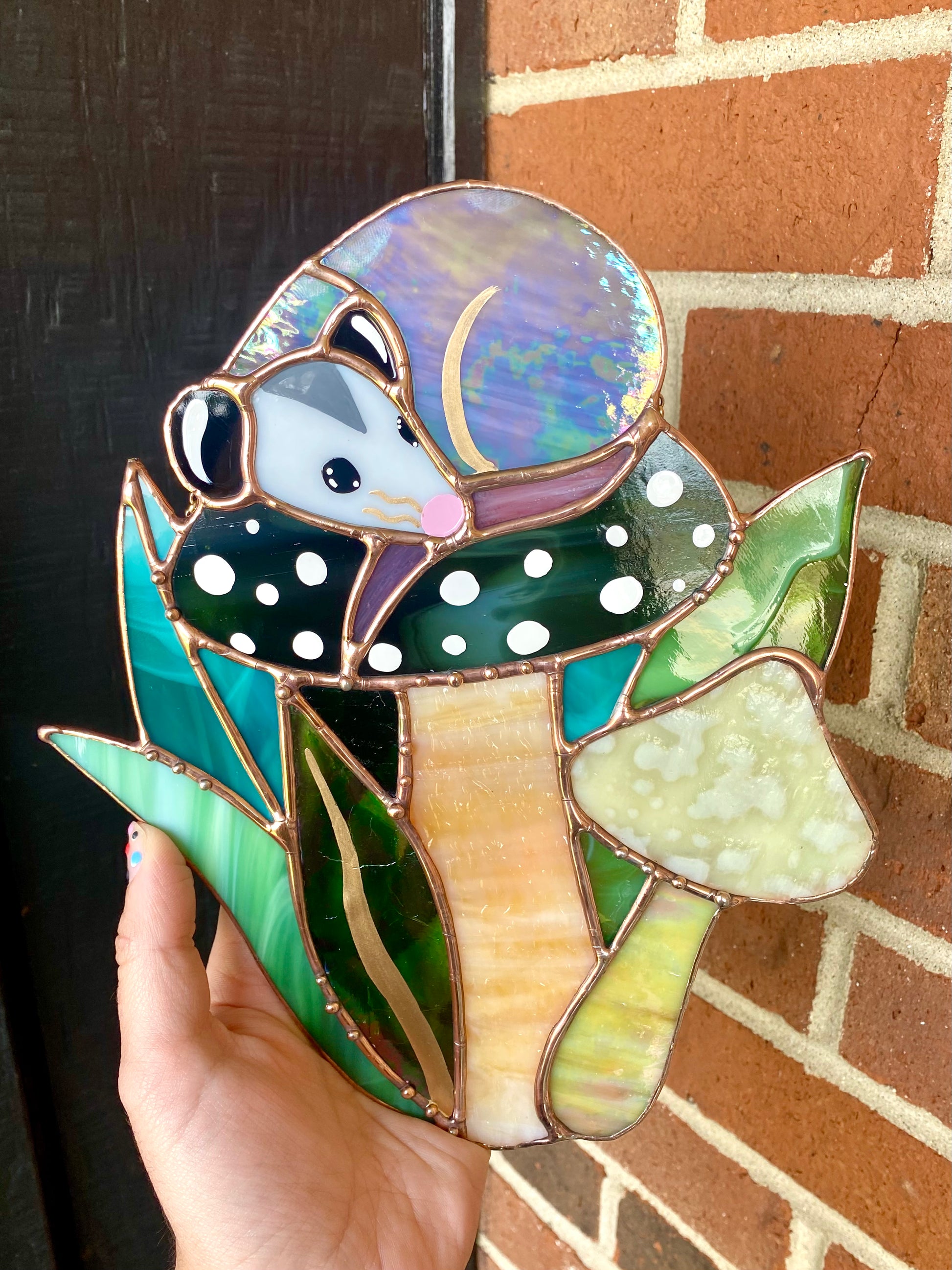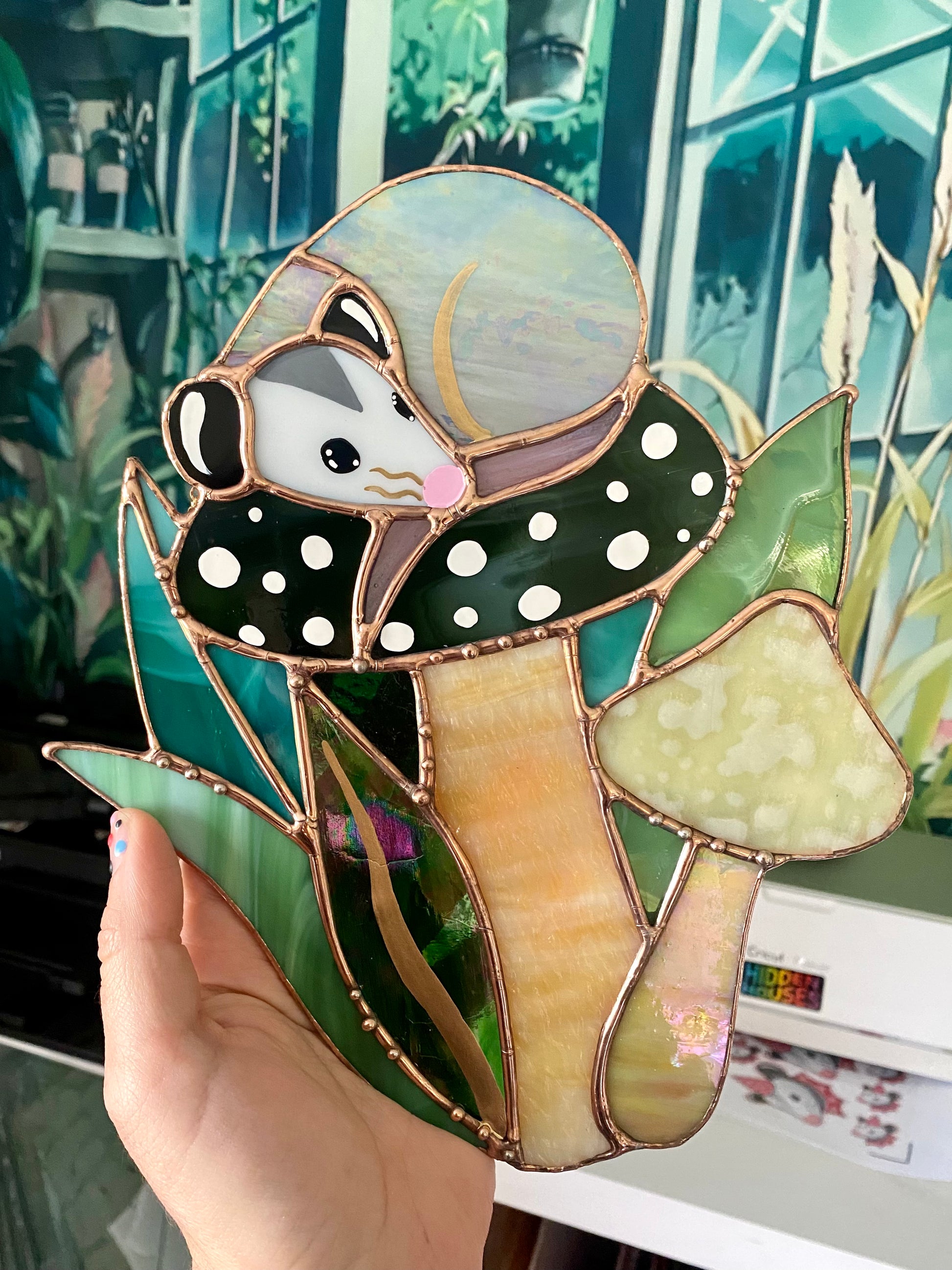 Sleepy Opossum Mushroom Stained Glass Suncatcher