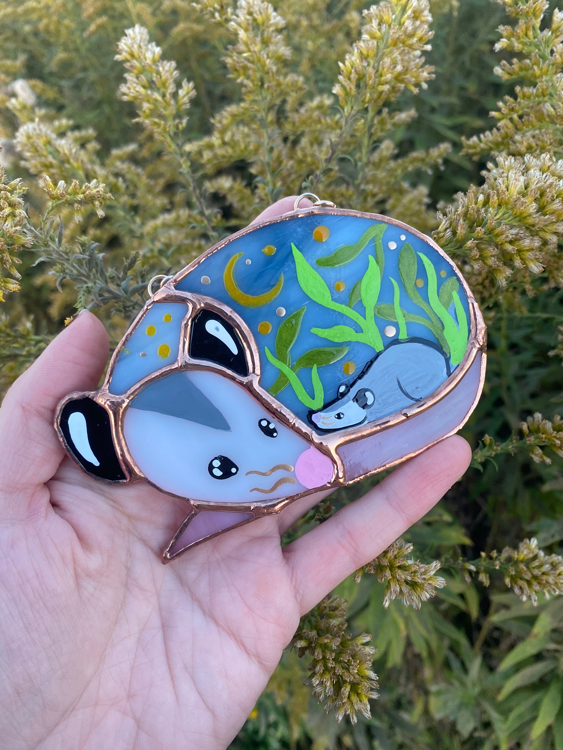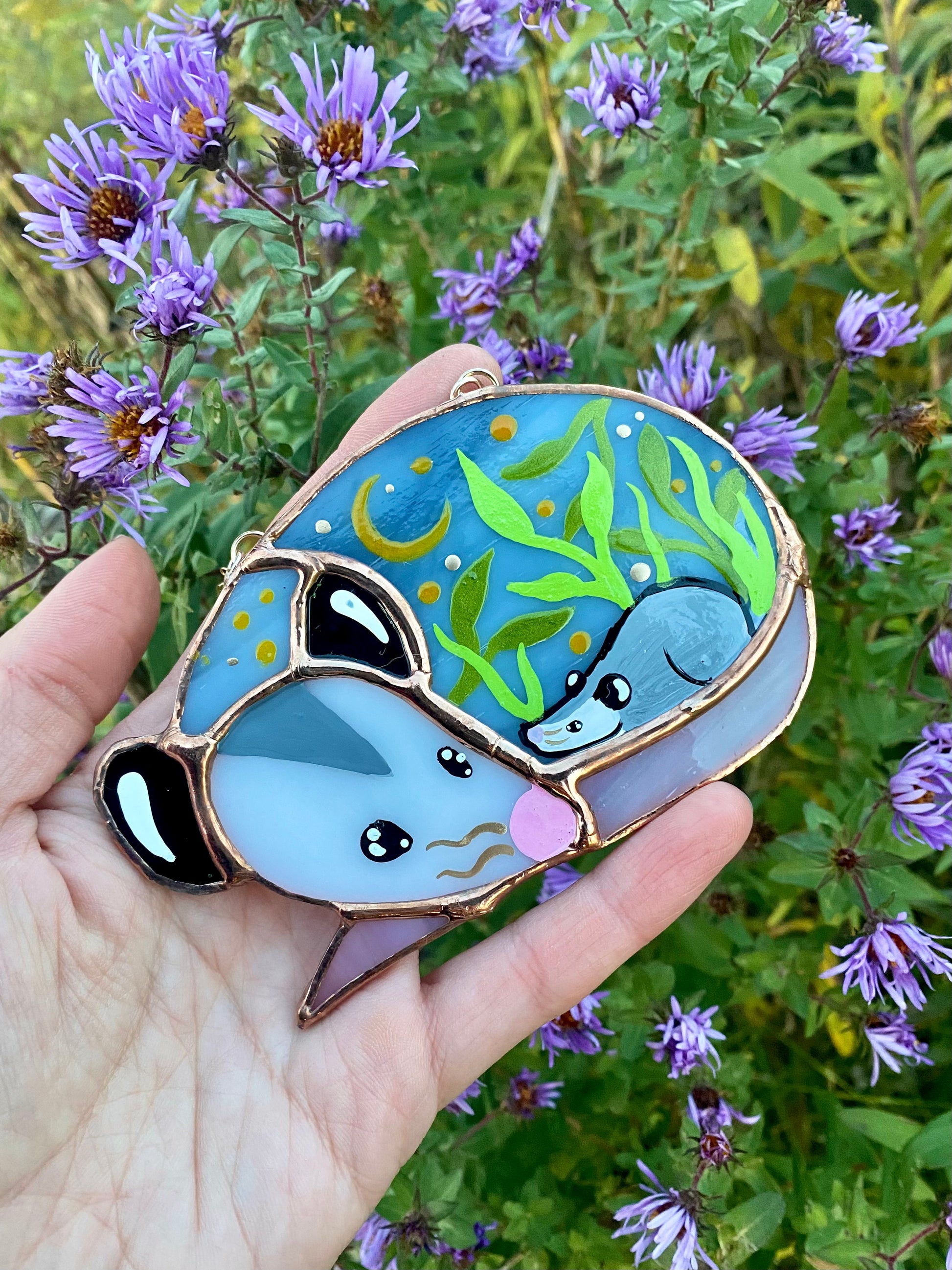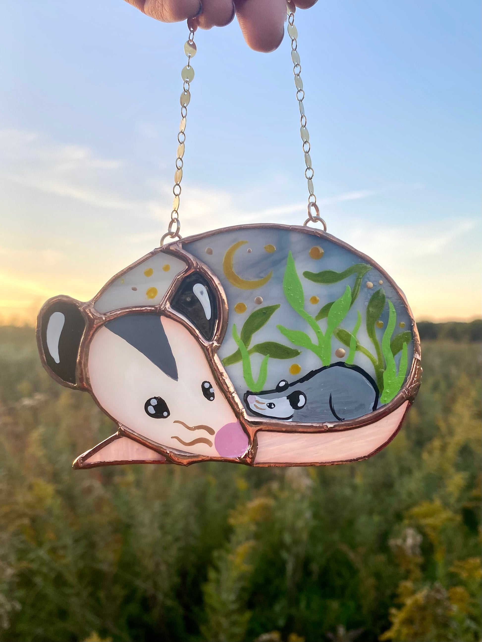 Sleepy Opossum with Baby. Mini Suncatcher Ornament