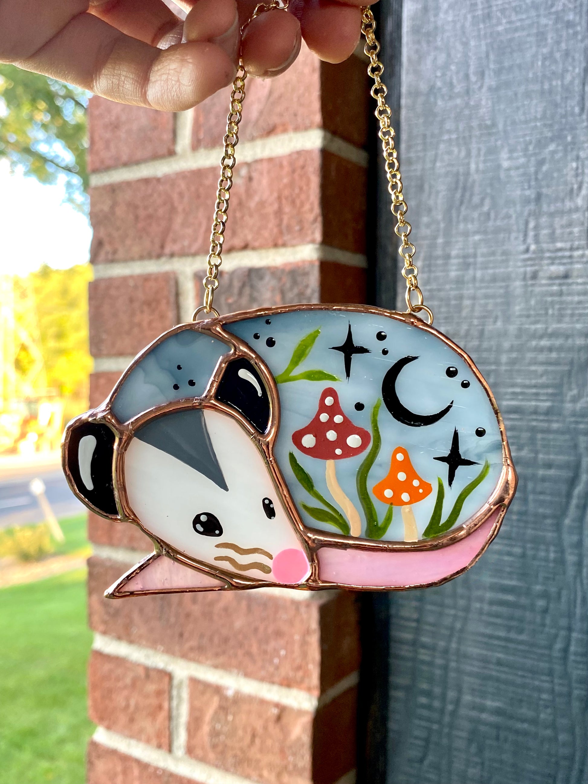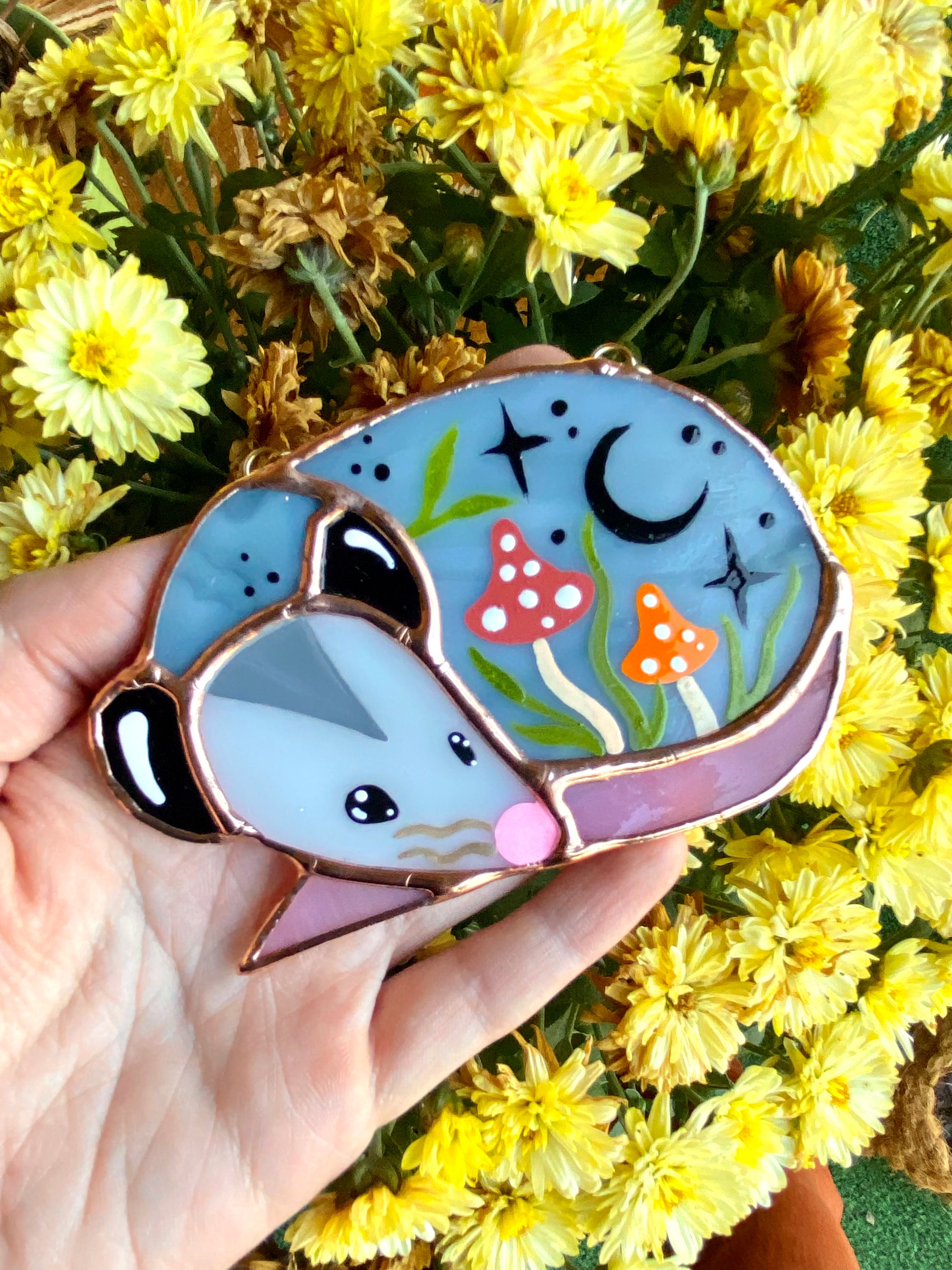 Sleepy Red and Orange Mushroom Opossum Mini Stained Glass Suncatcher