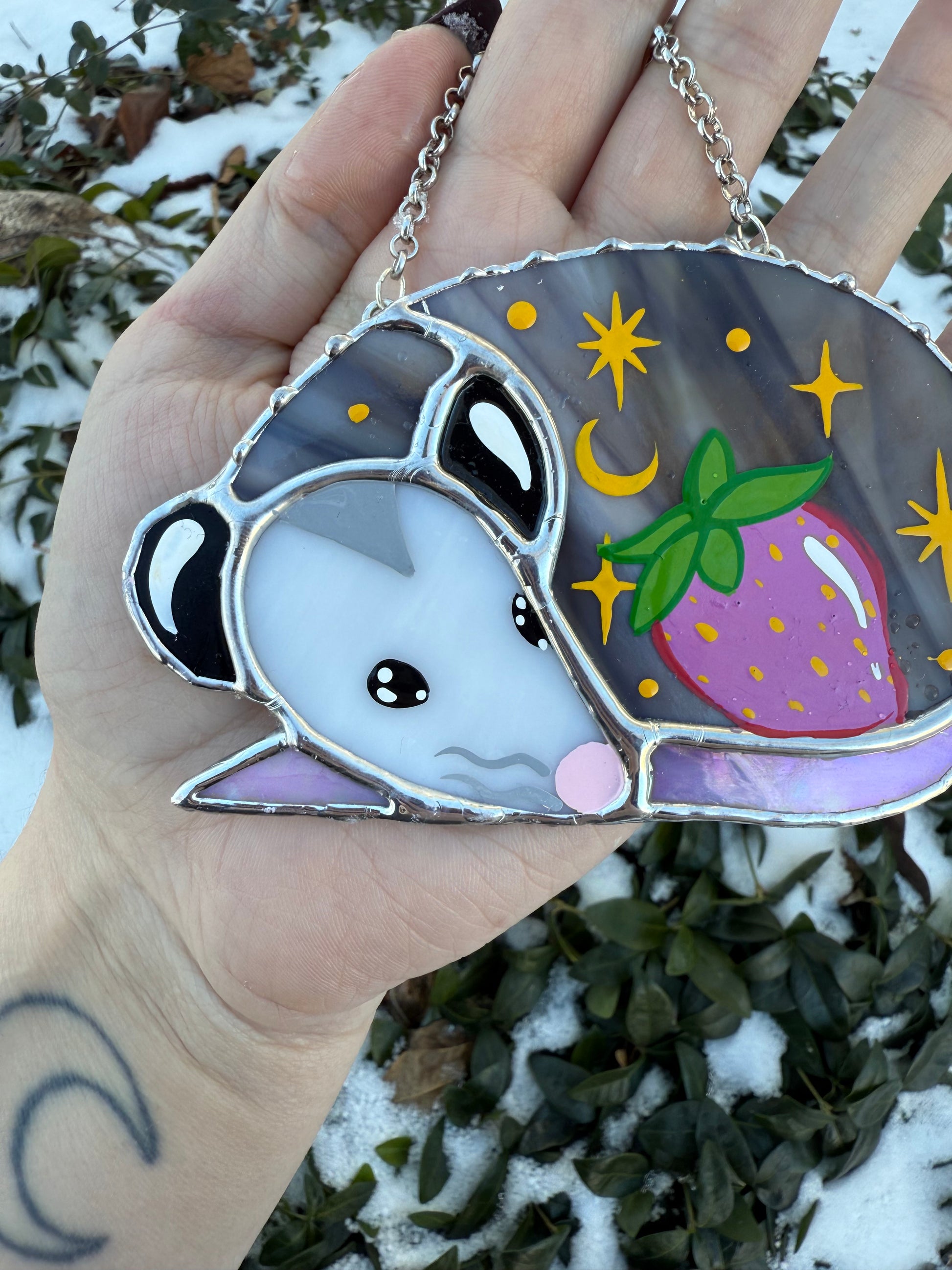 Sleepy Pink Strawberry Opossum Stained Glass Ornament