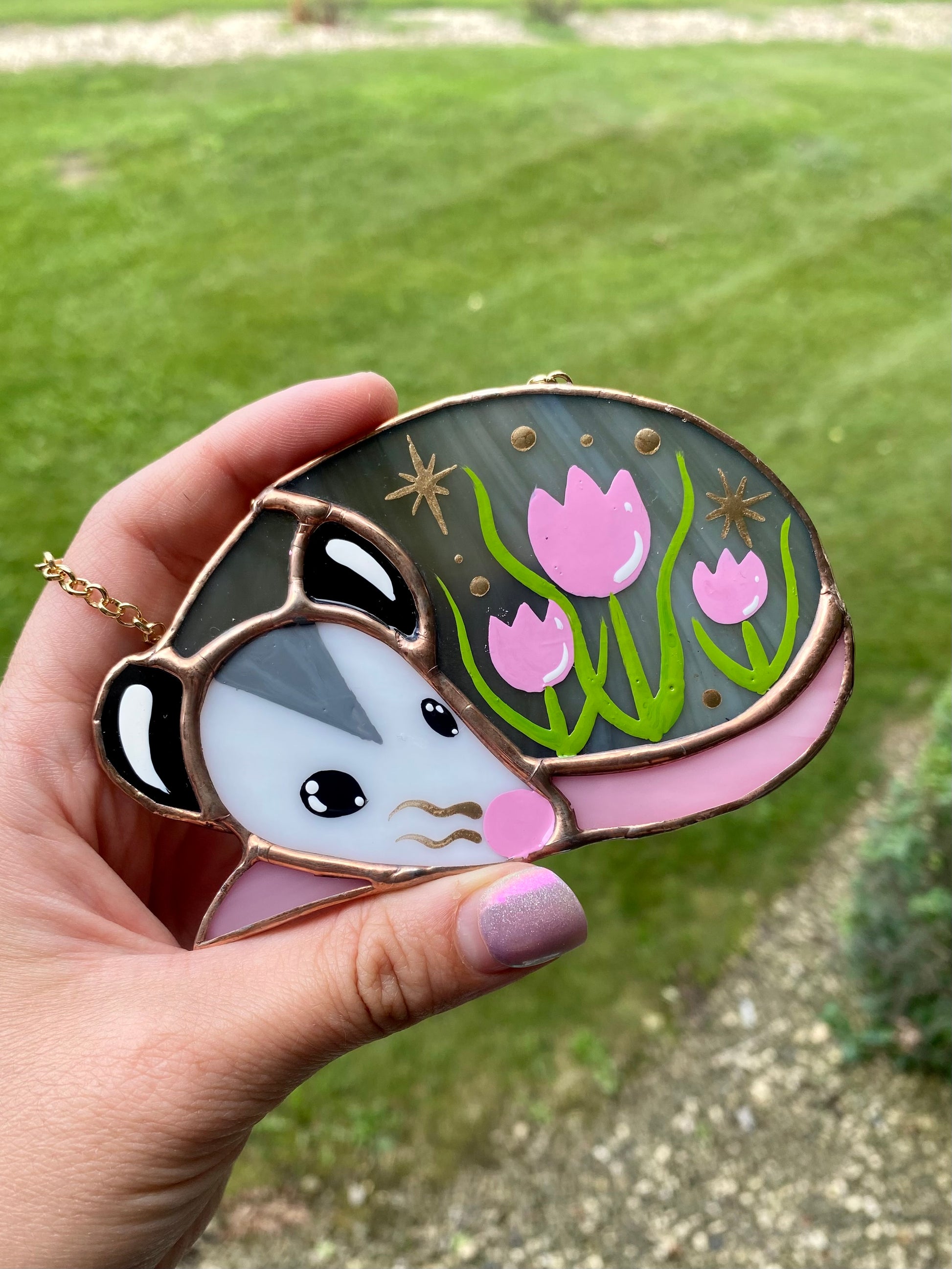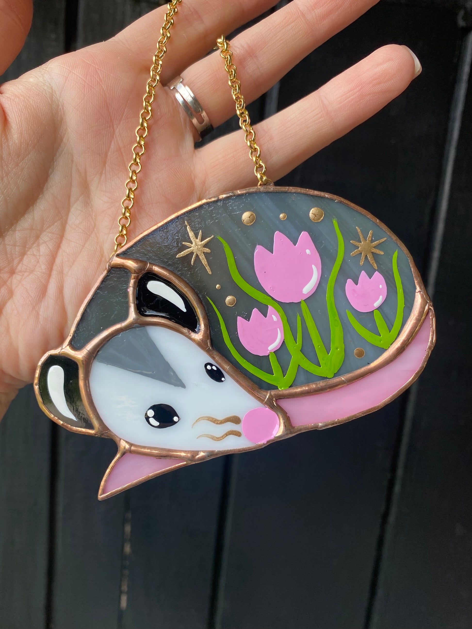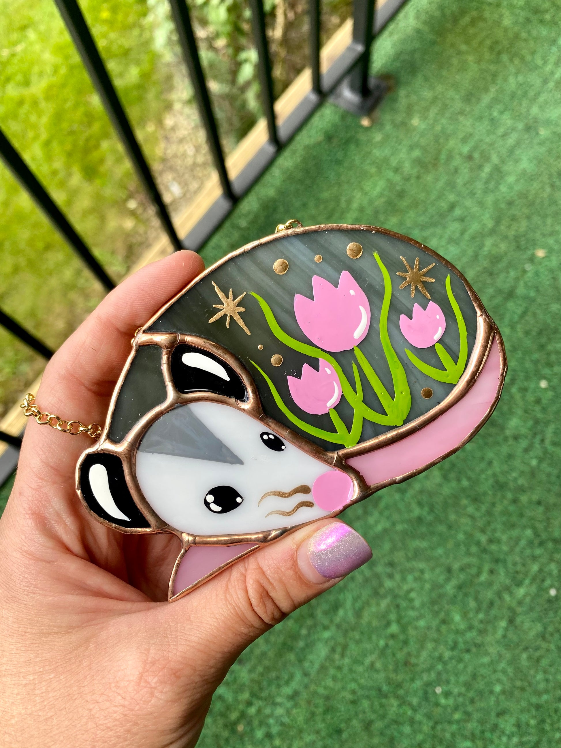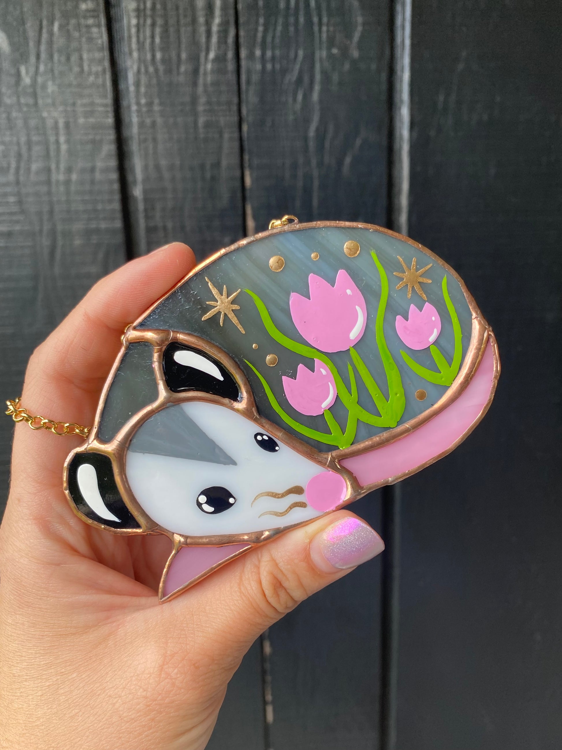 Sleepy Pink Tulip Opossum Stained Glass Ornament