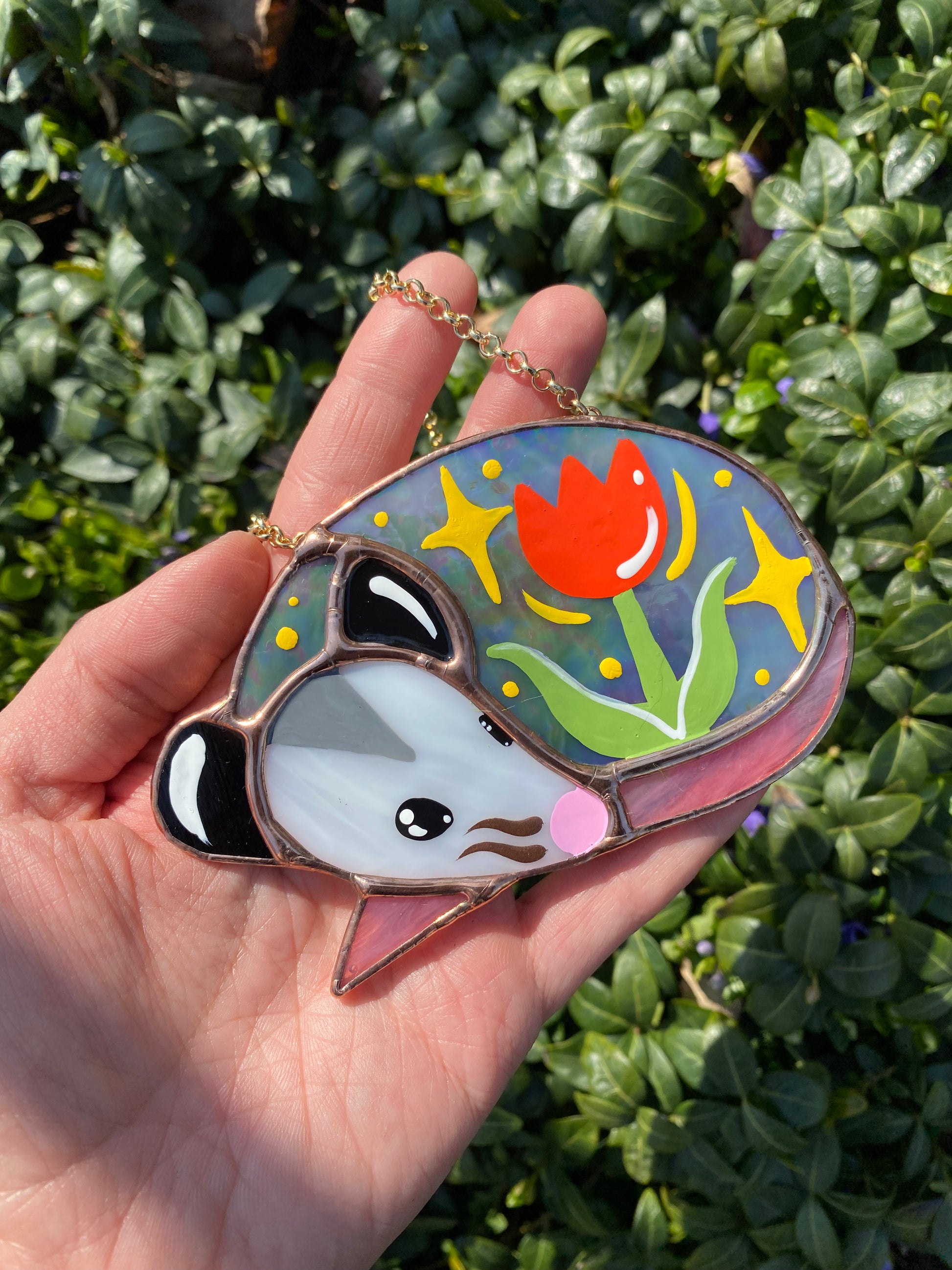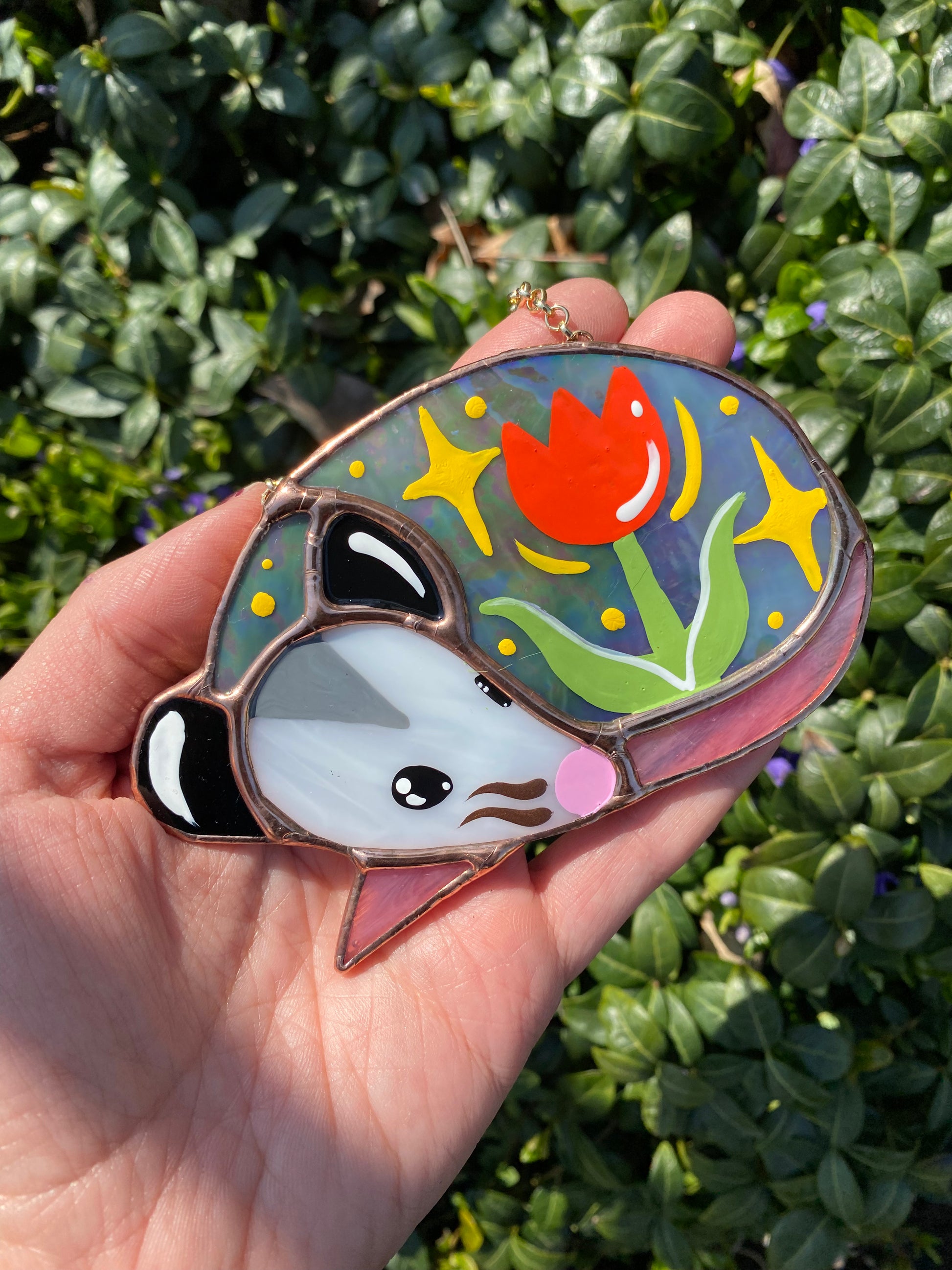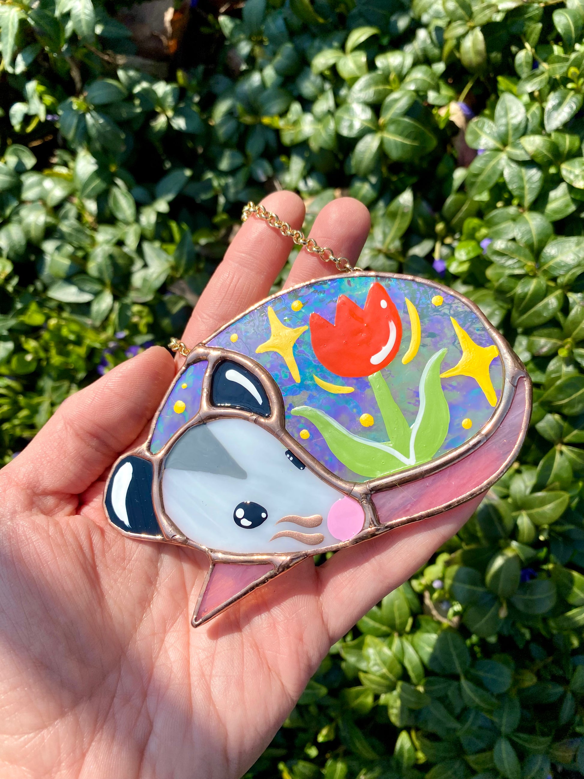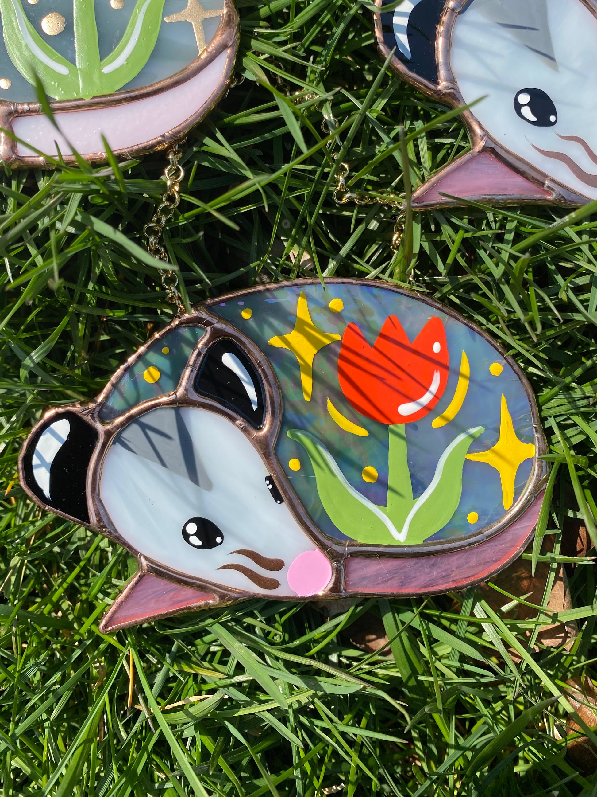 Sleepy Red Iridescent Tulip Opossum Stained Glass Ornament