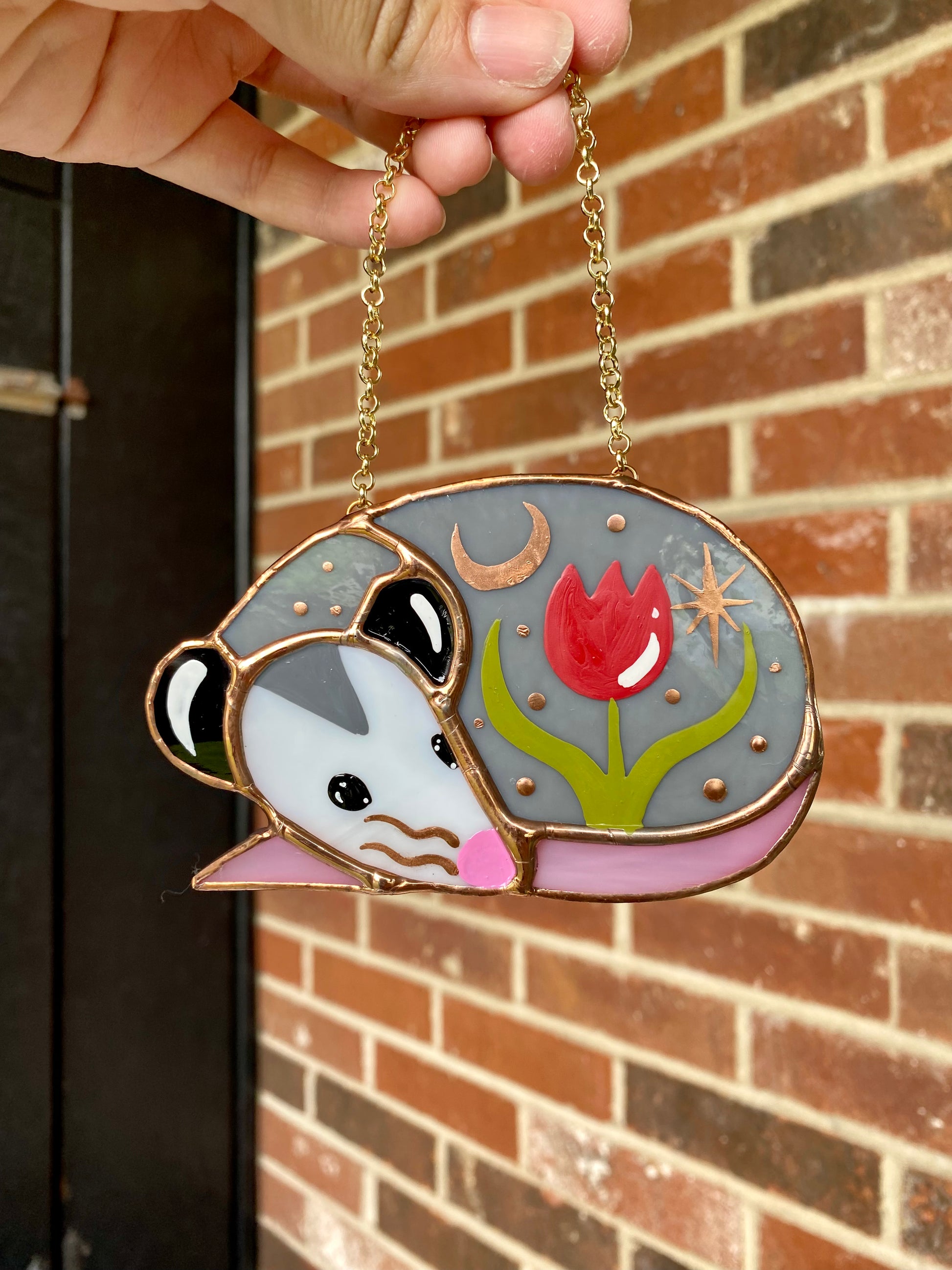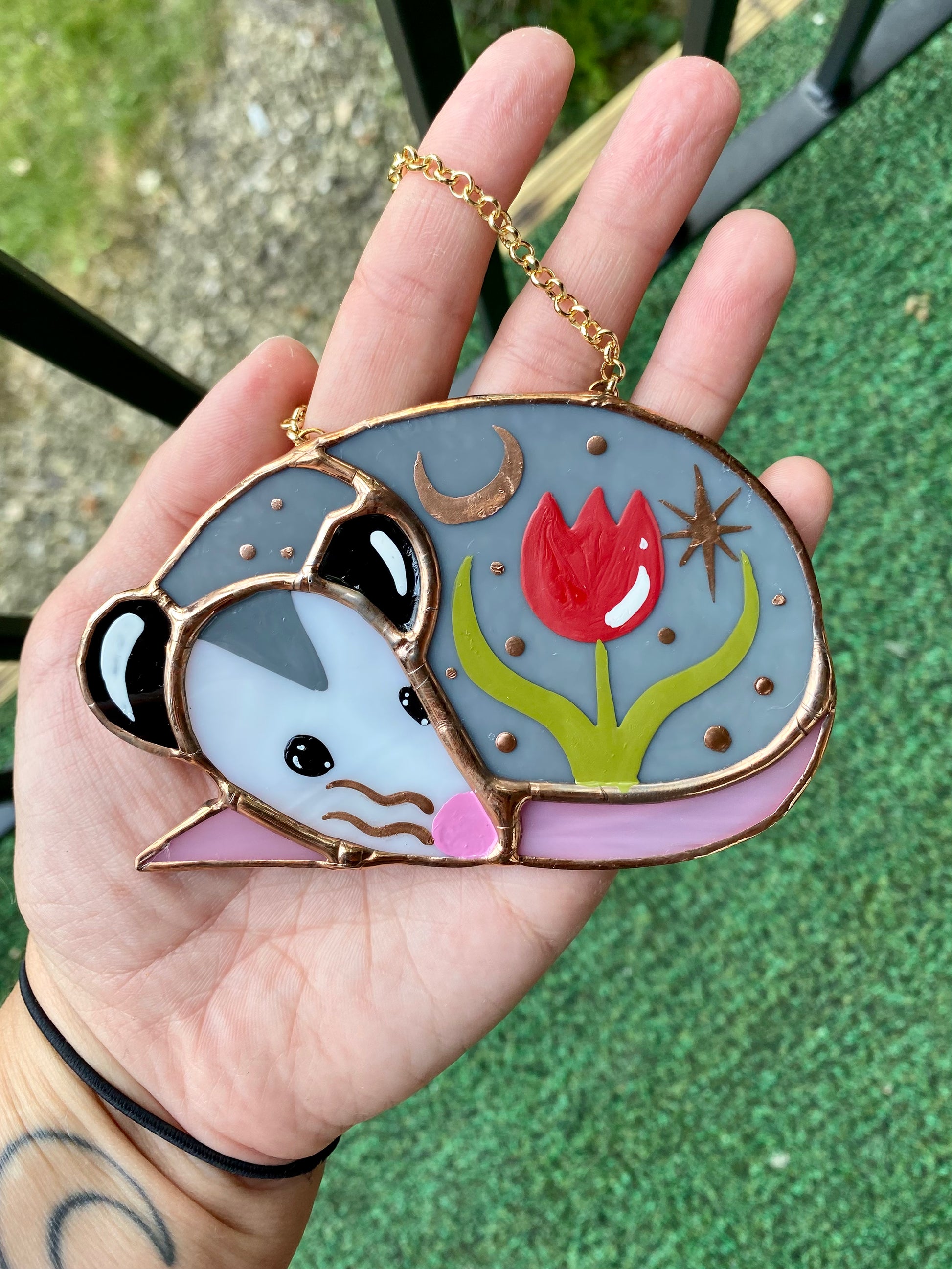 Sleepy Red Tulip Opossum Stained Glass Ornament