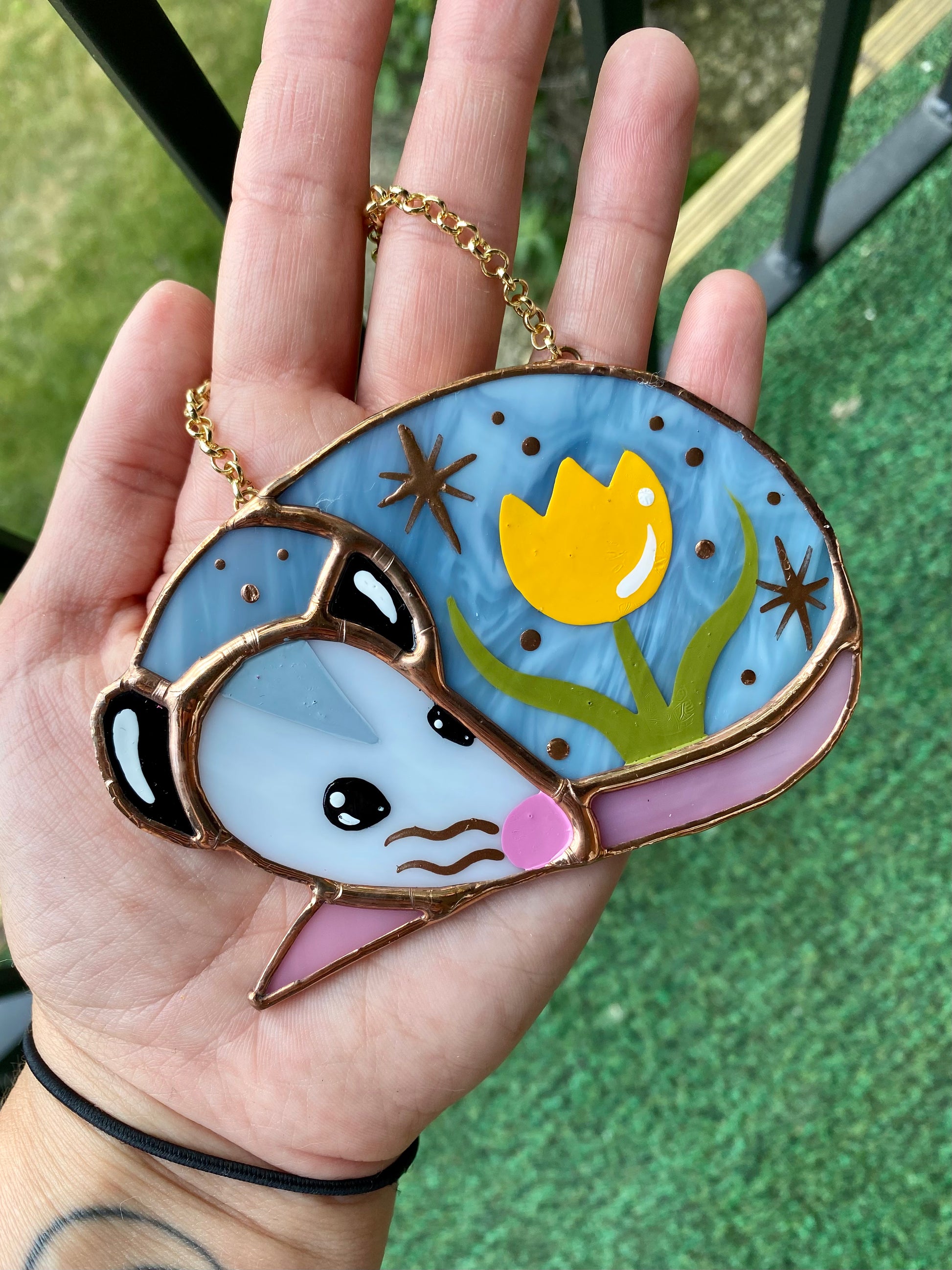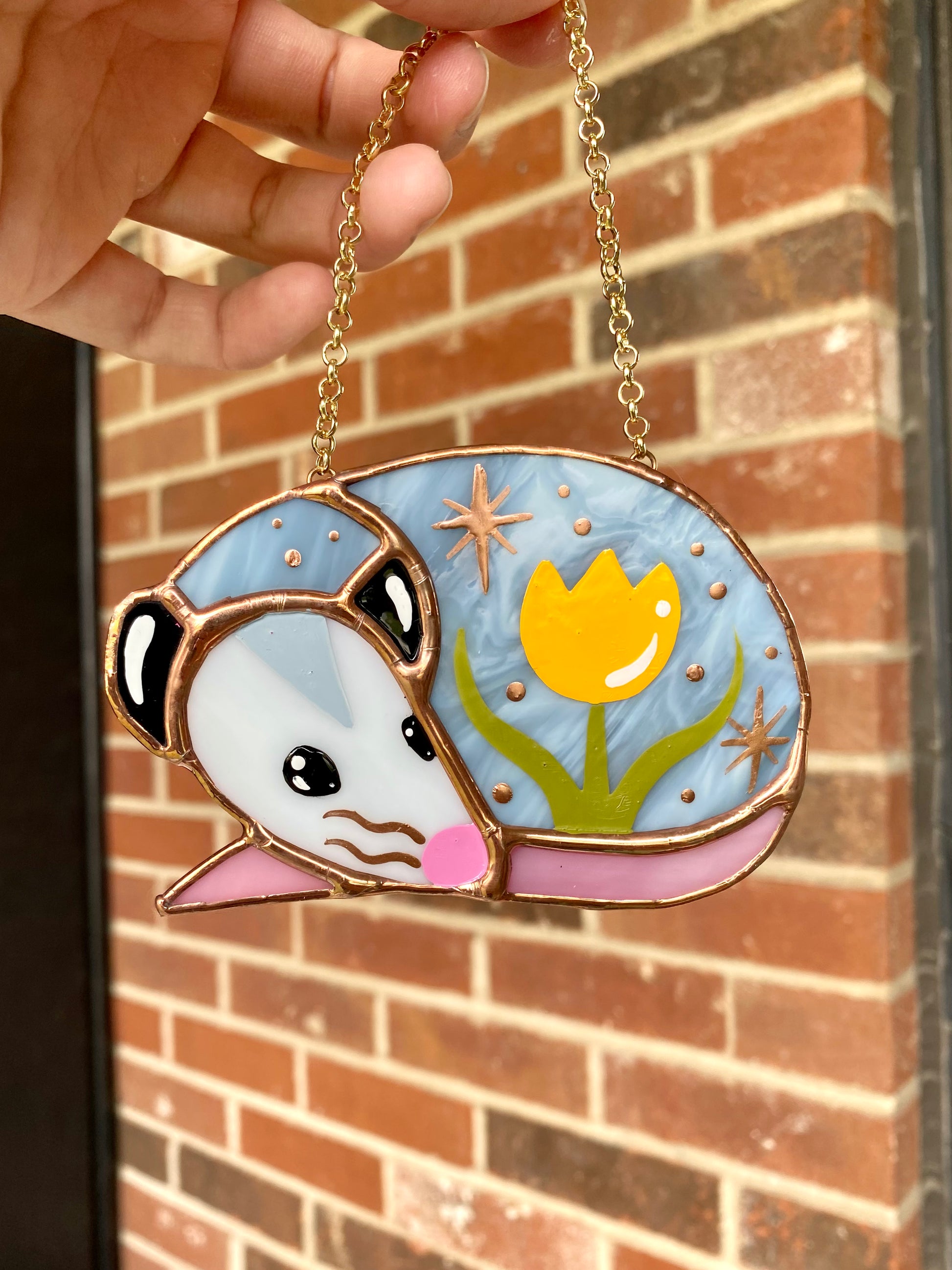 Sleepy Yellow Tulip Opossum Stained Glass Ornament