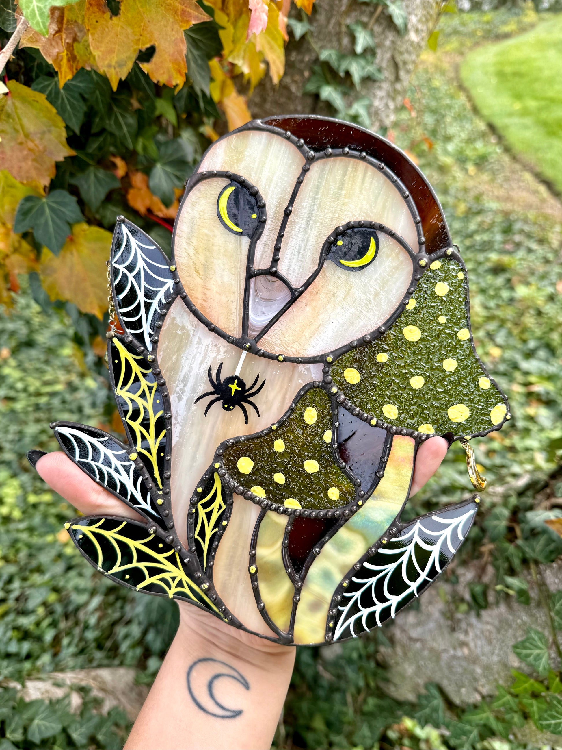 One of a kind! Measures approx 10” by 8”. Has beaded chain and screw in hook to hang her up! i used a green textured and iridescent glass for the mushrooms. Has a gold moon charm and an iridescent teardrop bead. Hand painted- one of one art piece.