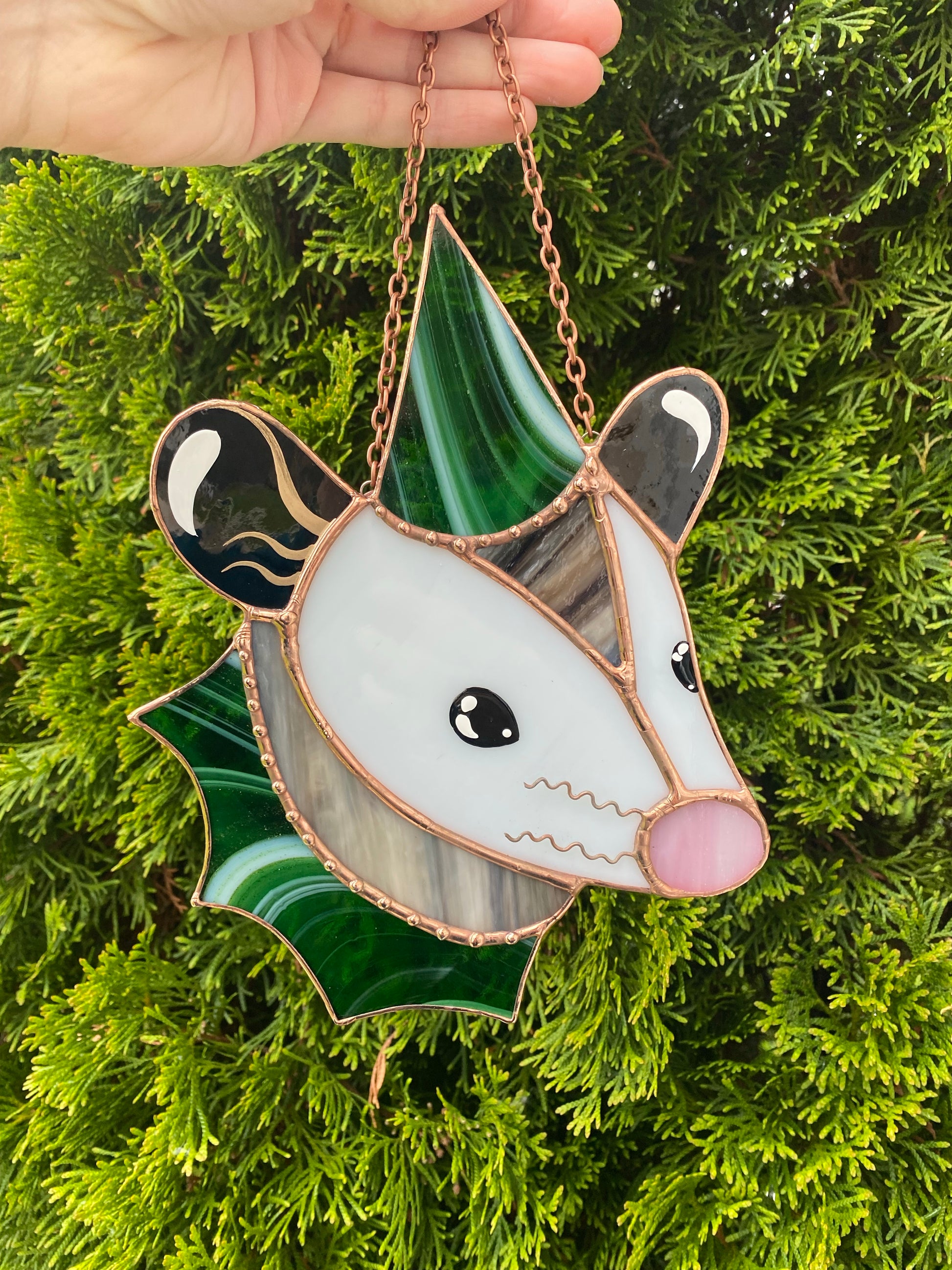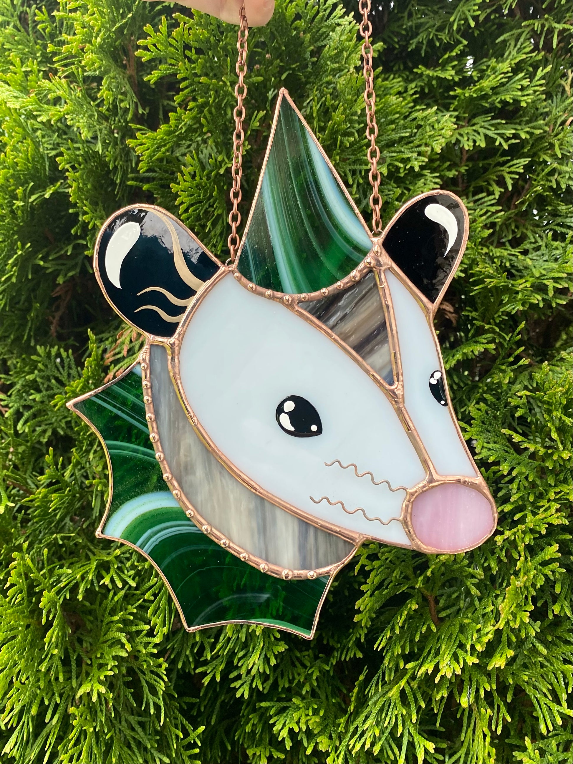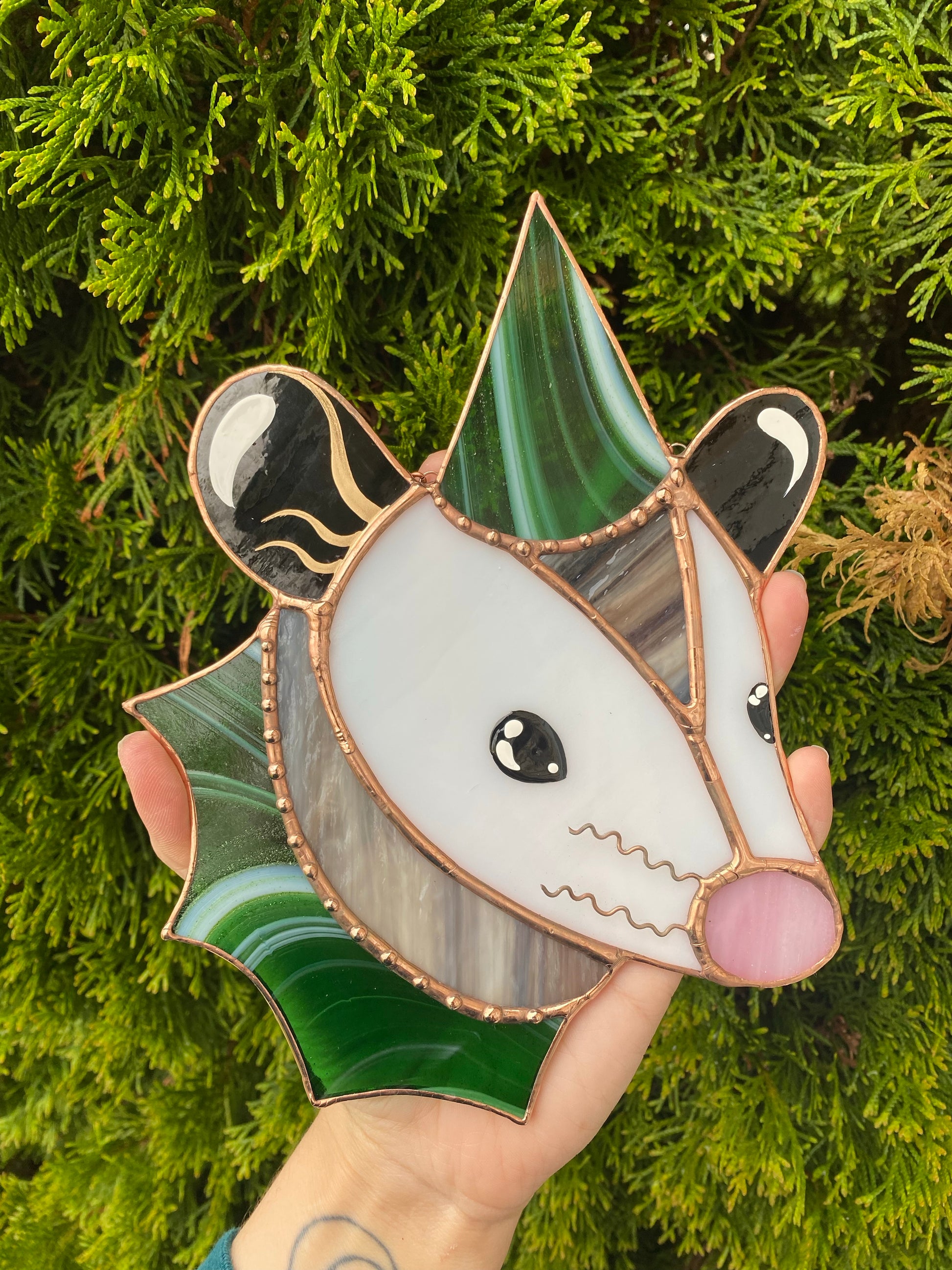 Swirly Green Aventurine Wizard Opossum Stained Glass Suncatcher