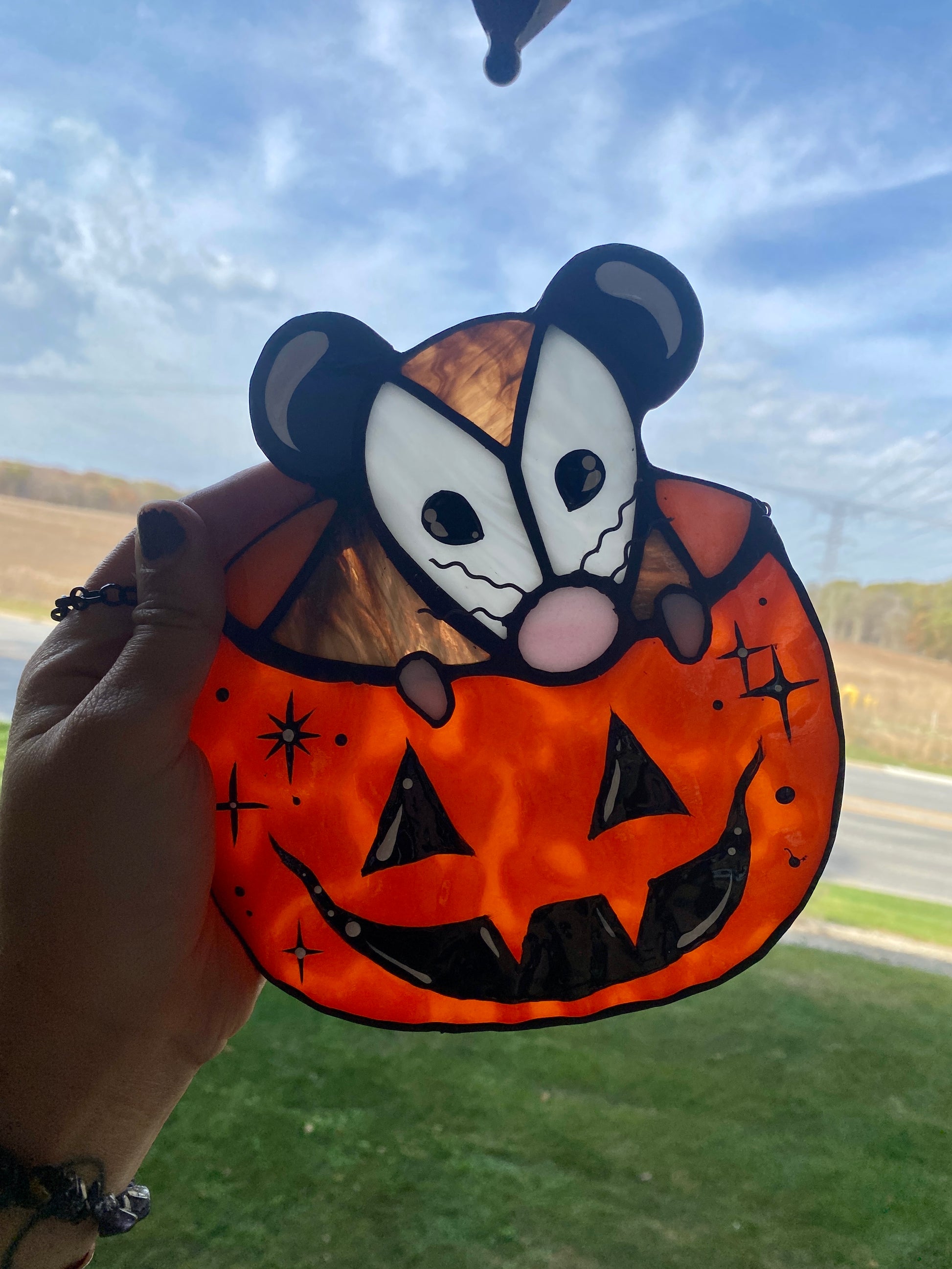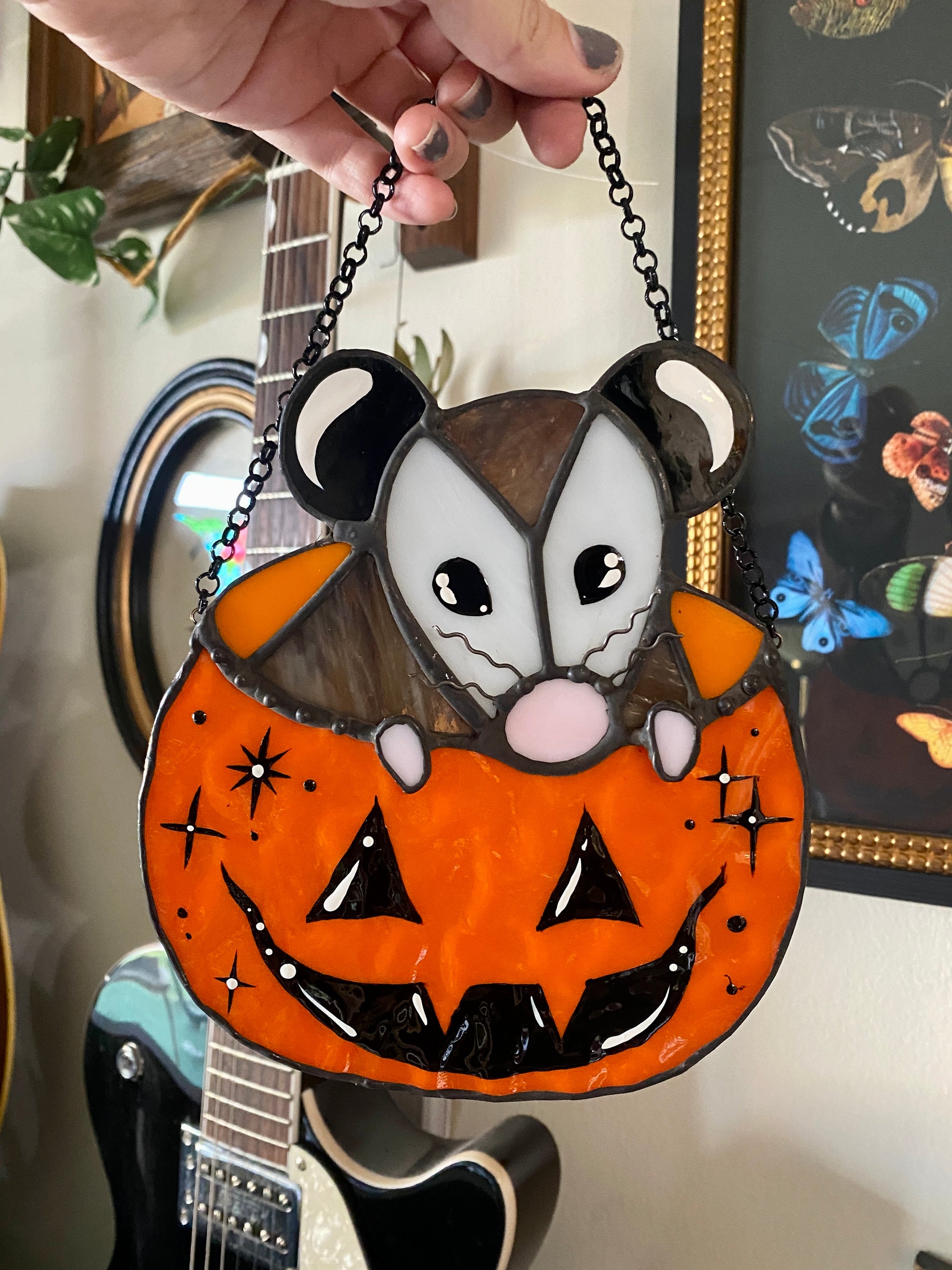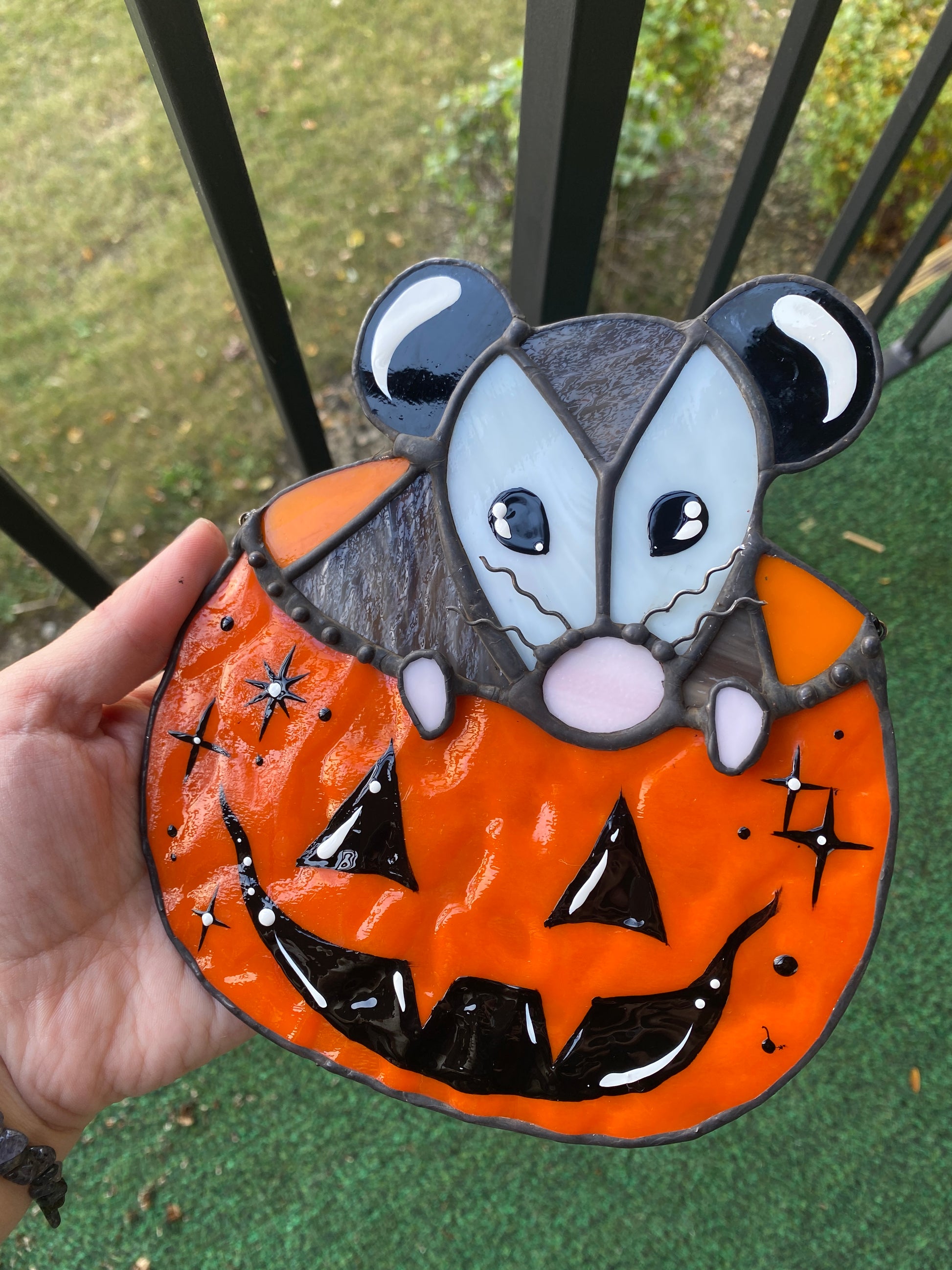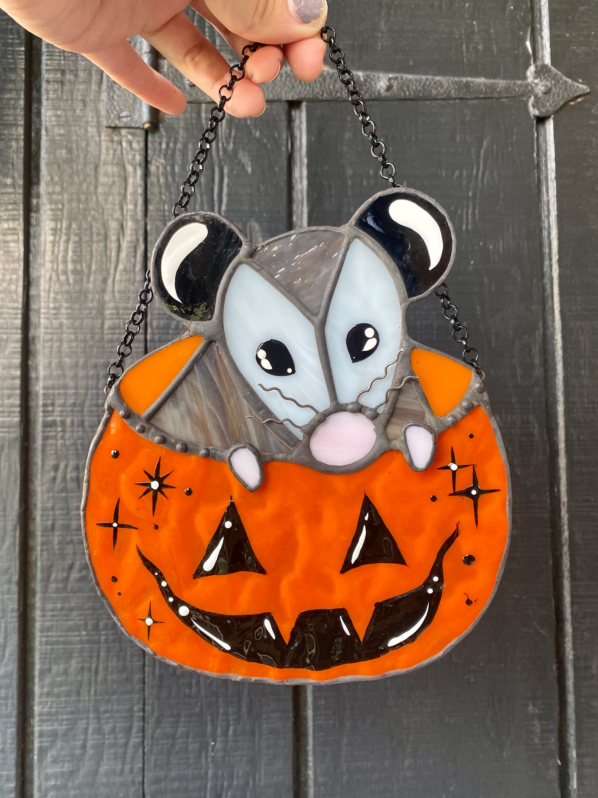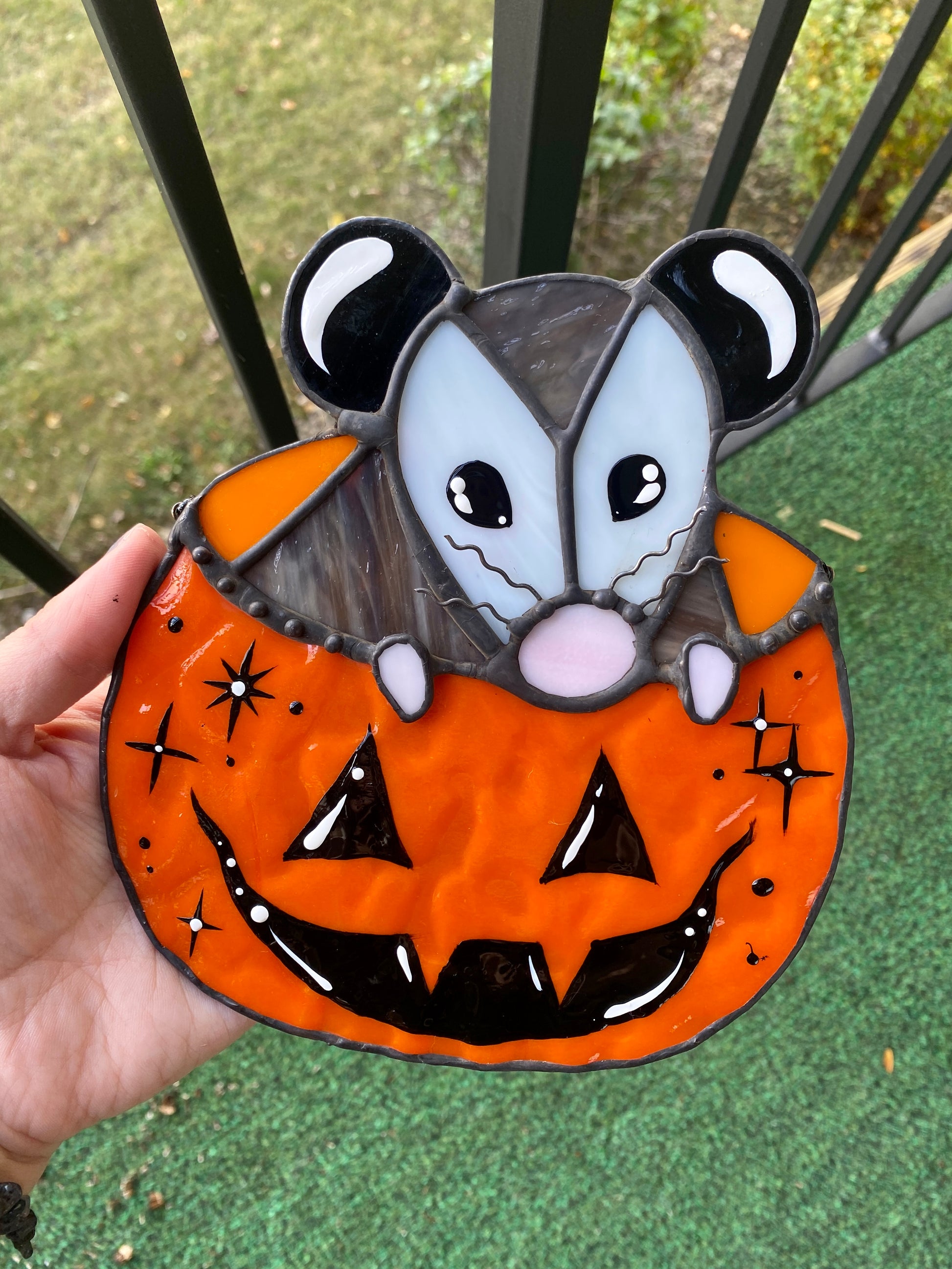 Trick-or-Treat Opossum Stained Glass Suncatcher