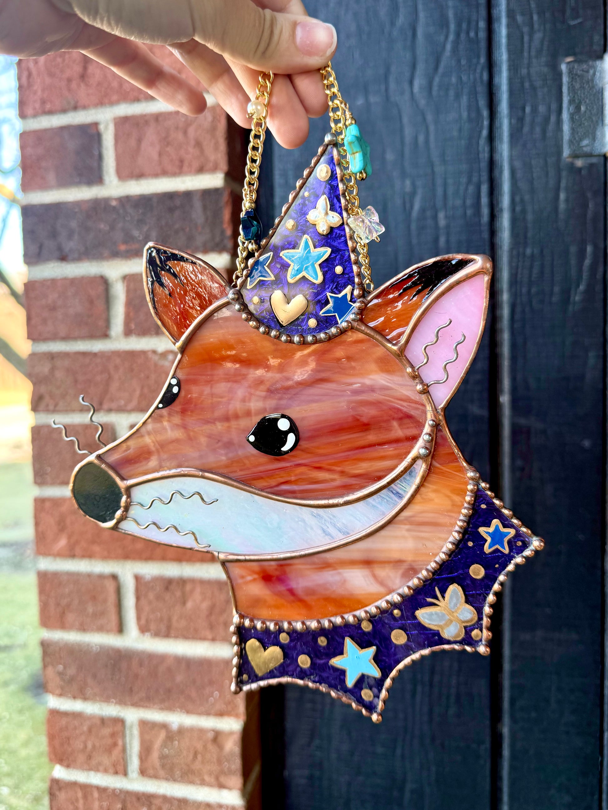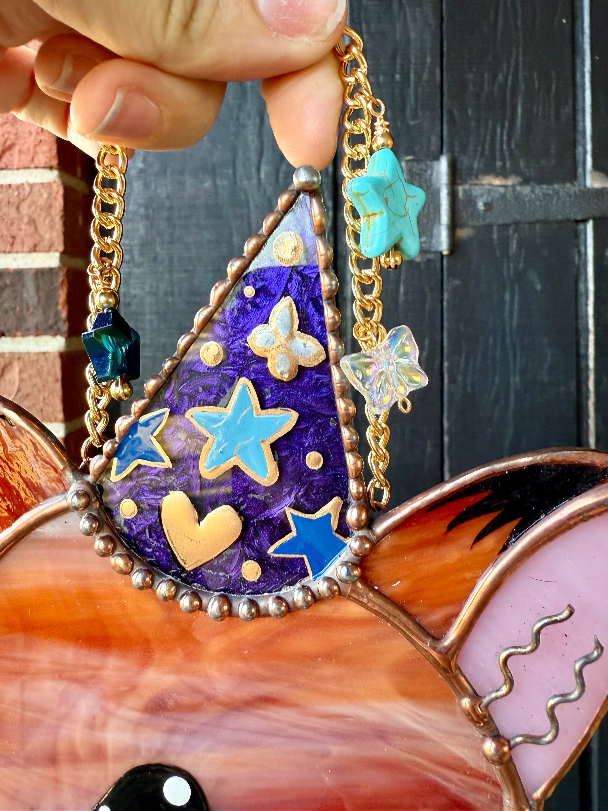 Measures approx 9” by 7”. Details painted with enamel on purple/blue shift glass. Matching charms on the chain and wire for the whiskers!