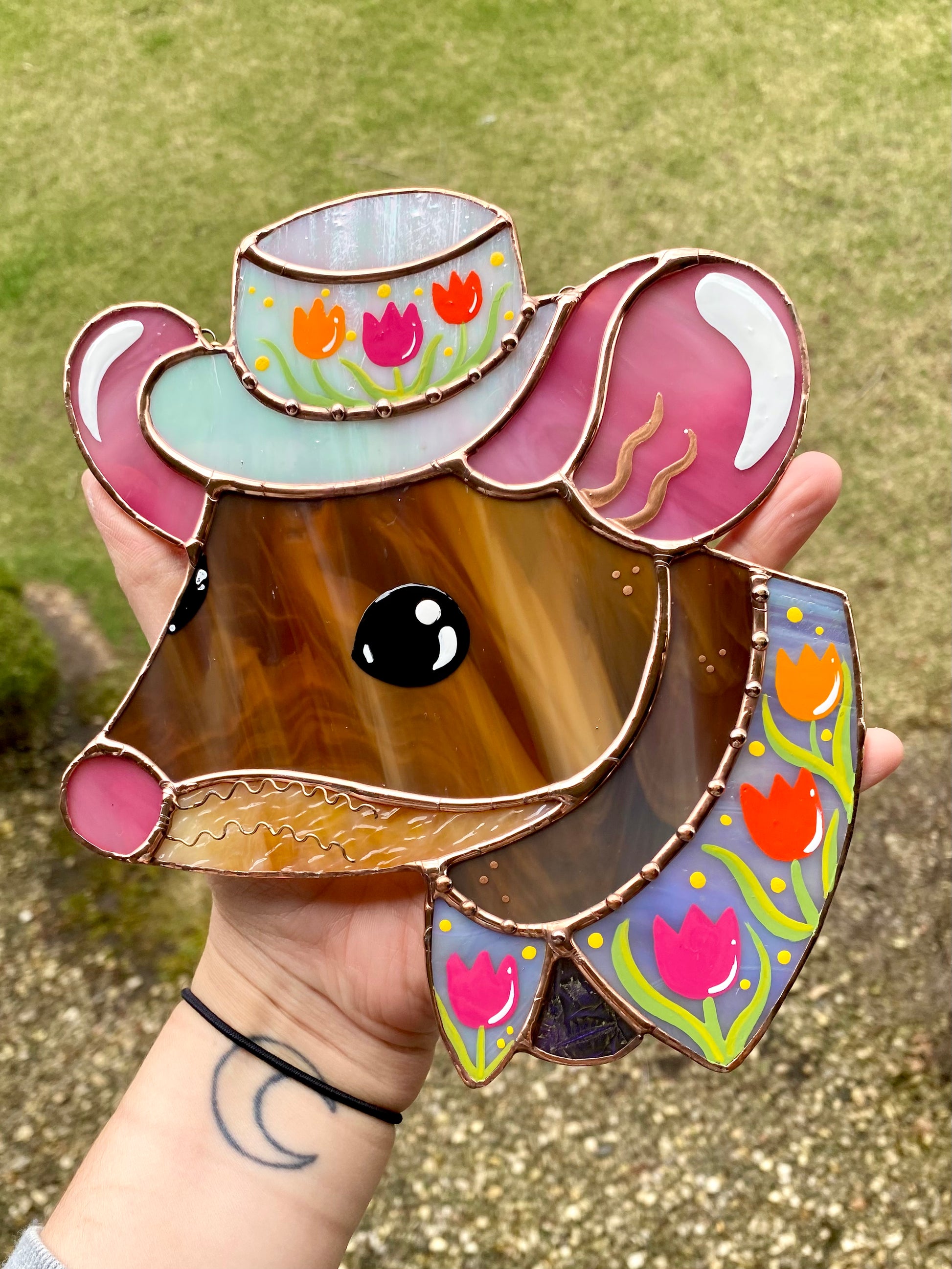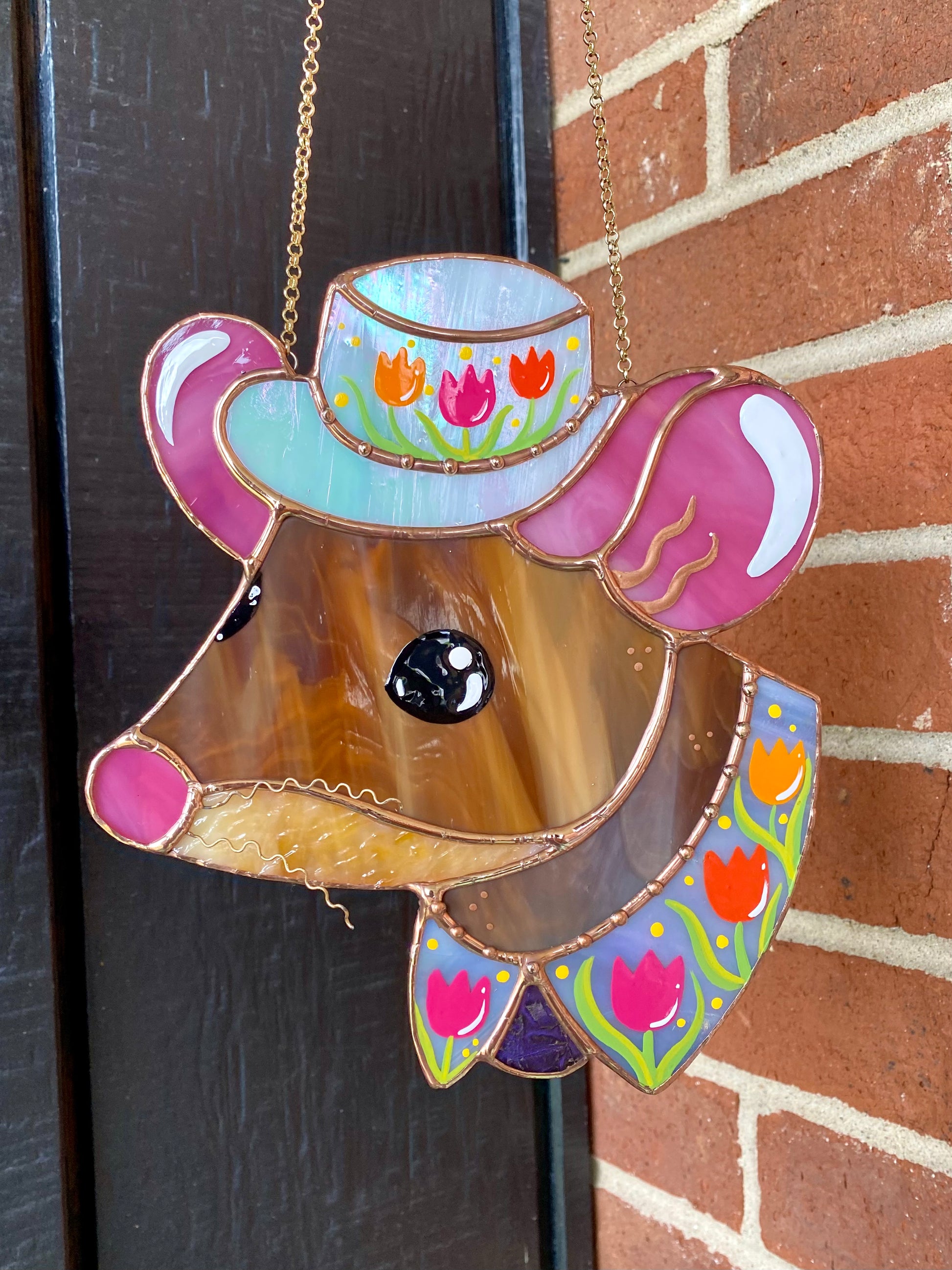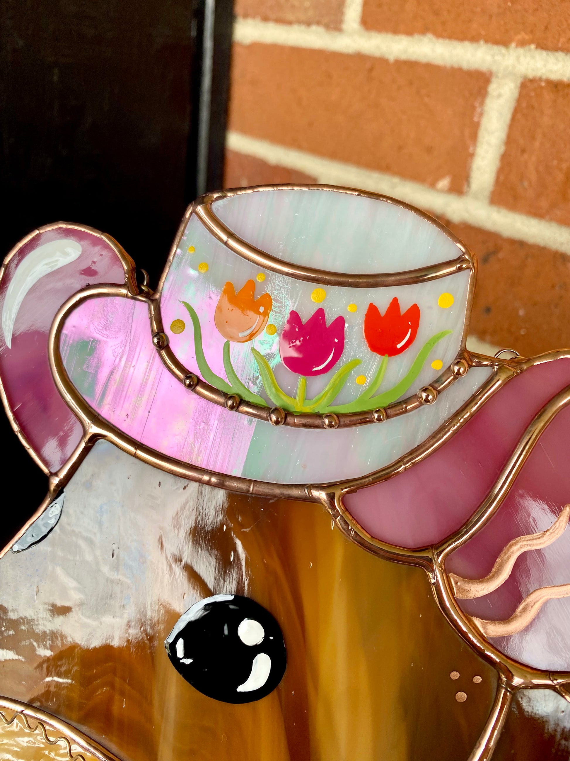 Measures 8” tall and 7.4” wide. Hat and bandana made with iridescent glass. Has a gold chain and screw-in hook to hang her up wherever you please!
