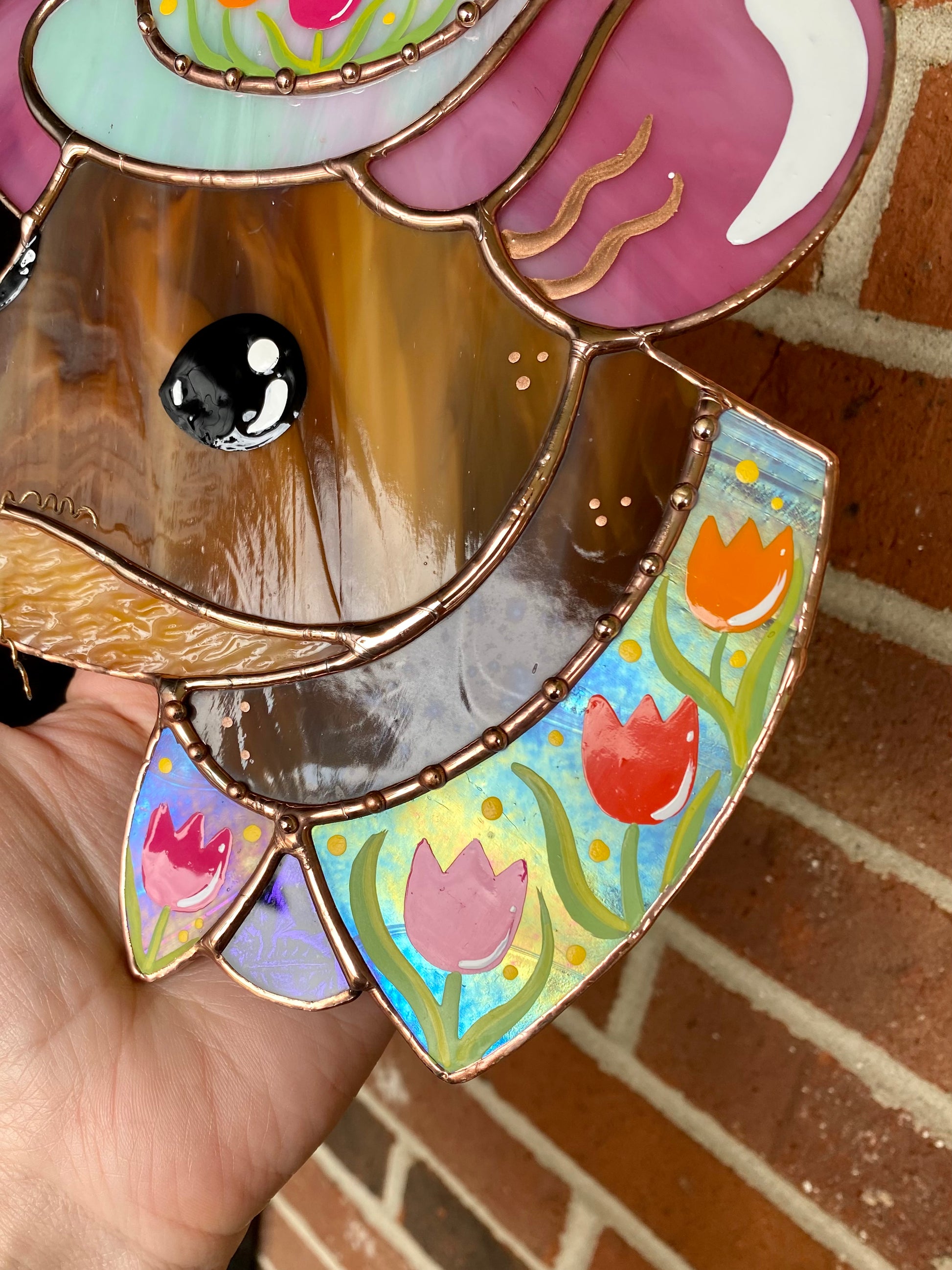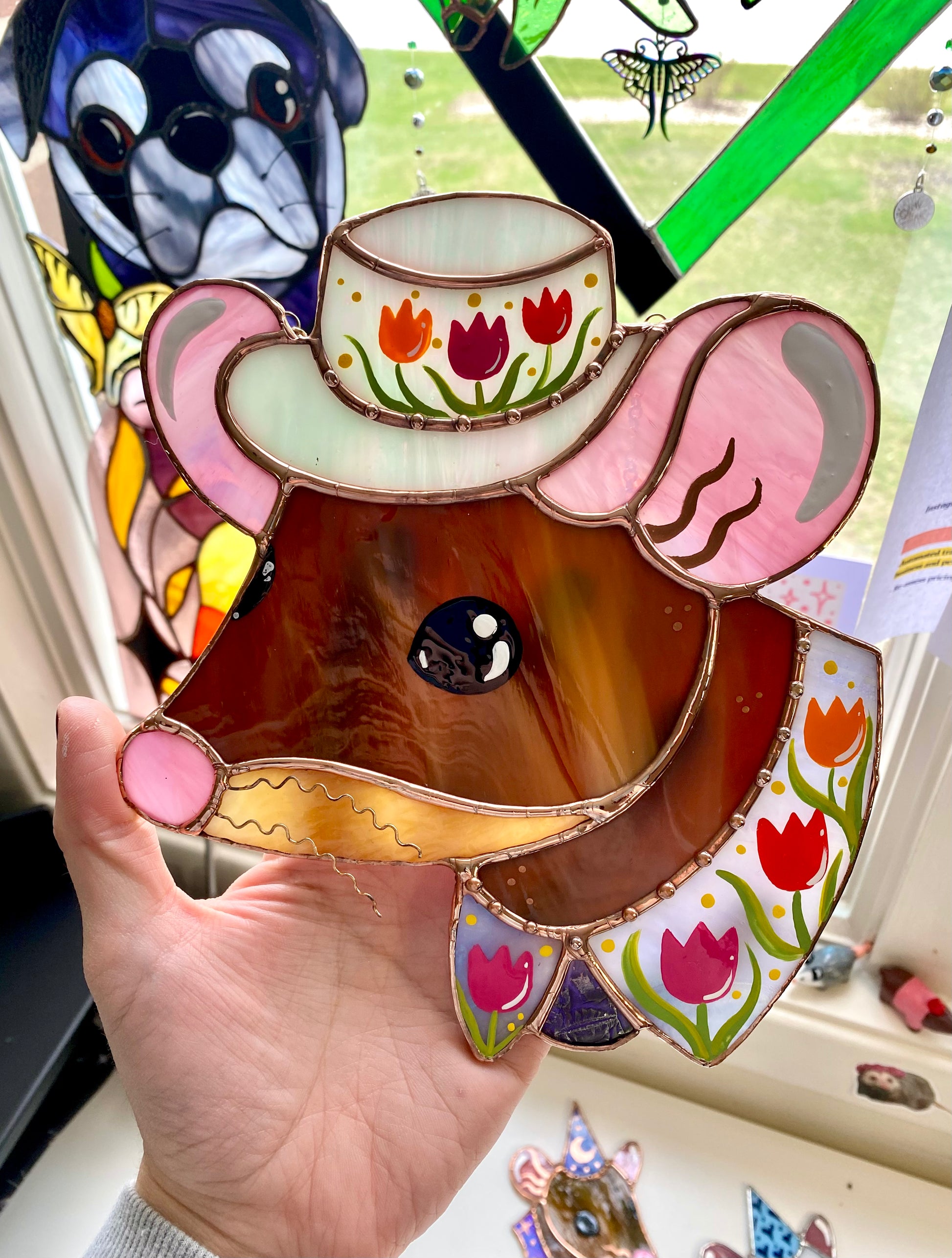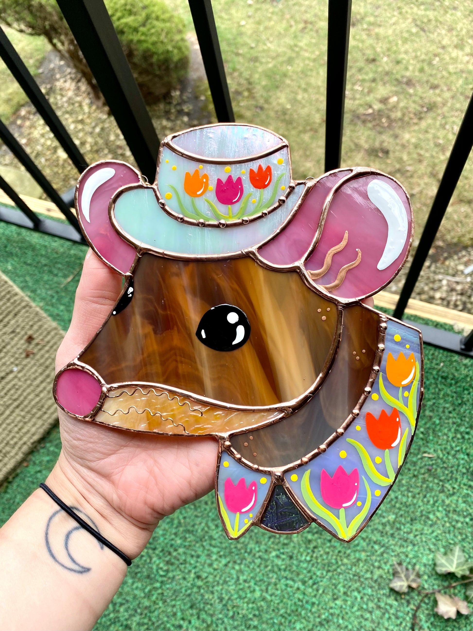 Measures 8” tall and 7.4” wide. Hat and bandana made with iridescent glass. Has a gold chain and screw-in hook to hang her up wherever you please!