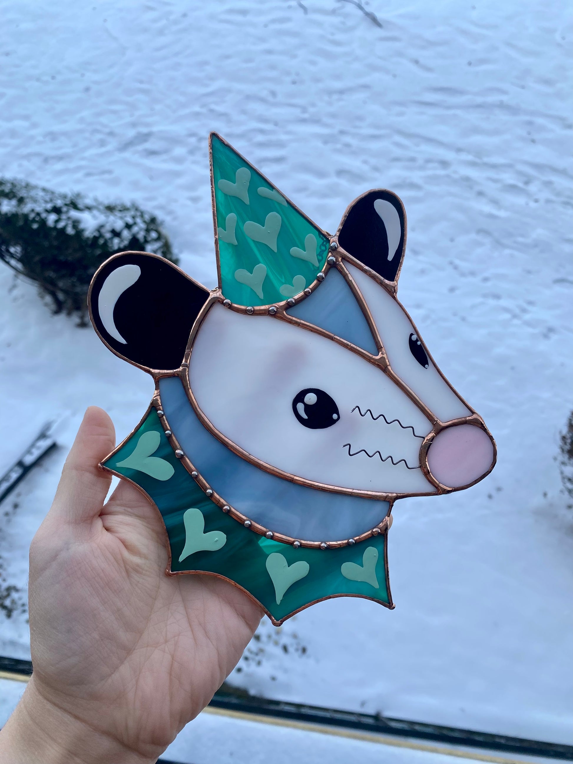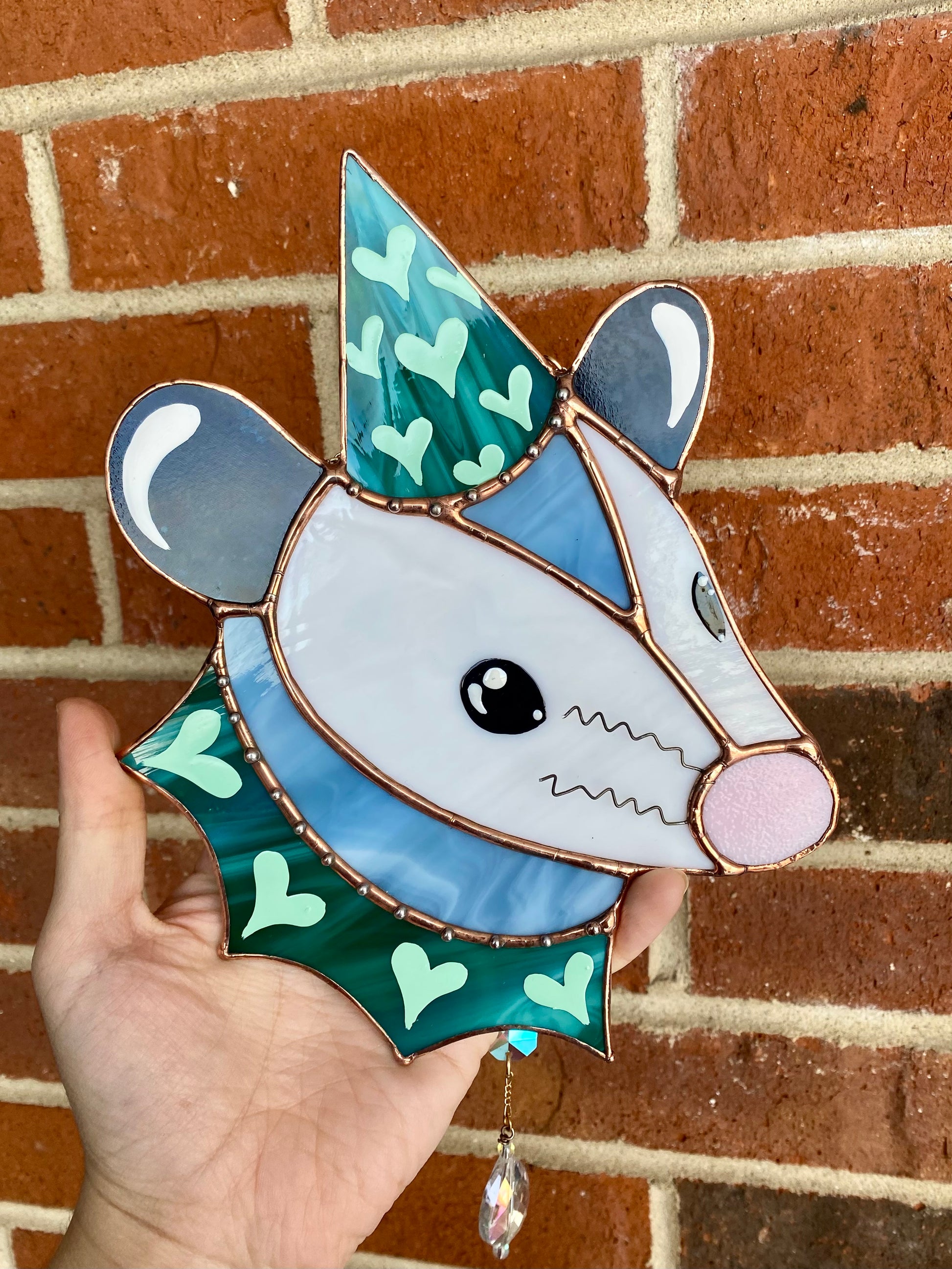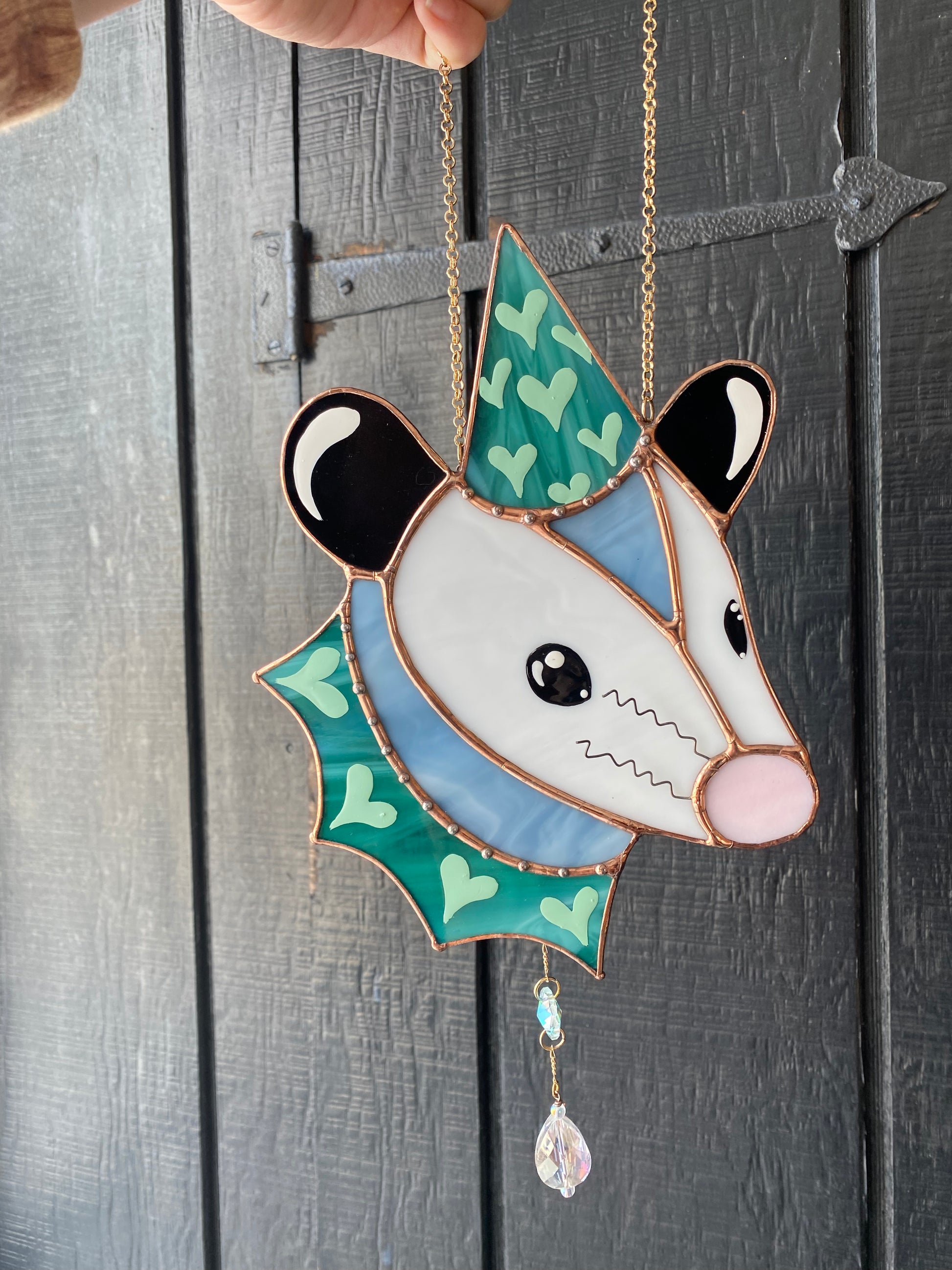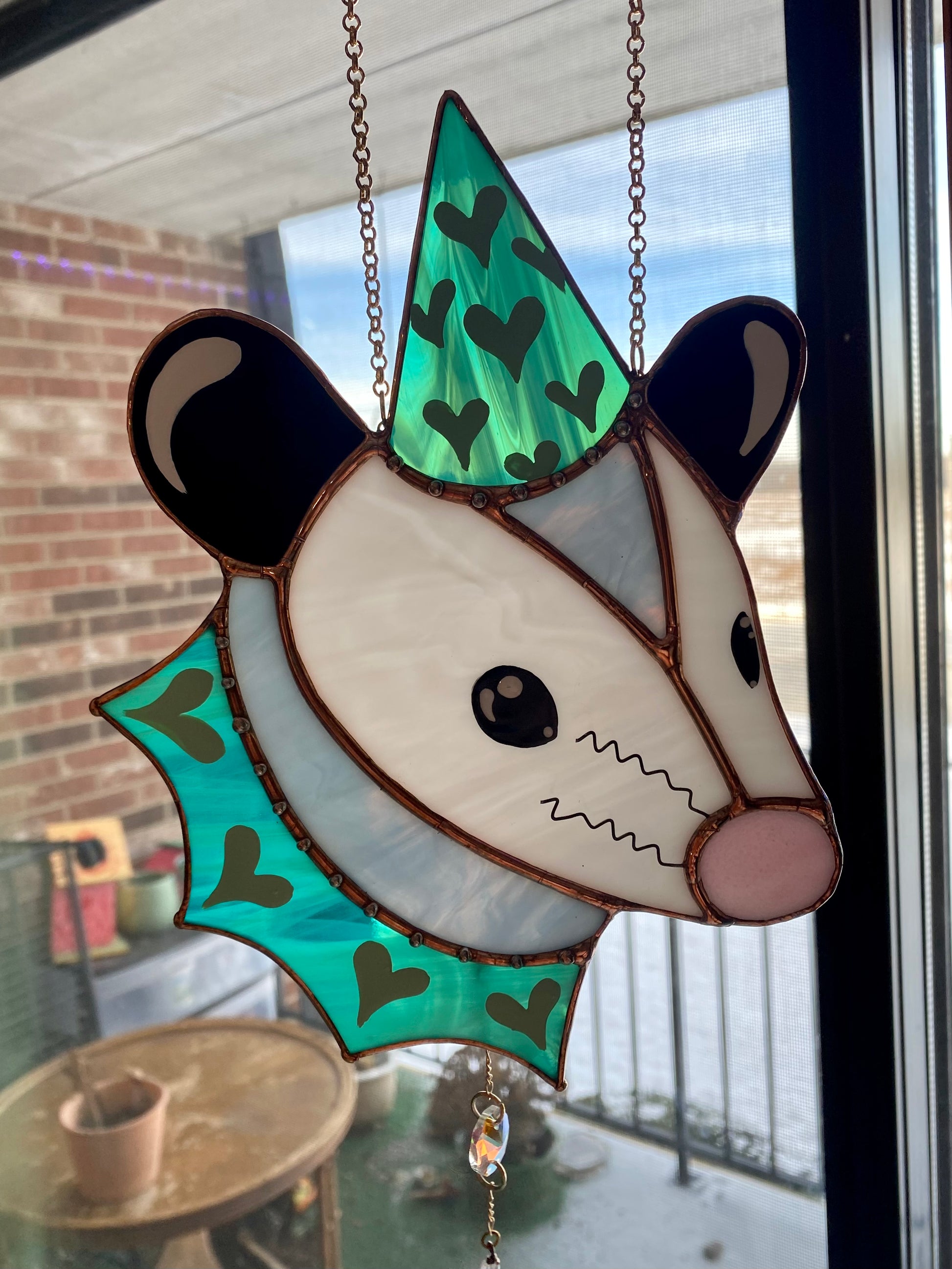 Measures 8.5” tall and 6” wide. Suncatcher beads on his collar reflect sunlight into rainbows! Has a gold chain and screw-in hook to hang him up wherever you please!