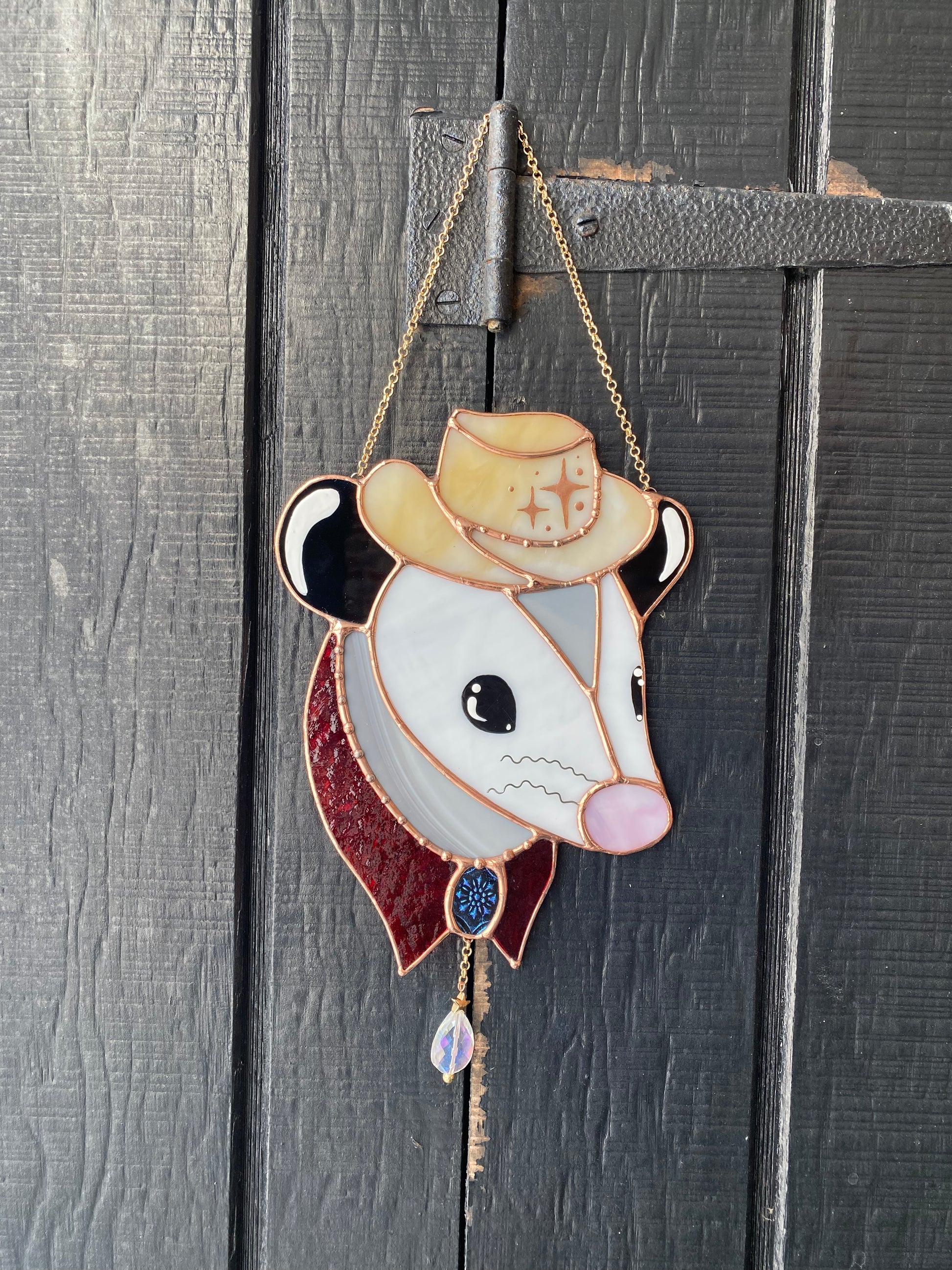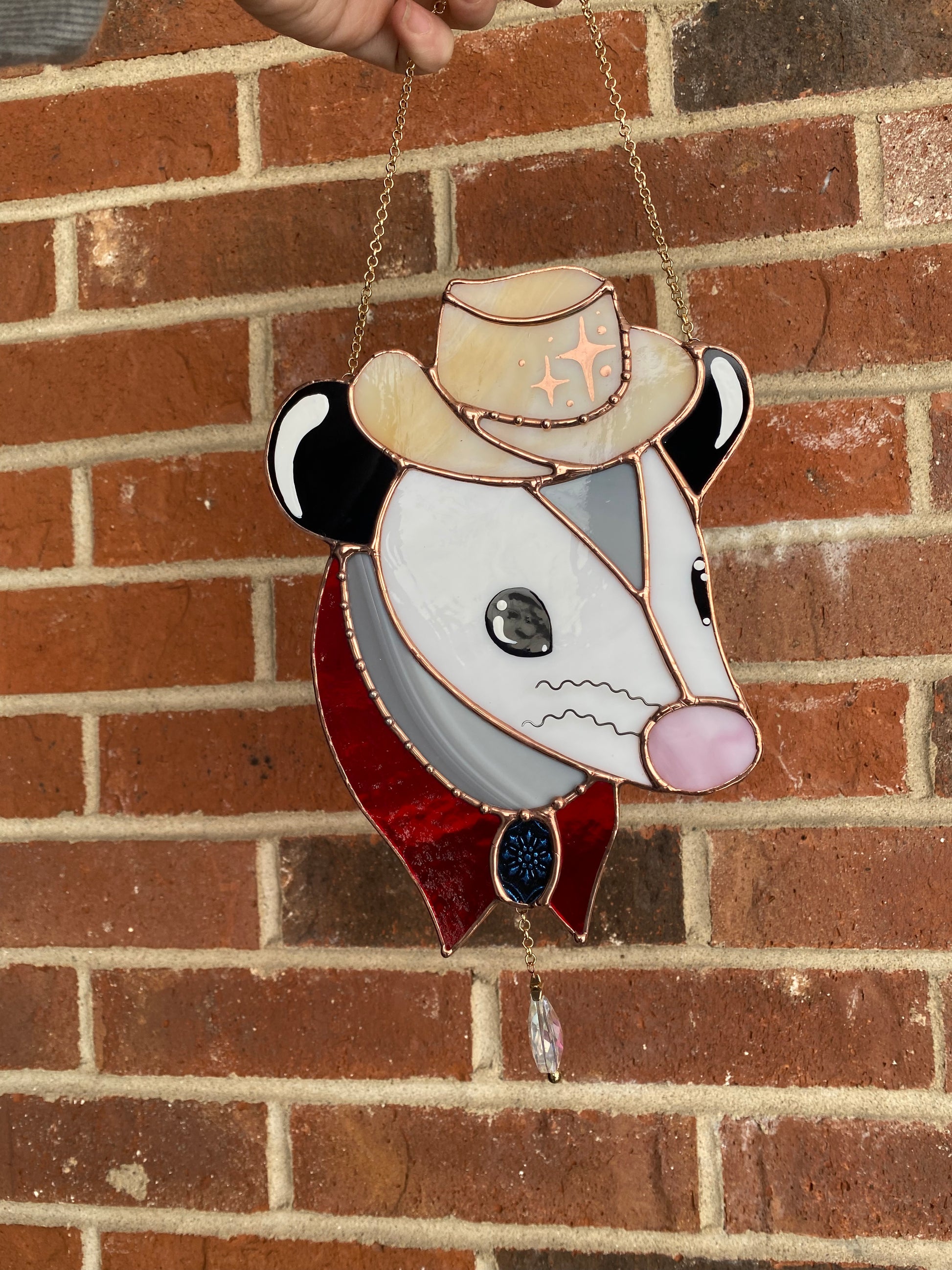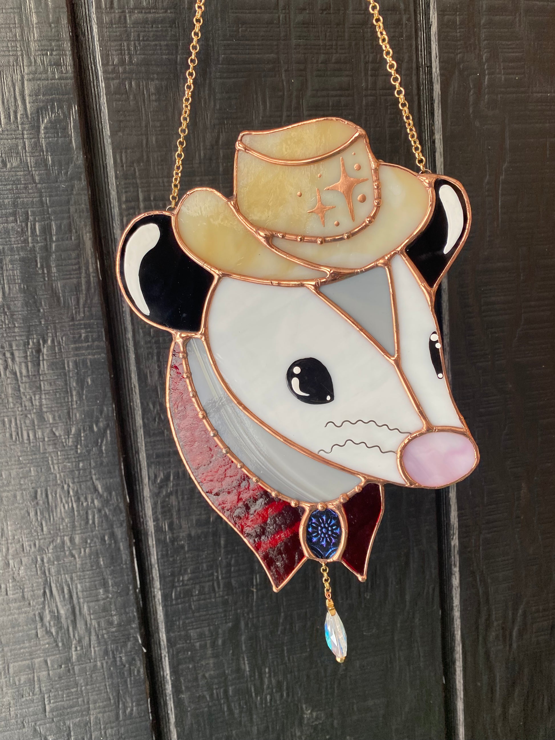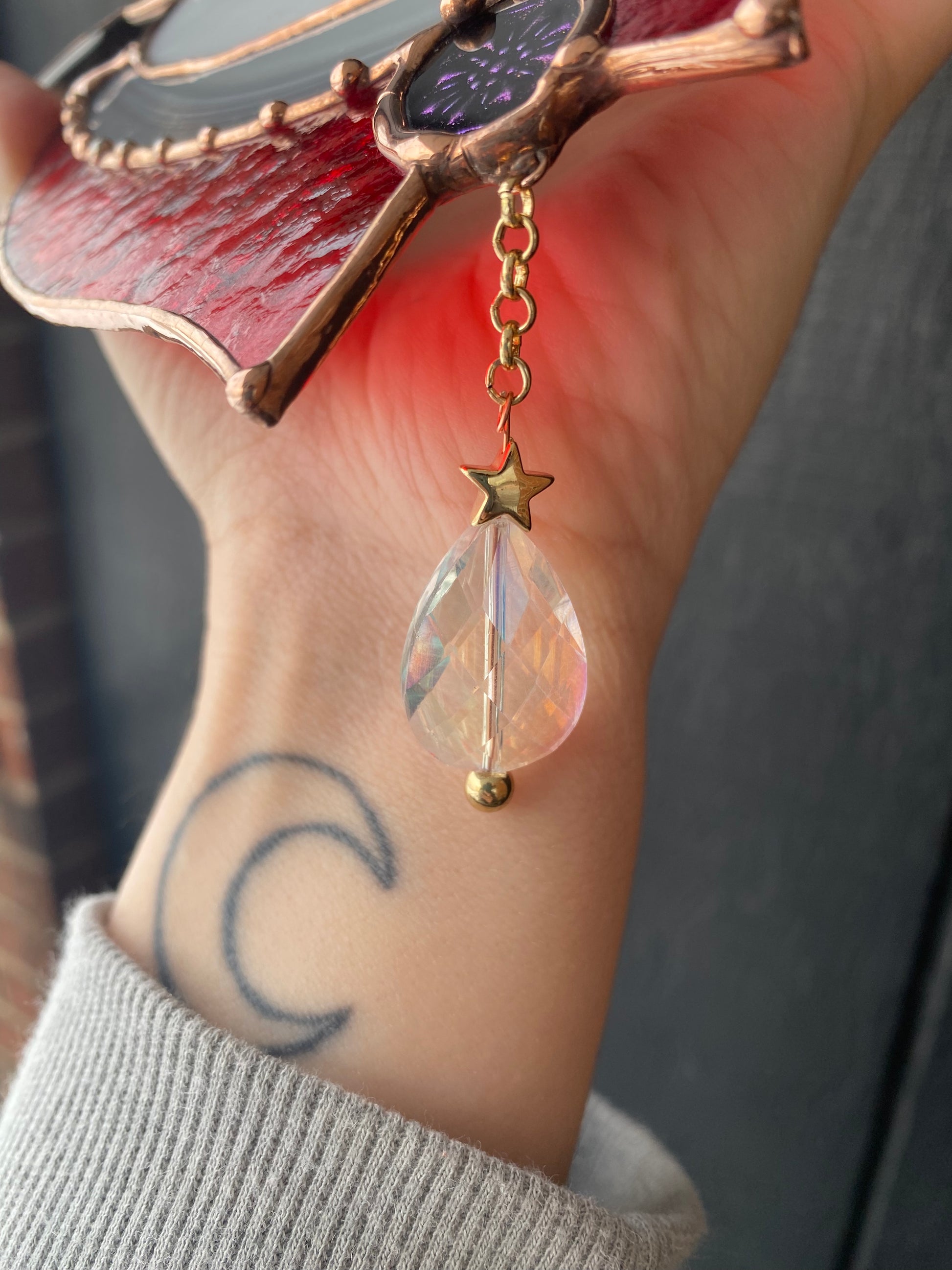 Measures 8.5” tall and 6” wide. Suncatcher beads on his collar reflect sunlight into rainbows! Has a gold chain and screw-in hook to hang him up wherever you please!