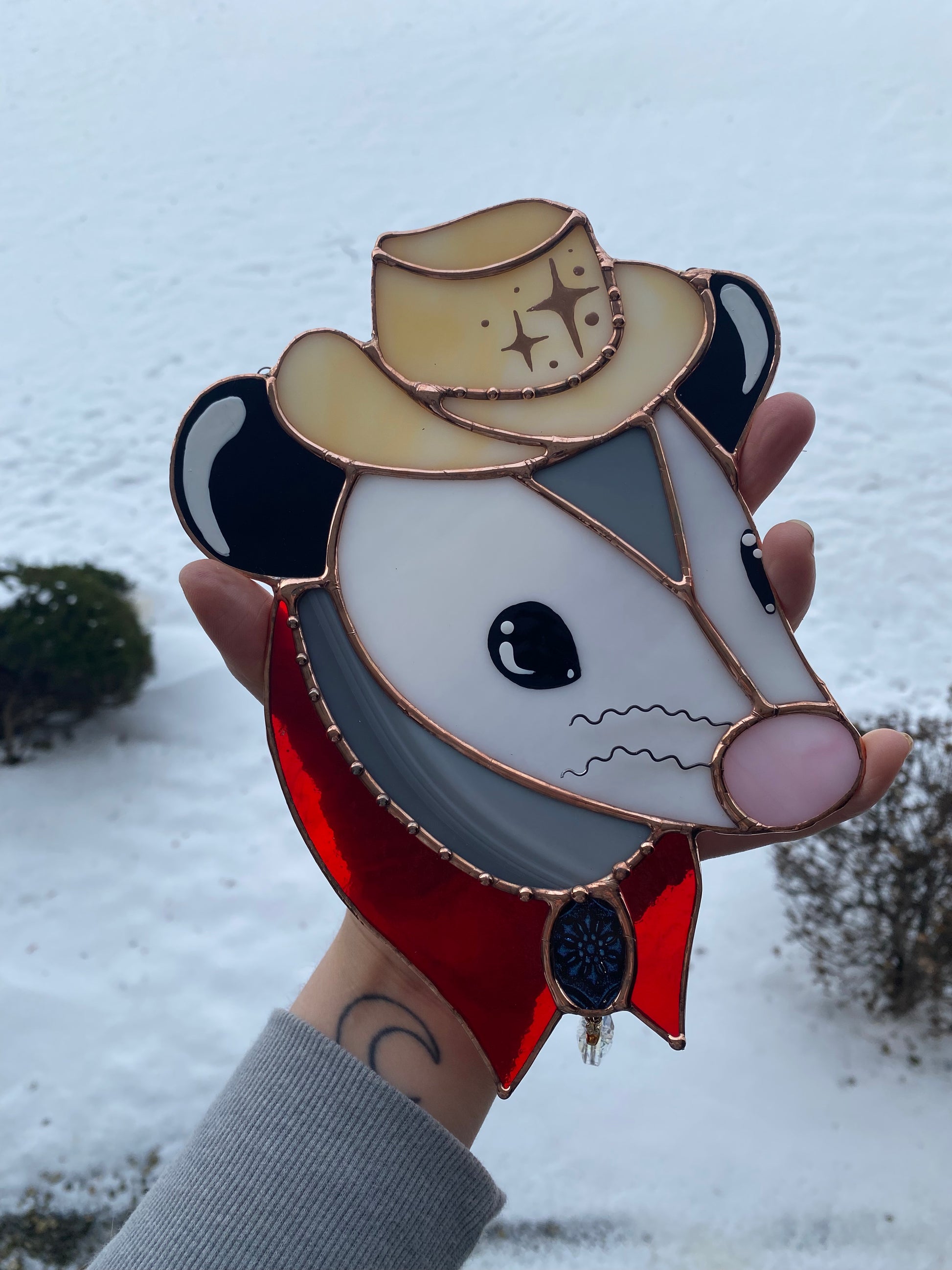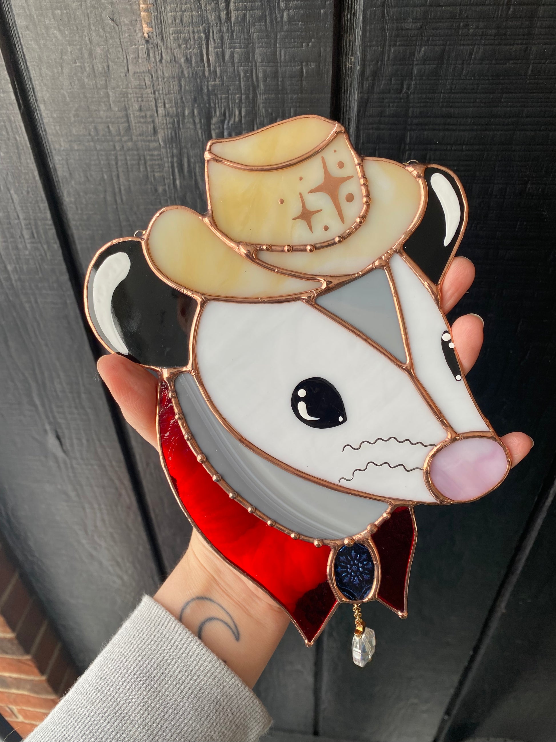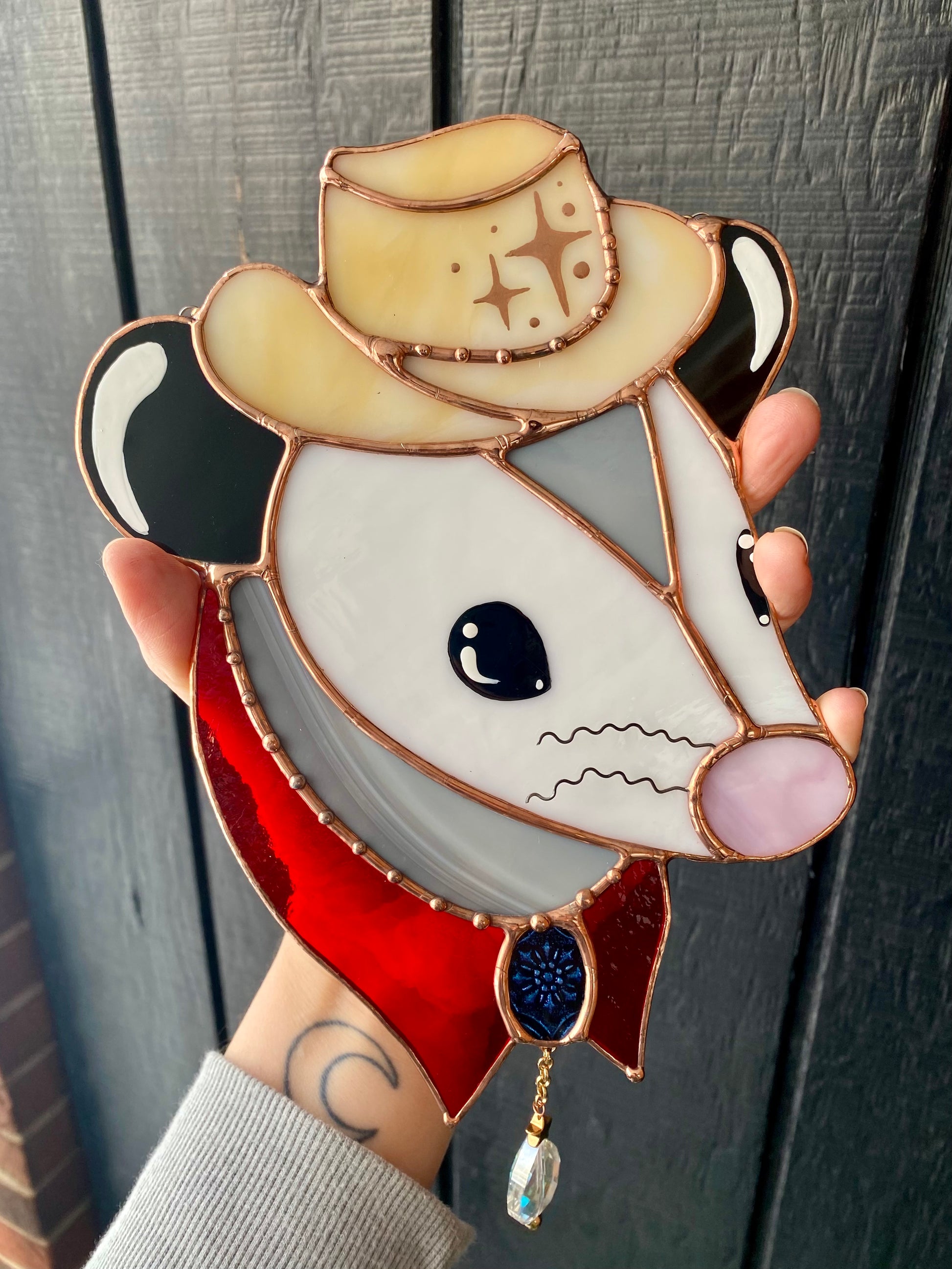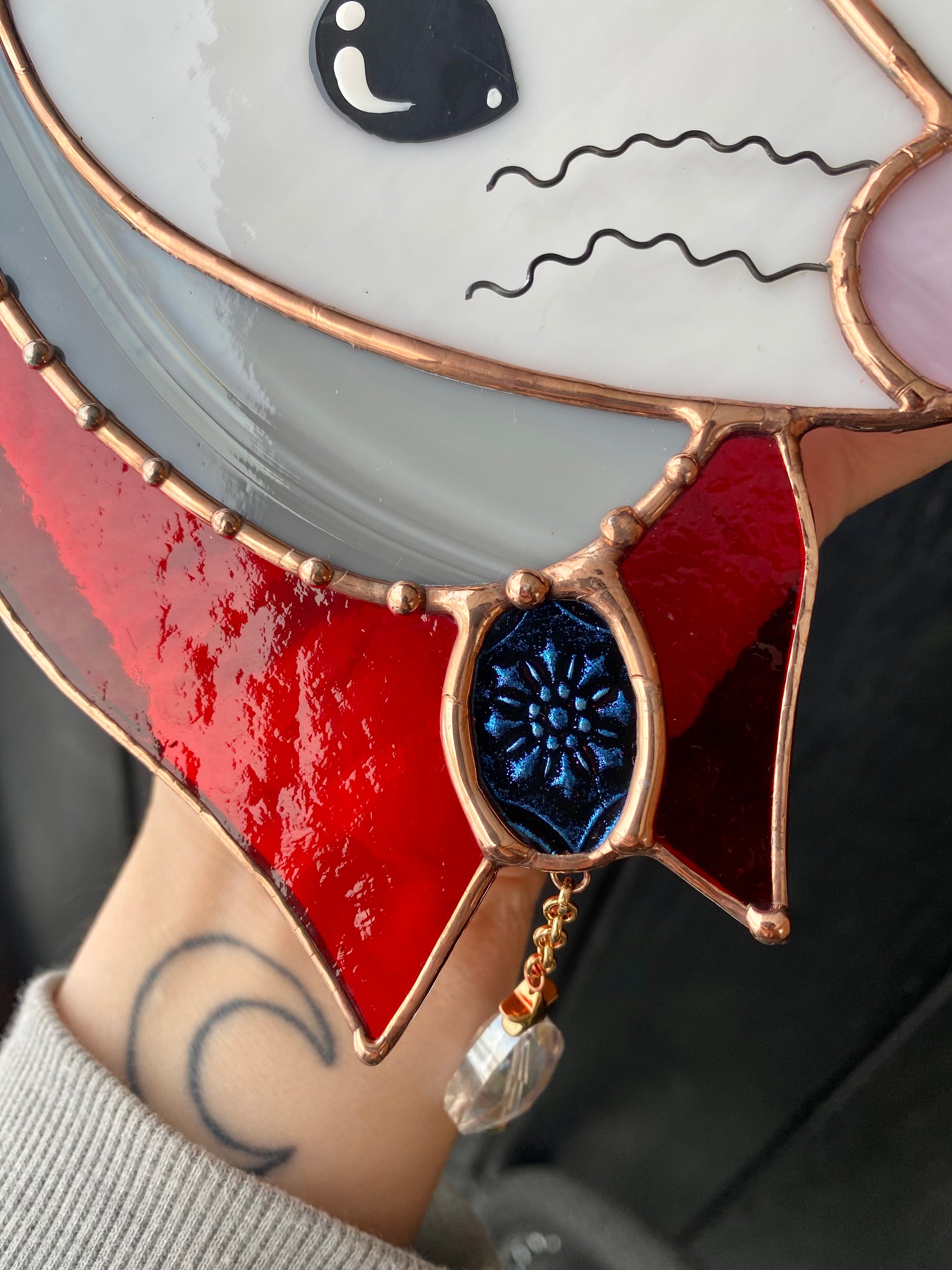Measures 8.5” tall and 6” wide. Suncatcher beads on his collar reflect sunlight into rainbows! Has a gold chain and screw-in hook to hang him up wherever you please!