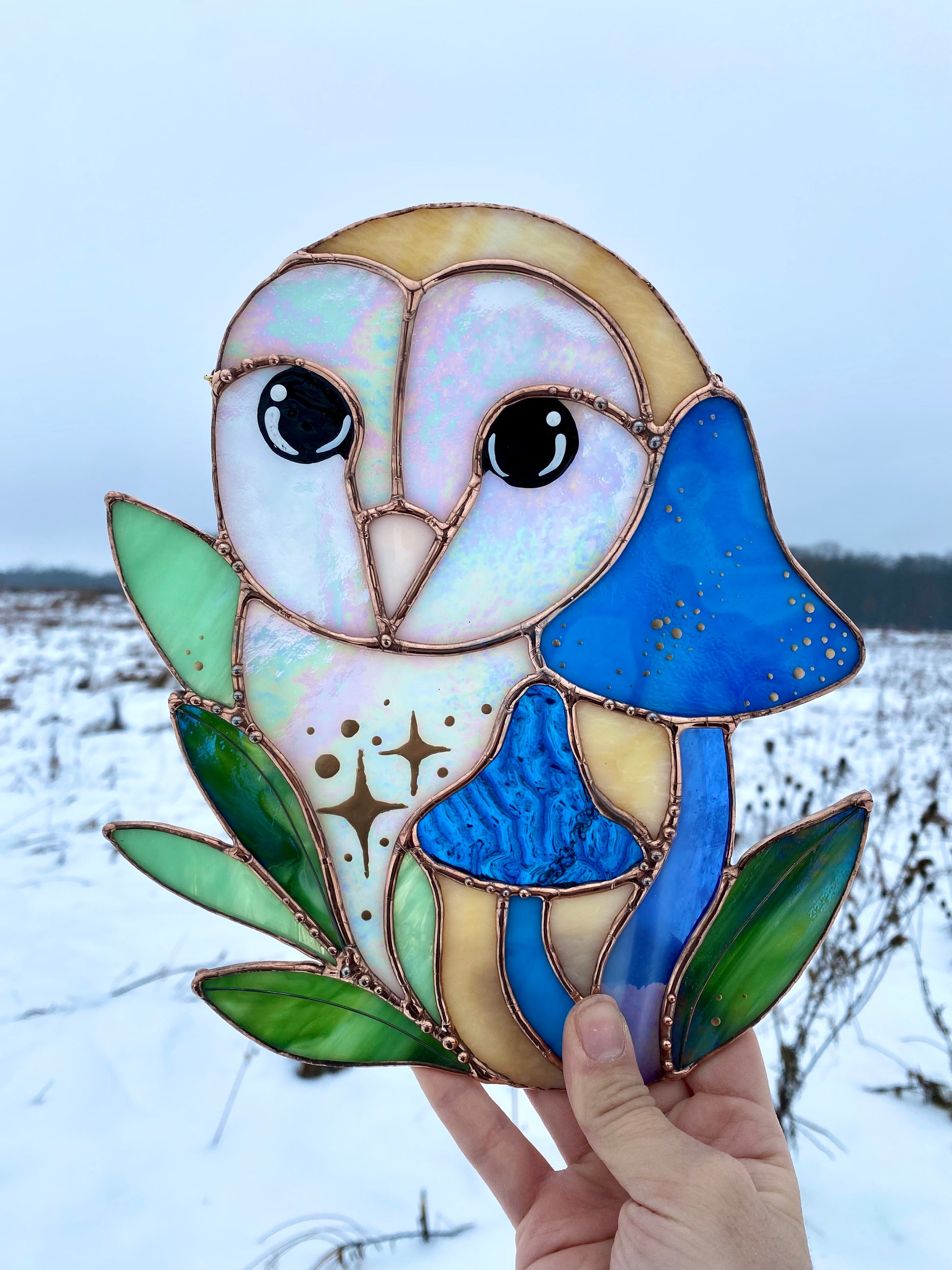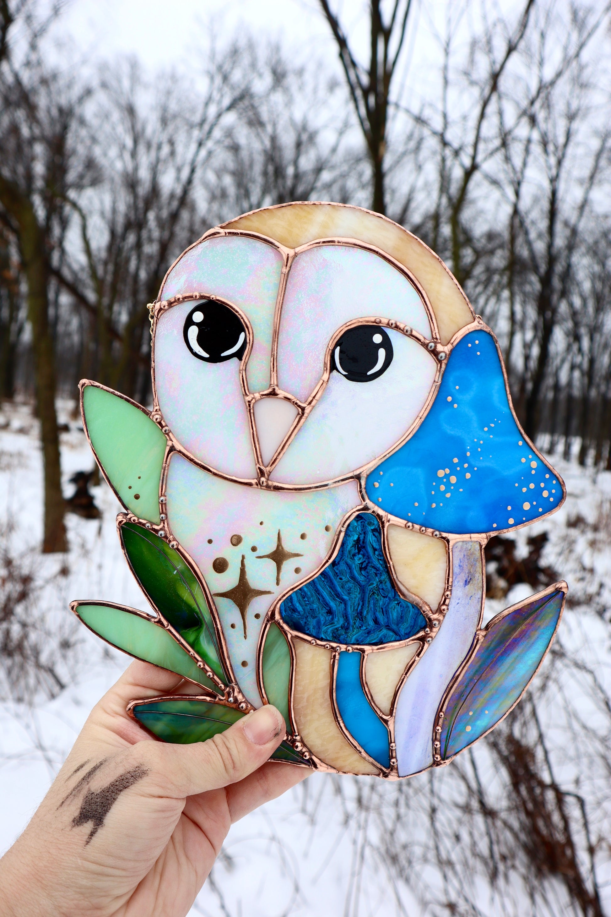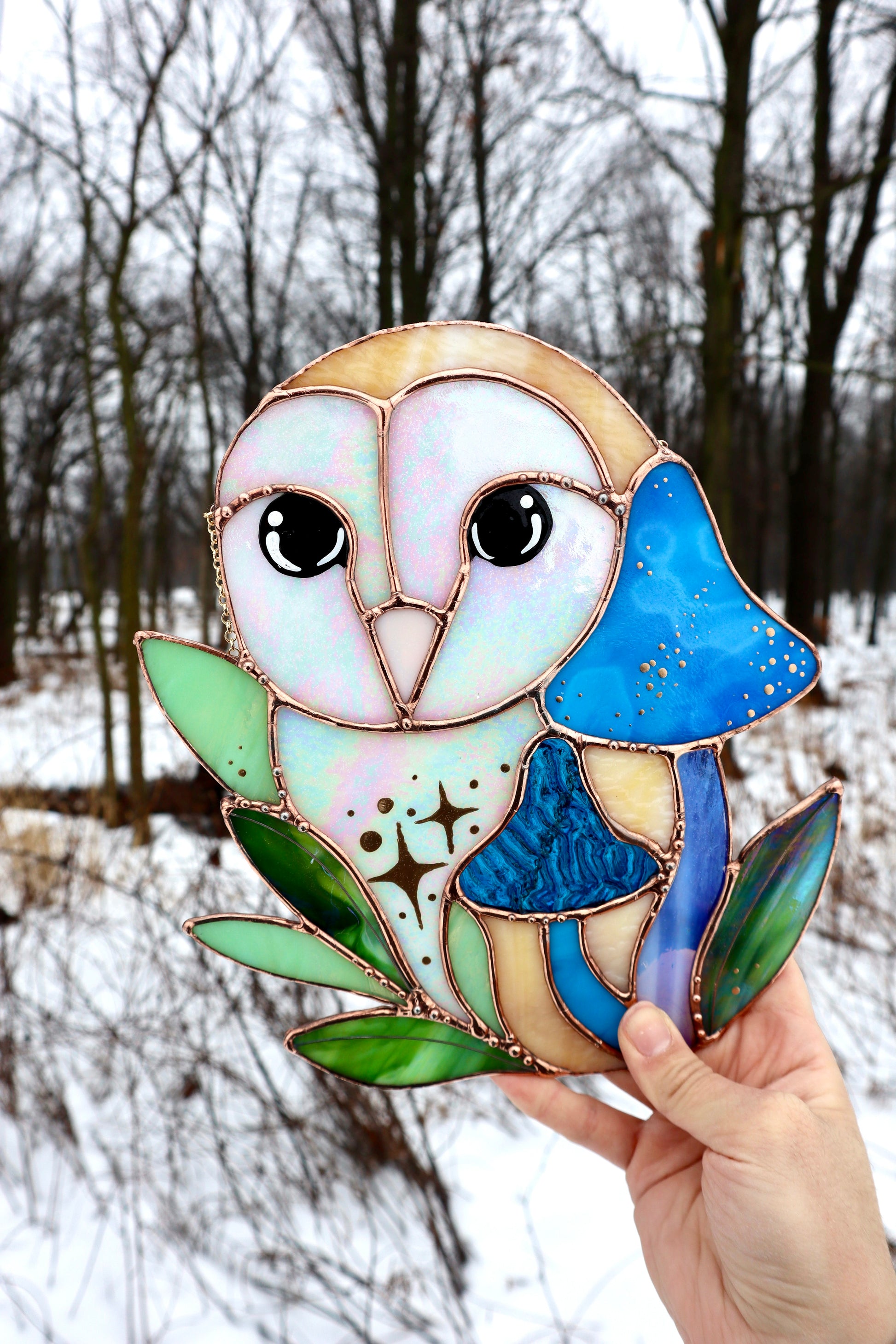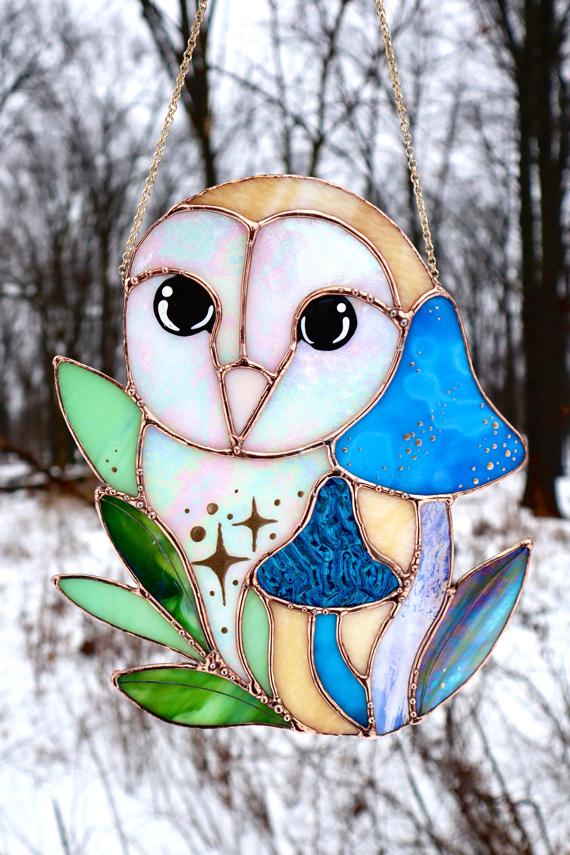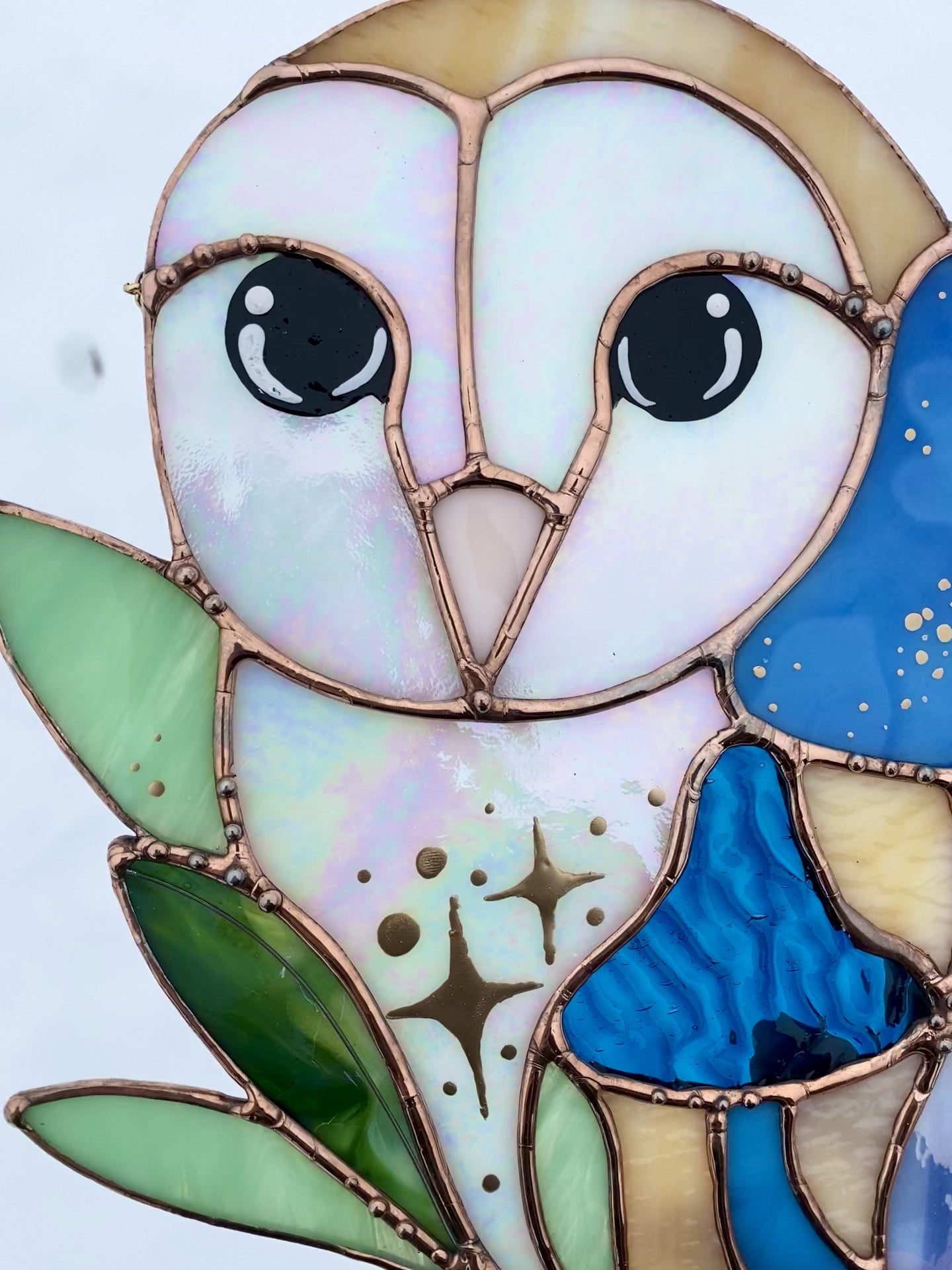 Blue Barn Owl Large Stained Glass Suncatcher