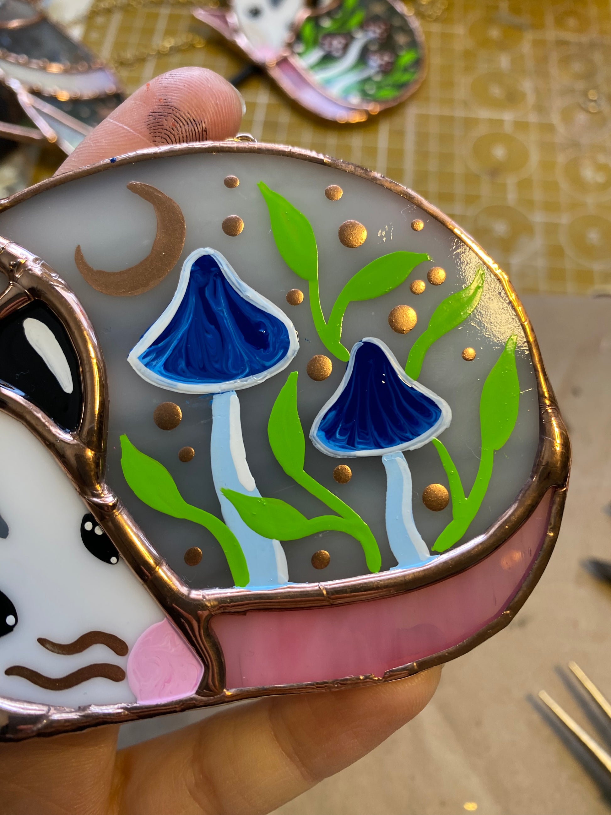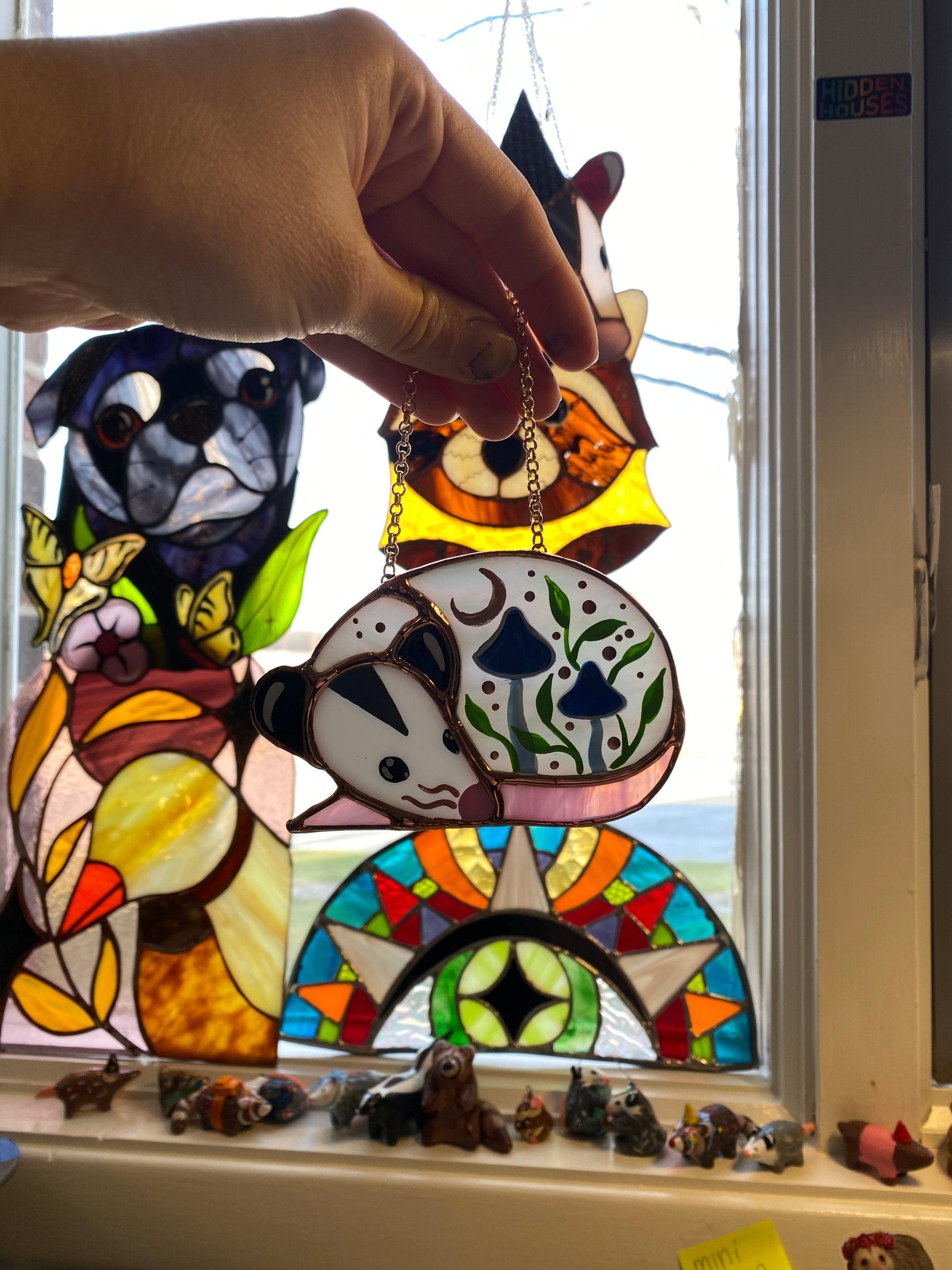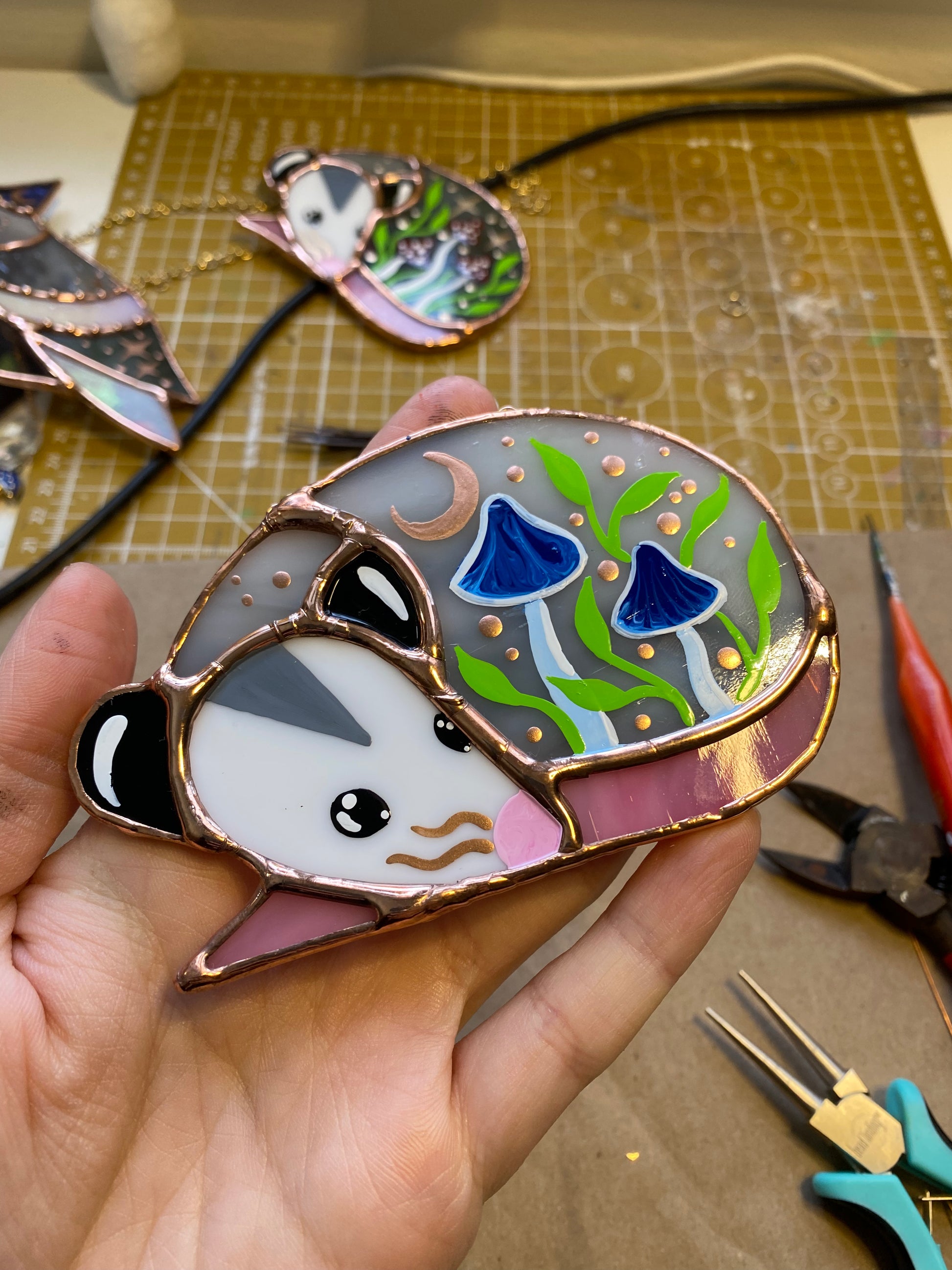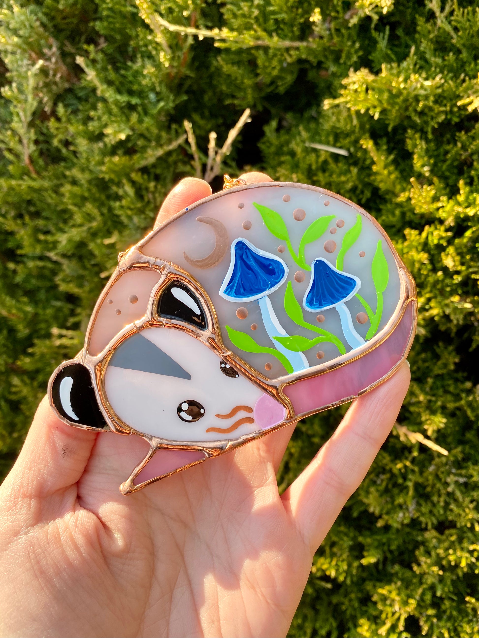 Mini Blue Mushroom Sleepy Opossum Stained Glass Suncatcher